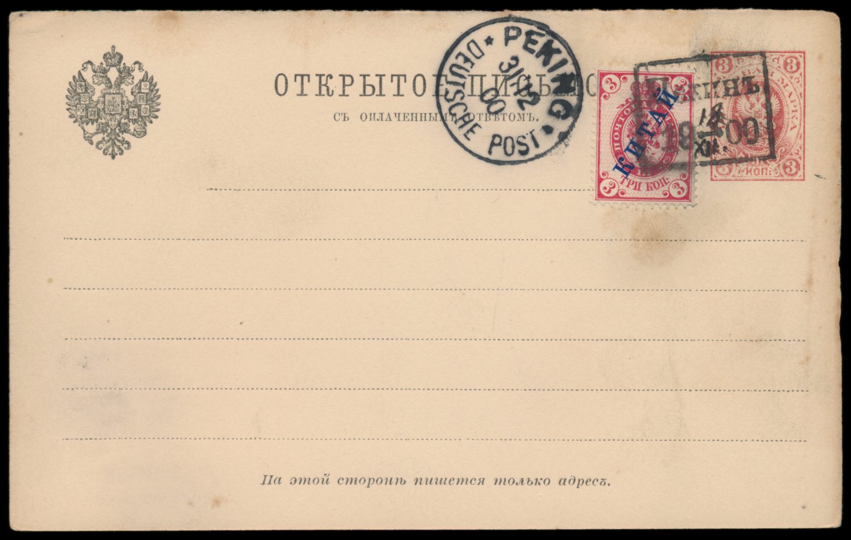Russische Post, seltener provisorischer Stempel "Pekin 19-00" und handschriftlich Datum "18.XII." auf Russland-Ganzsache 3 Kop. (rückseitig hektografierter Bildzudruck eines chinesischen Drachen) mit zufrankierter 3 Kop. "Kitai", ohne Anschrift, nebengesetzter Stempel Peking / Deutsche Post 31.12.00