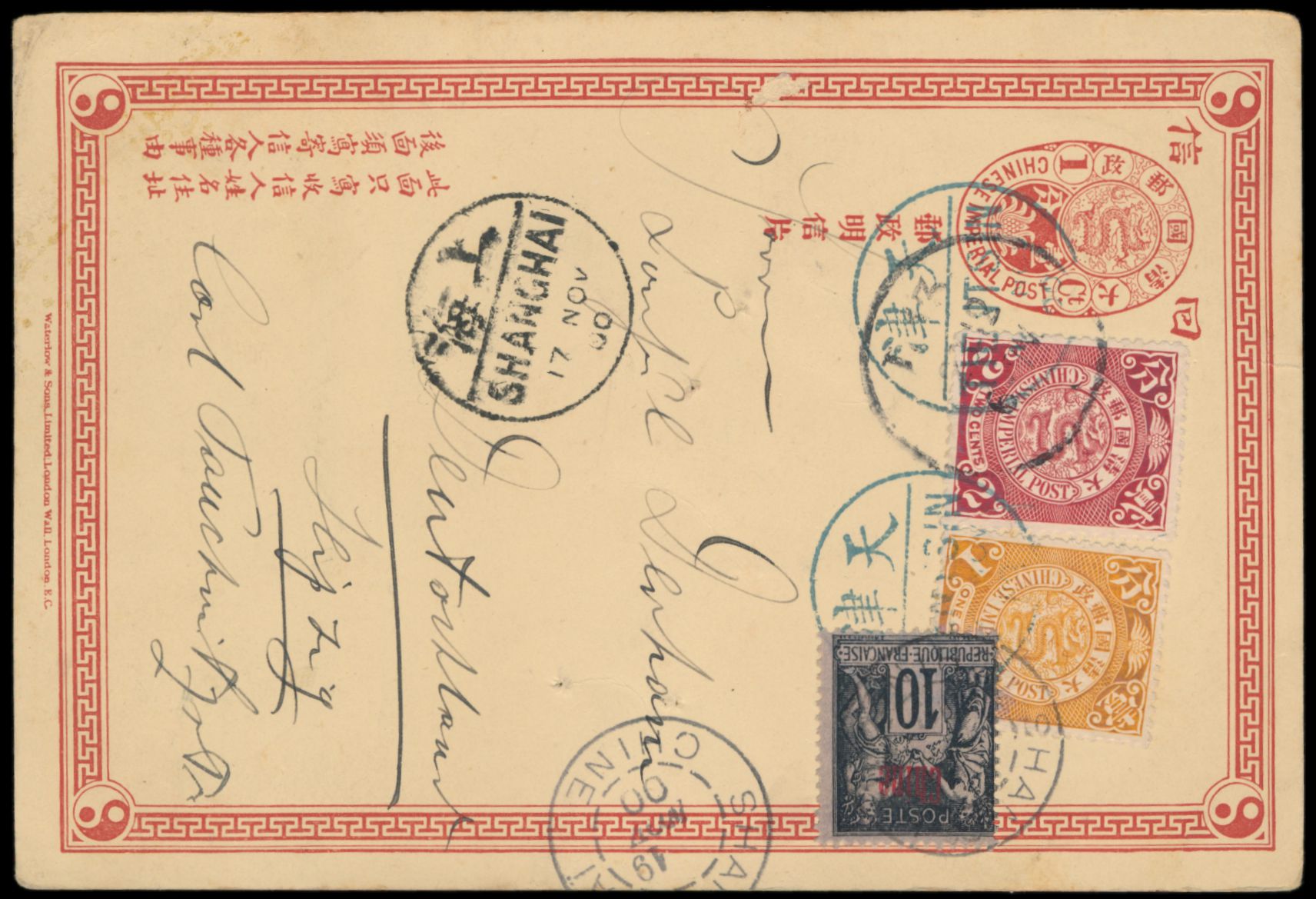 Ganzsachen-Antwortteil 1 C. (Han No. 3, winzige Schürfstelle im Rahmen links) mit C.I.P. 1 C. und 2 C. in Doppelfrankatur mit französischer Post nach Deutschland, blauer Stempel Tientsin 11.11.00, Durchgangsstempel Shanghai 17.11.00 und Stempel Shanghai / Chine 19.11.00 des französischen Postamts, Bedarf