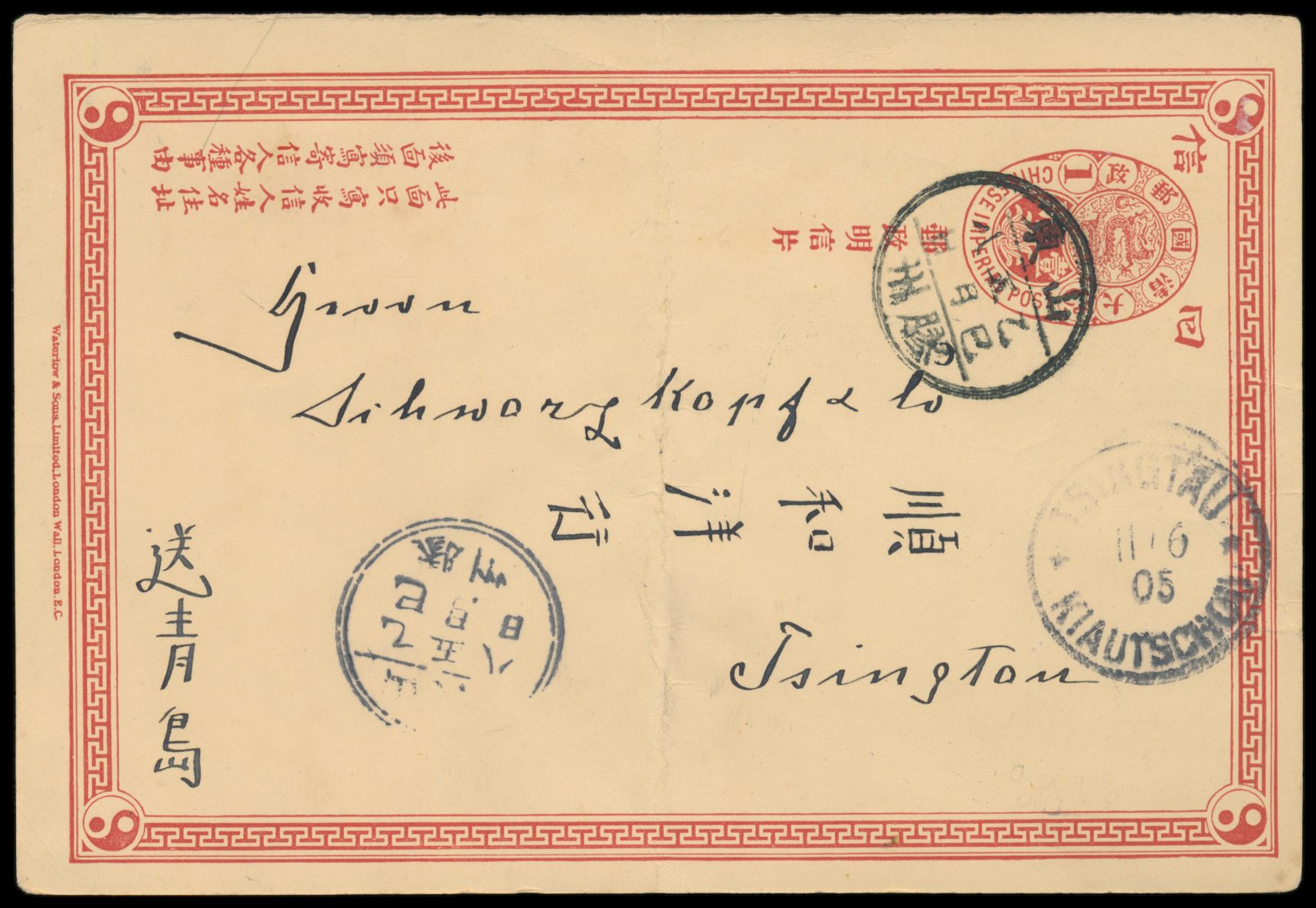 Ganzsachen-Antwortteil C.I.P. 1 C. (Han No. 3) , geschrieben in Taputur 9.6.1905, Lunar-Dater Kiachow, nach Tsingtau, Ankunftstempel Tsingtau / Kiautschou 11.6.05., schwacher senkrechter Mittelbug, Bedarf