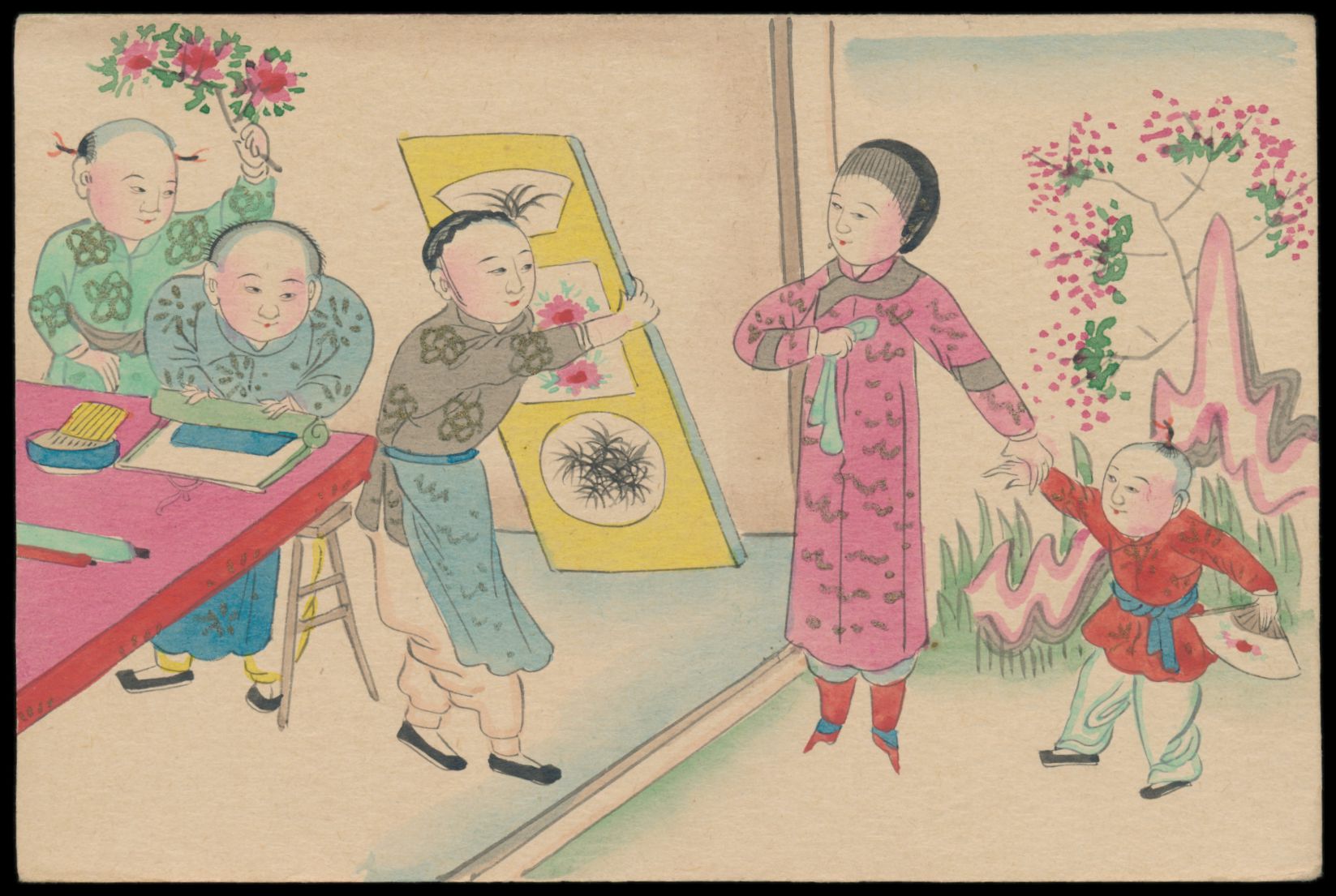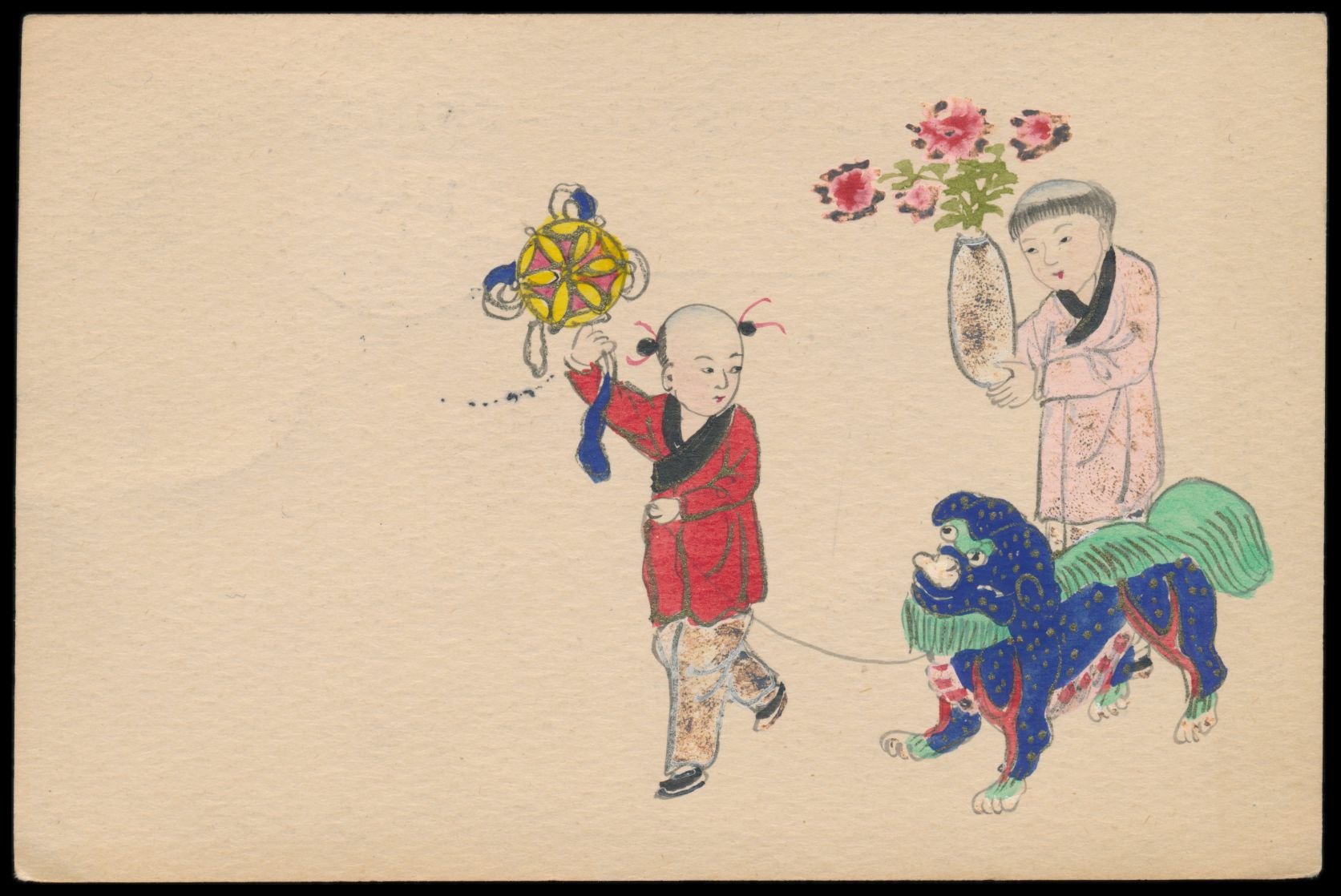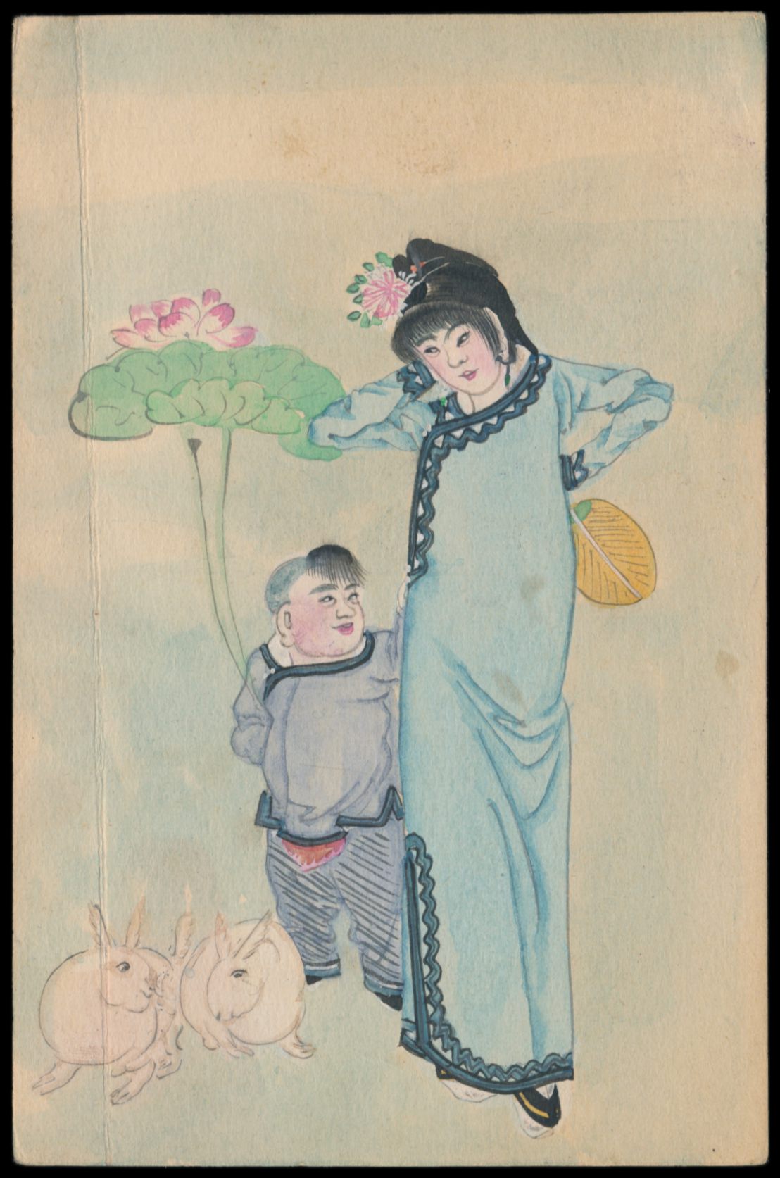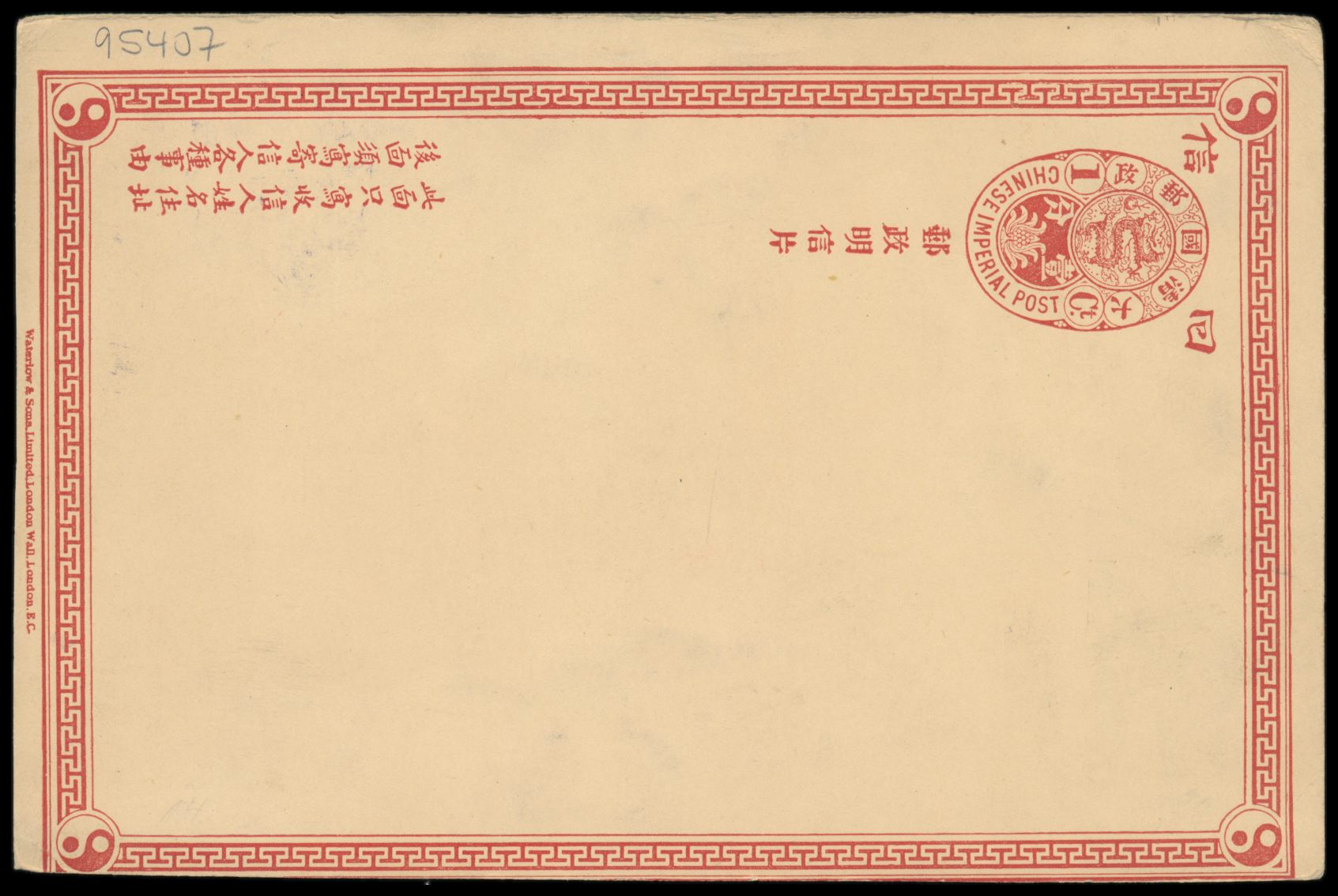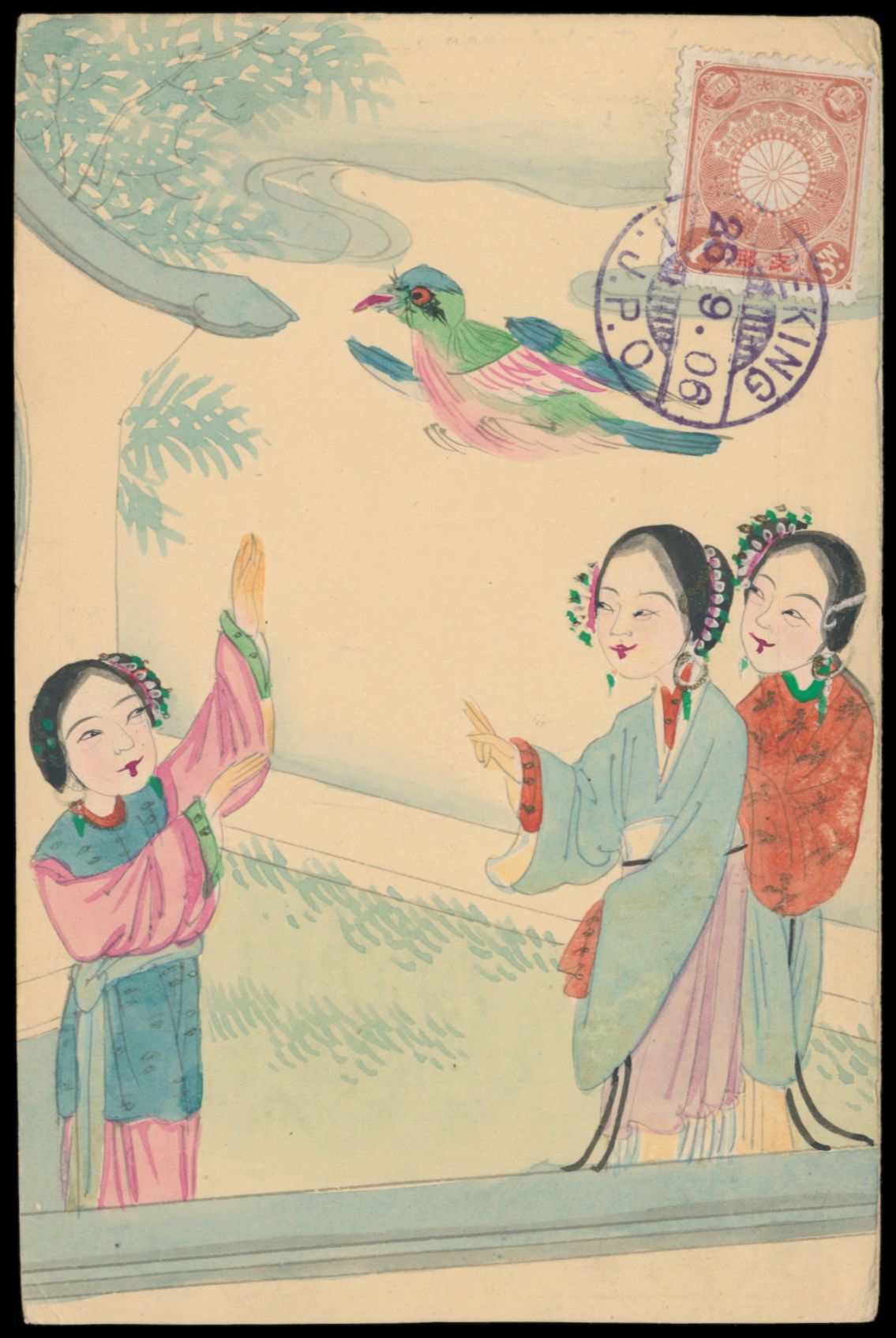 Ganzsachen-Antwortteil 1 C. (Han Nr. 3) mit rückseitig mehrfarbiger Tuschezeichnung von 3 Chinesinnen und ein Vogel, bildseitig Japanische Post 1 S. mit Stempel Peking I.J.P.O. 26.9.06, ungebraucht (unbeschriftet)