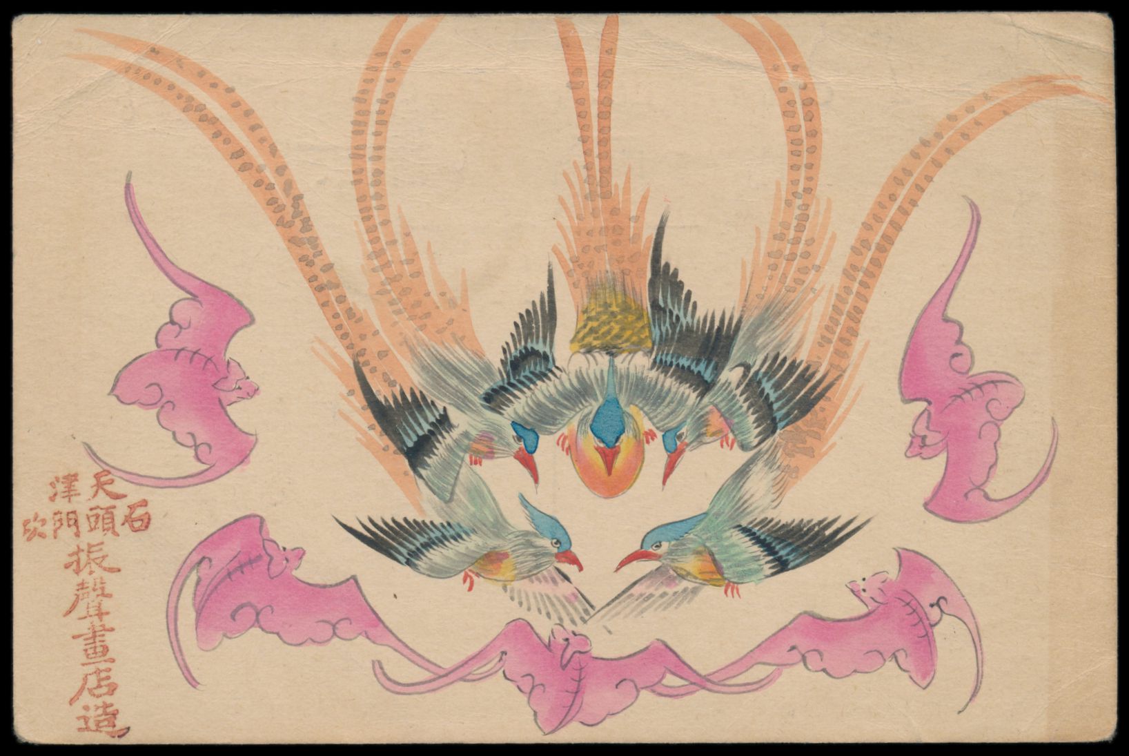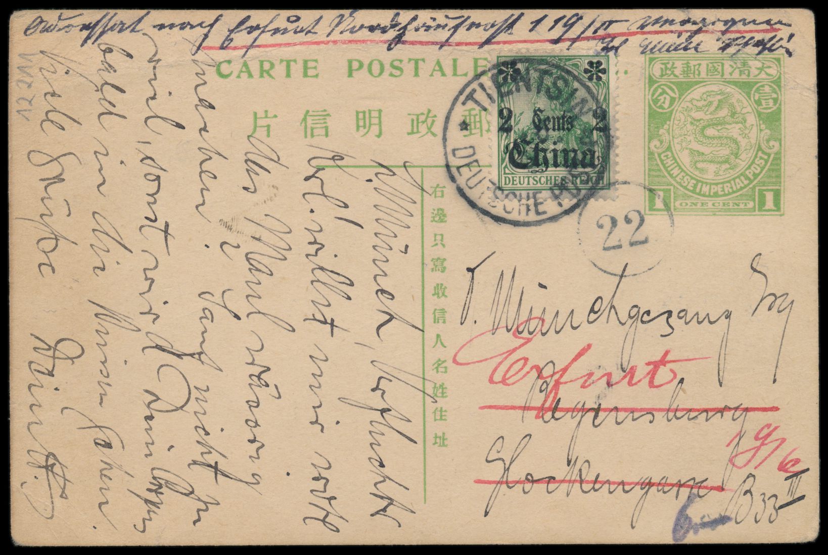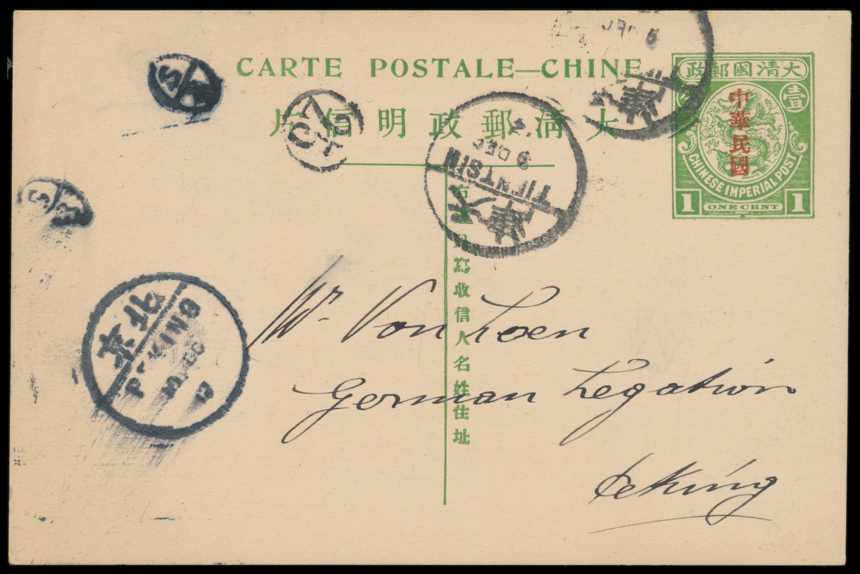 1908, Ganzsache C.I.P. 1 C. grün (Han Nr. 6) mit rückseitig mehrfarbiger Tuschezeichnung Vögel und Fledermäuse (Fabelwesen?), Zusatzfrankatur Deutsche Post 2 C. , Stempel Tientsin / Deutsche Post a 1.6.09, nach Deutschland, rechts oben kleiner Eckbug, Bedarf