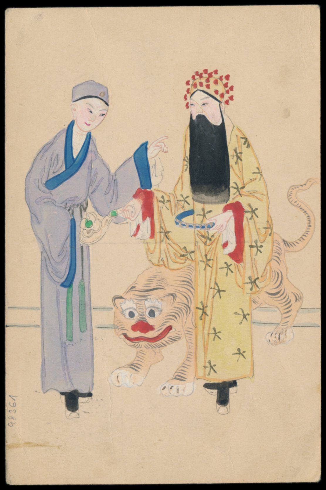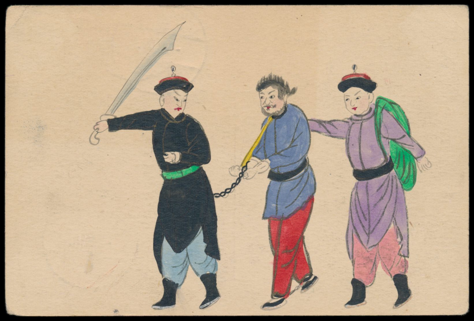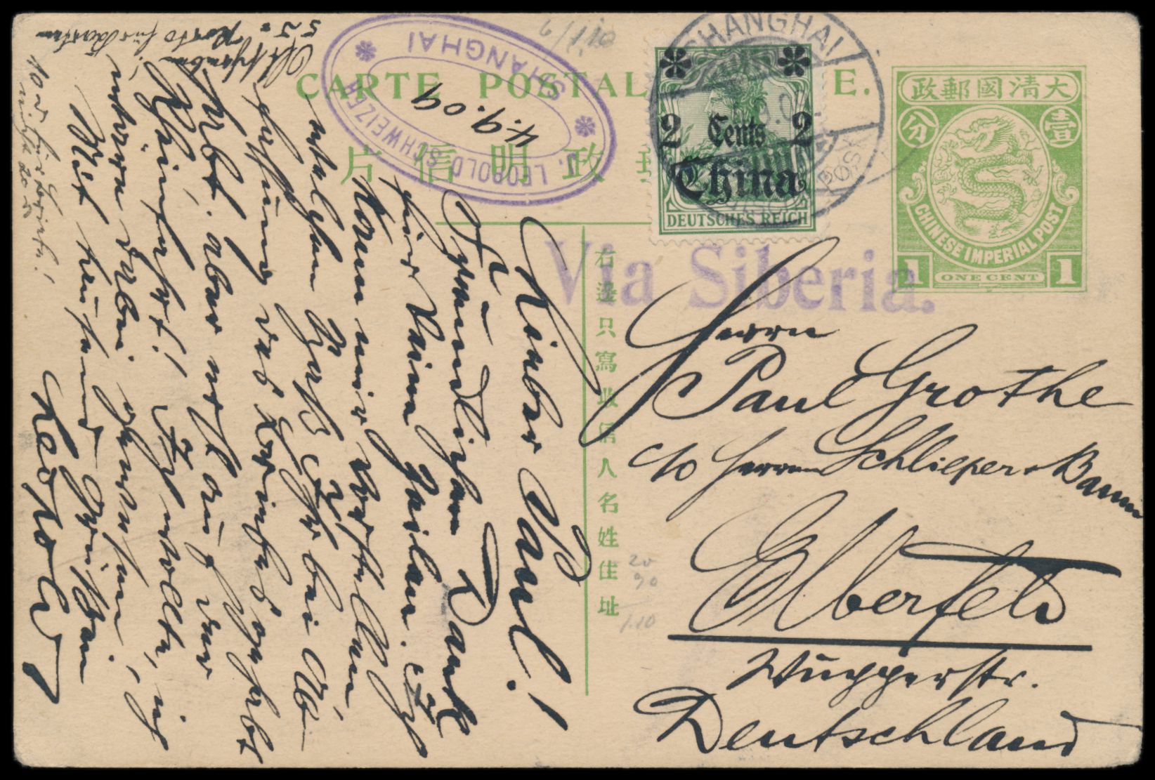 Ganzsache 1 C. (Han No. 6) mit rückseitig mehrfarbiger Tuschezeichnung "Zwei chinesische Soldaten mit Gefangenem", Zusatzfrankatur Deutsche Post 2 C., Stempel Shanghai / Deutsche Post 4.9.09, Stempel "Via Sibirien", nach Deutschland, Bedarf