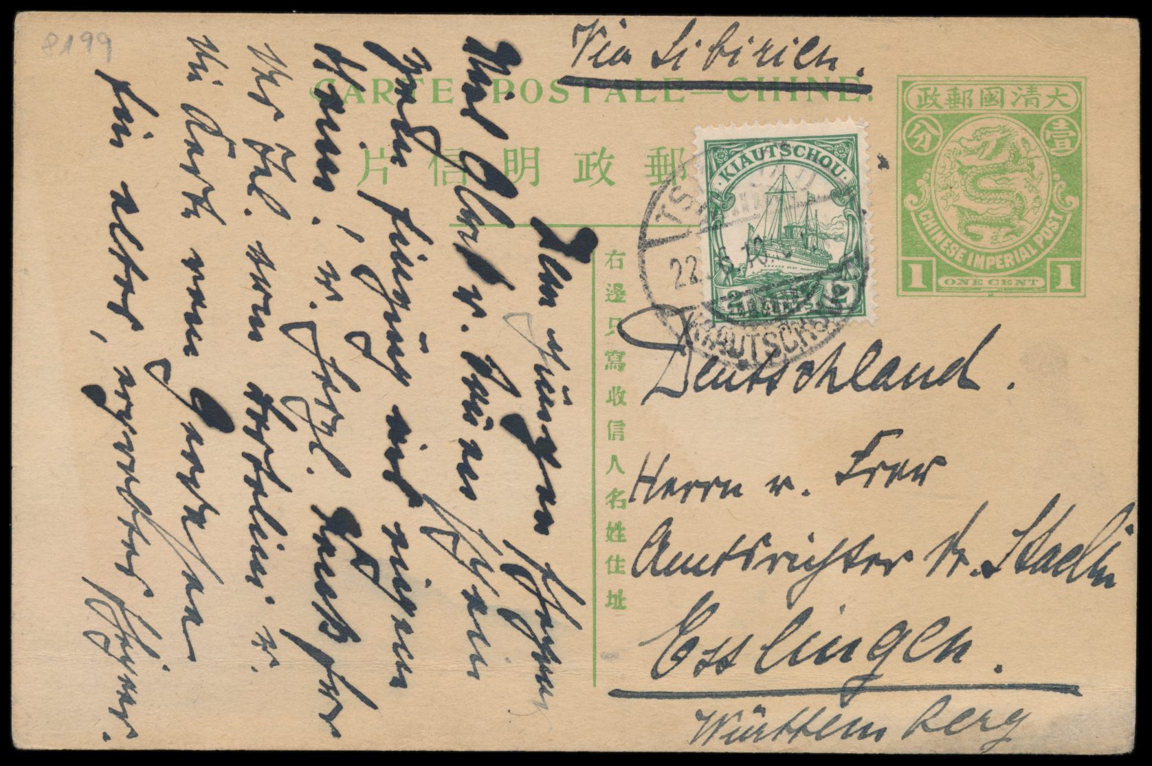 1908, Ganzsache C.I.P. 1 C. grün (Han Nr. 6) mit rückseitig mehrfarbiger Tuschezeichnung, Zusatzfrankatur Kiautschou 2 C. , Stempel Tsingtau / Kiautschou 22.6.10, "via Sibirien" nach Deutschland, unten waagerechter Bug, Bedarf
