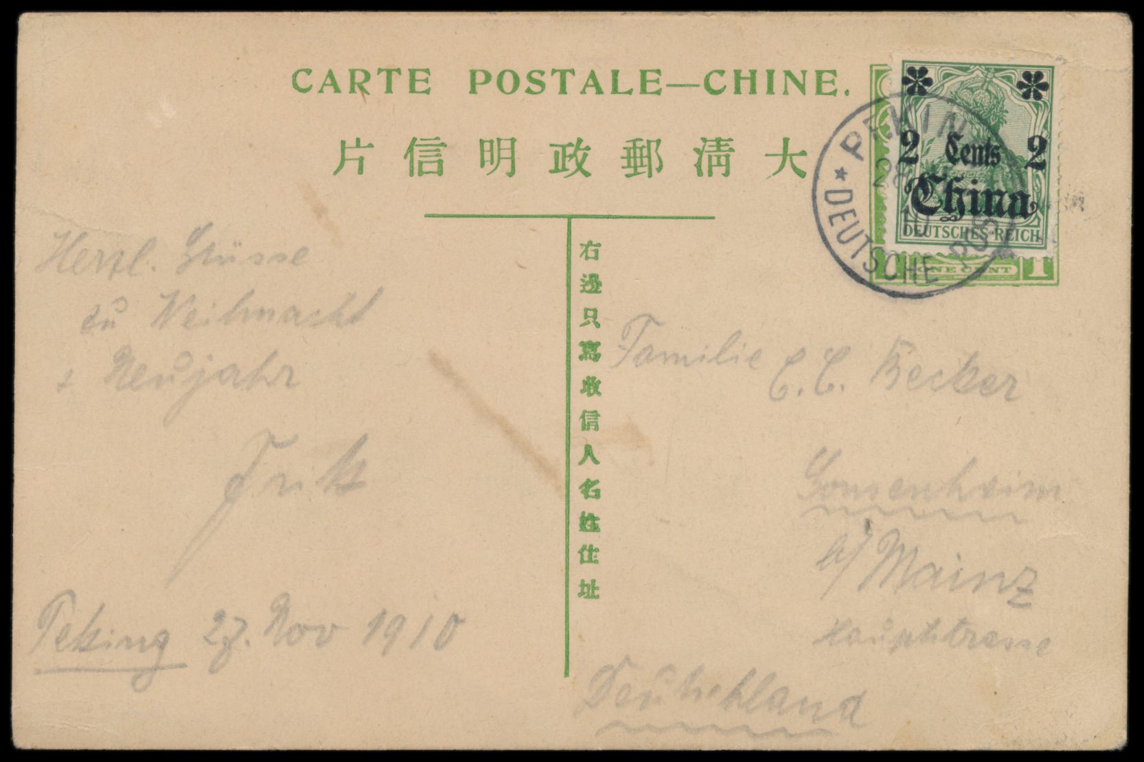 1908, Ganzsache C.I.P. 1 C. grün (Han Nr. 6) mit rückseitig mehrfarbiger Tuschezeichnung, Wertstempel mit Deutsche Post 2 C. überklebt, Stempel Peking / Deutsche Post 28.11.10, nach Deutschland, Bedarf