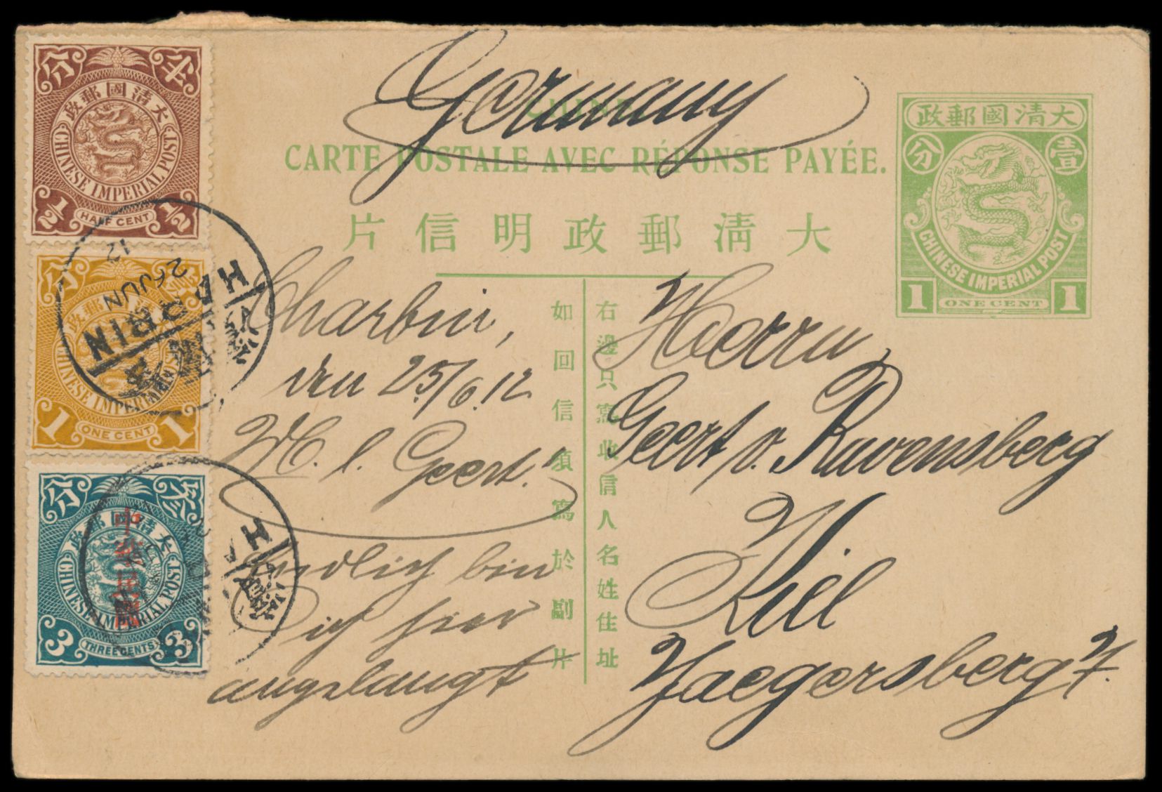Ganzsachen-Frageteil C.I.P. 1 C. grün (Han No. 7) mit Zusatzfrankatur C.I.P. 1/2 C. und 1 C. und Republik 3 C. nach Deutschland, Stempel Harbin 26.6.12, Bedarf