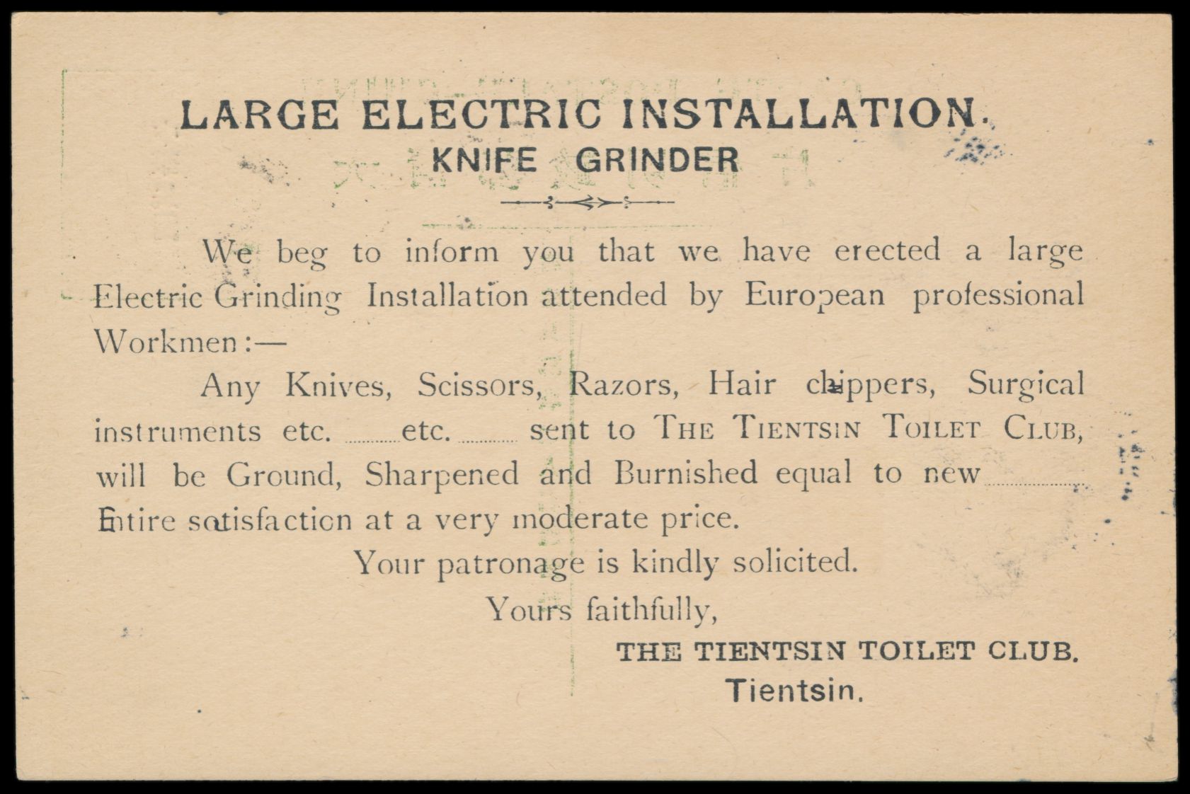 Republik, Ganzsache C.I.P. 1 C. grün mit rotem Aufdruck, Han No. 8, rückseitig Zudruck "The Tientsin Toilet Club", Stempel Tientsin 9.12.11, Ankunftstempel 10.12.11, Bedarf
