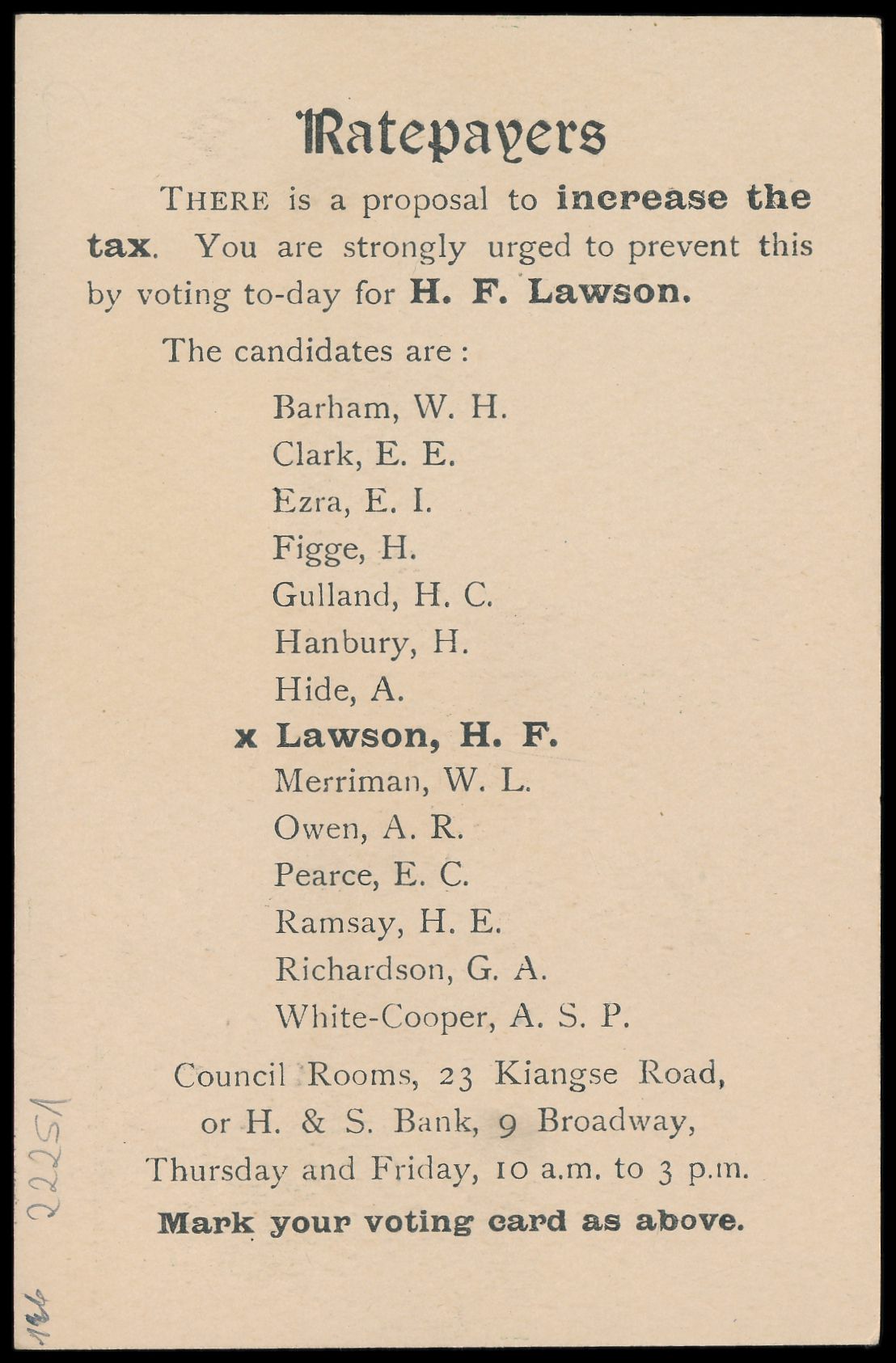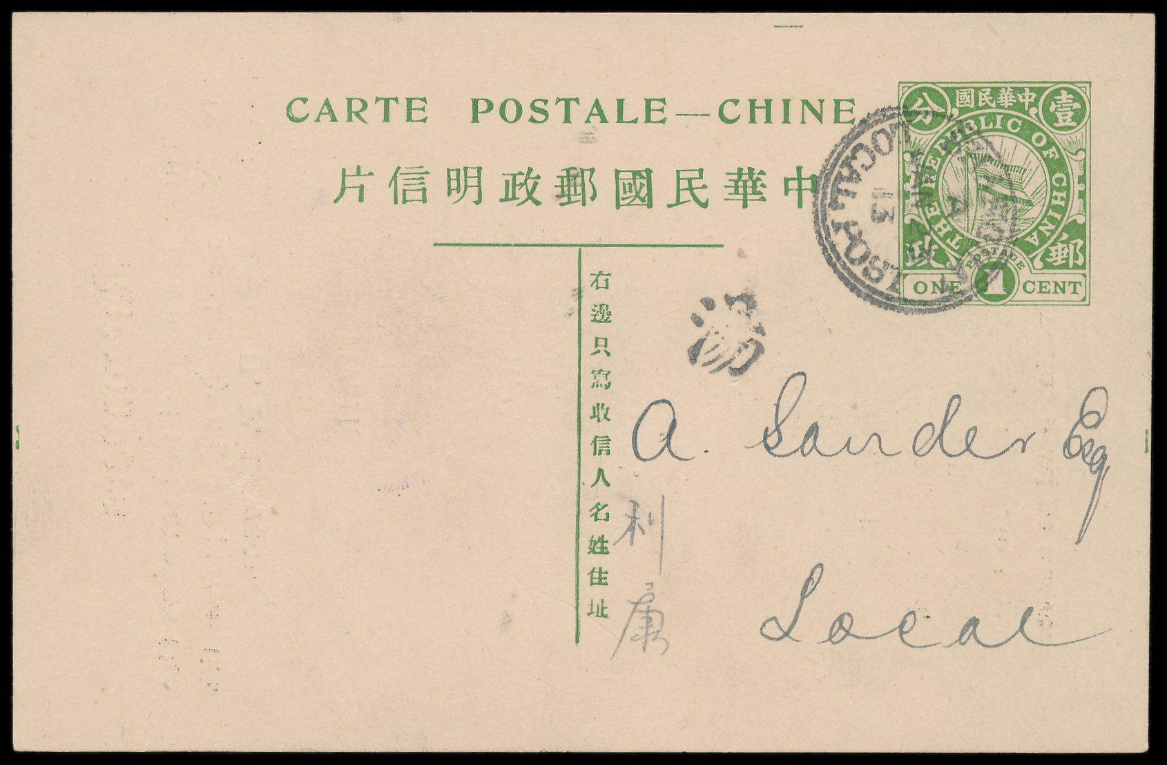 Ganzsache 1 C. (1912) mit rückseitigem Zudruck " Ratepayers ... H.F. Lawson ...", Han Nr. 10, Stempel Shanghai Local Post 23.1.13