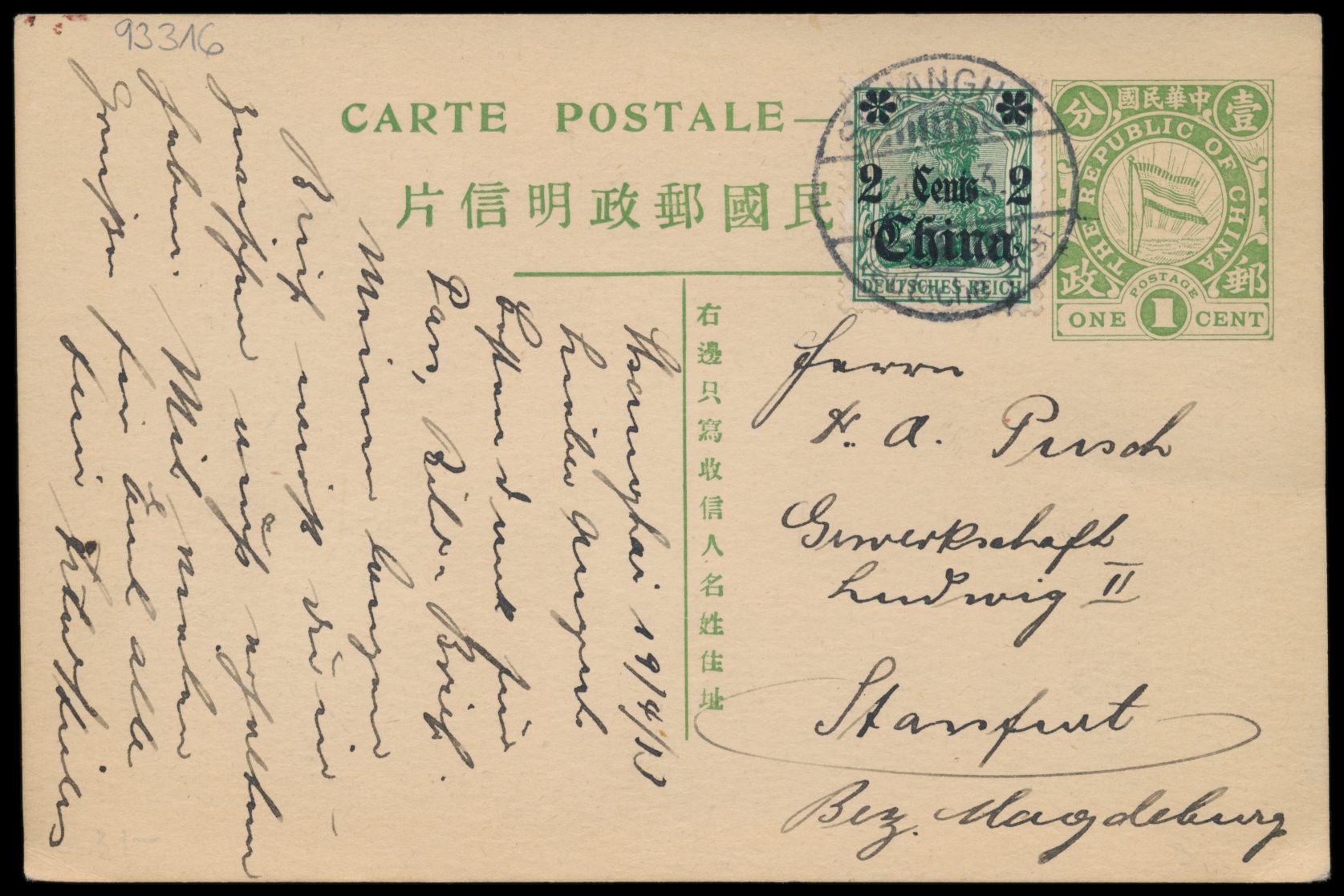 Republik, Ganzsache 1 C. "Flagge der Republik" (Han Nr. 10) mit rückseitig mehrfarbiger Tuschezeichnung Feldarbeiter (Bauern), Zusatzfrankatur Deutsche Post 2 C. , Stempel Schanghai / Deutsche Post 20.4.13, nach Deutschland, Bedarf