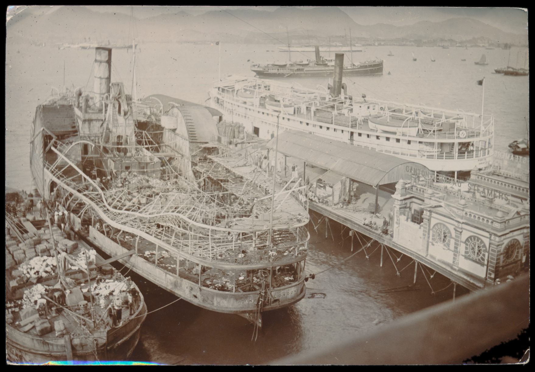 Original-Fotographie des Fährschiffes "Bank of London" mit durch Brand zerstörten Aufbauten, am Pier "Hongkong & Macao Steamers", ca. 1910, Format 10 x 14,5 cm