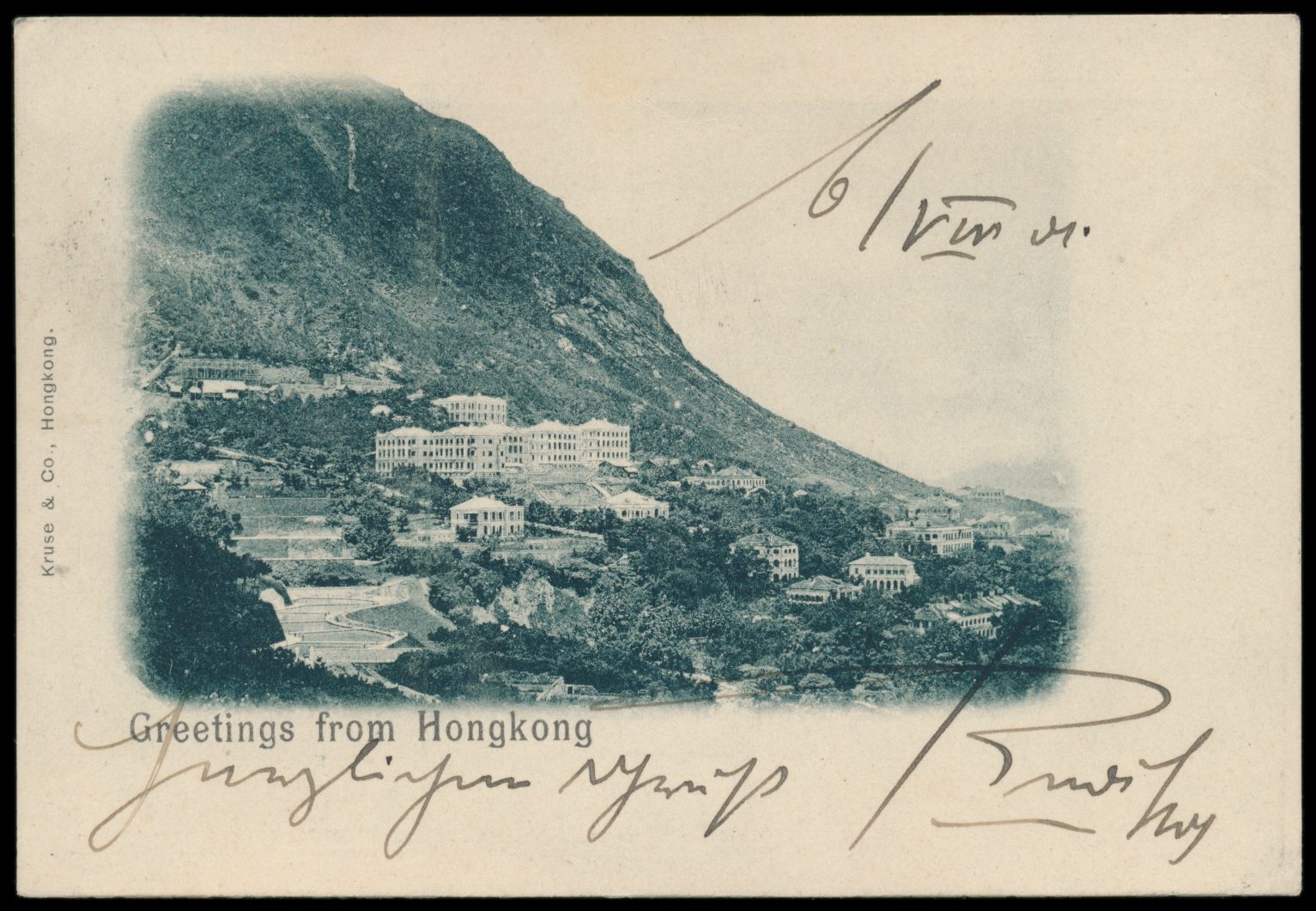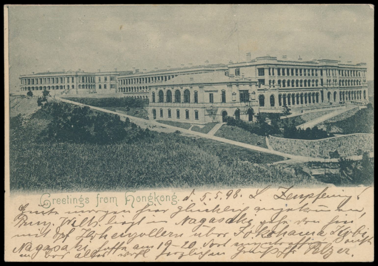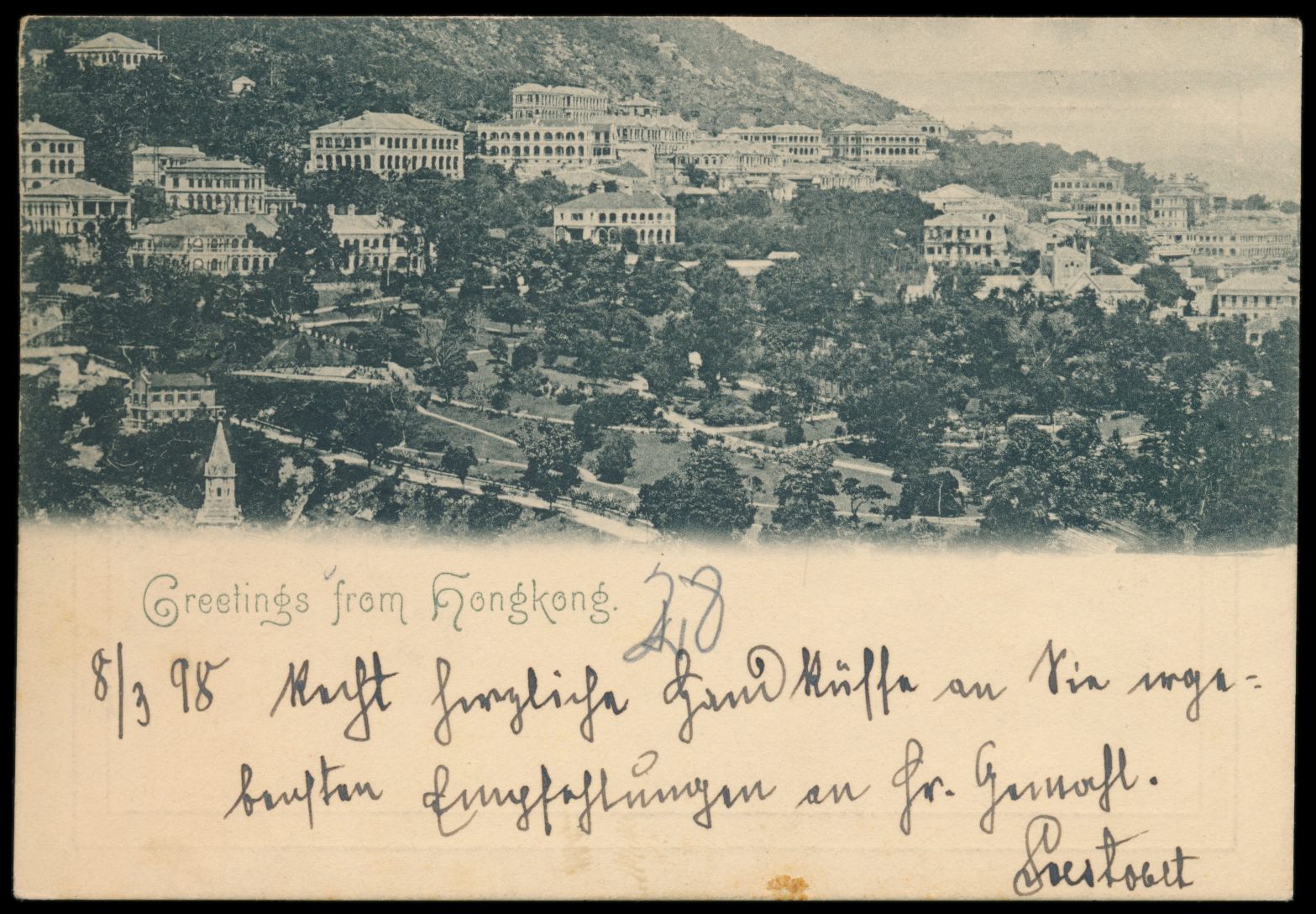 frühe Ansichtskarte (Kleinformat) "Greetings from Hongkong" (Mount Austin Barracks) von 1898, Frankatur QV 4 C., Stempel Hong-Kong C 7.5.98, nach Deutschland, Ankunftstempel Wilhelmshaven 7.6.98, Bedarf