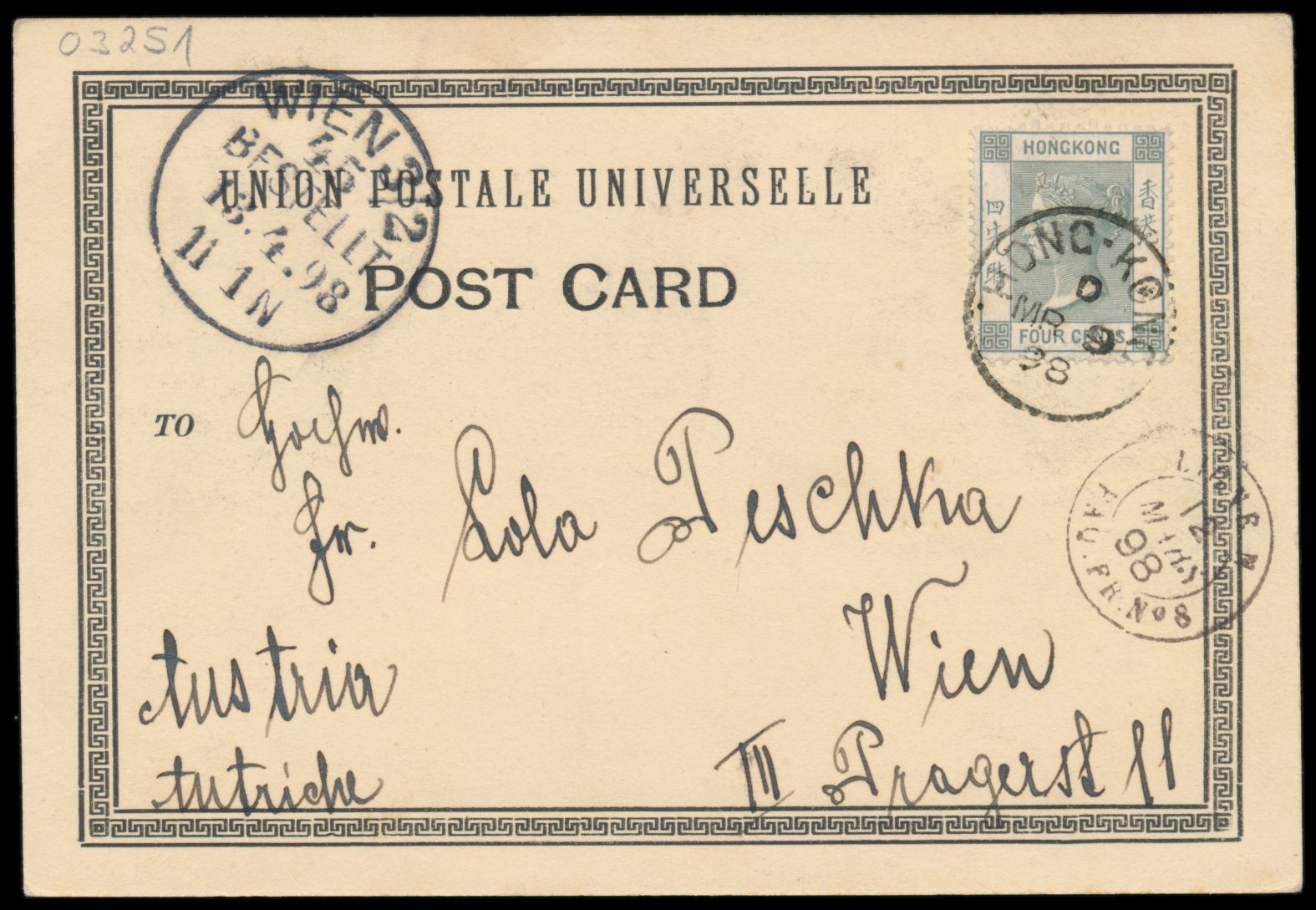 frühe Ansichtskarte (Kleinformat) "Greetings from Hongkong" (Panorama) von 1898, Frankatur QV 4 C., Stempel Hong-Kong D 9.3.98, nach Wien, Durchgangsstempel L Ligne N Paq. Fr. No. 8 12.3.98, Ankunftstempel 18.4.98, Bedarf