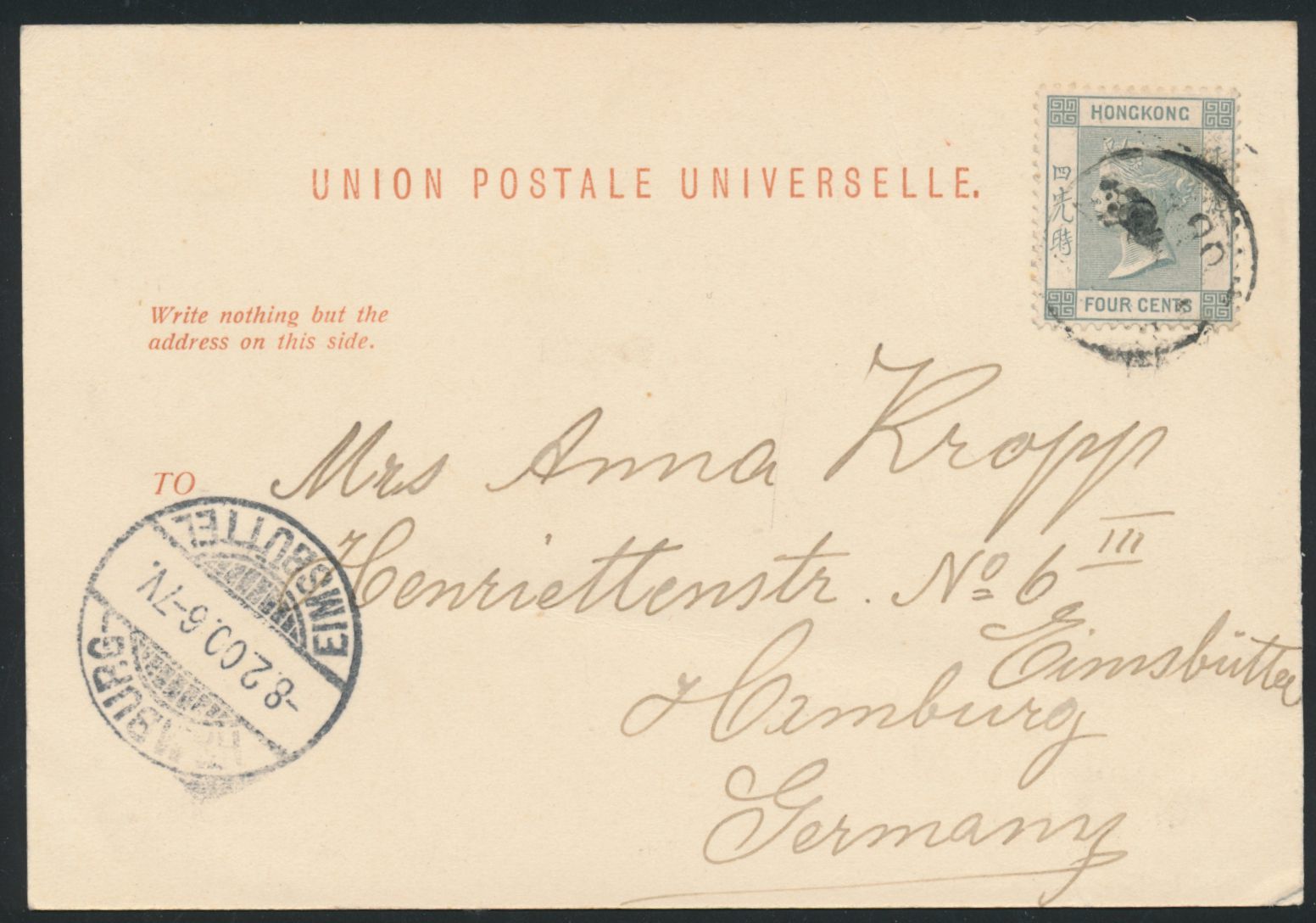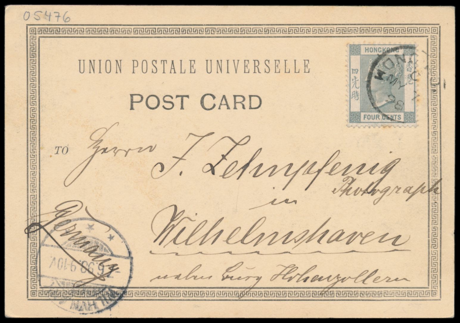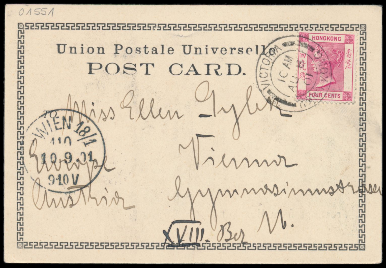 frühe Ansichtskarte (Kleinformat) "Greetings from Hongkong" (Teilansicht) , Verlag Kruse & Co., Hongkong, Frankatur QV 4 C., Stempel Victoria Hong-Kong 6.8.01, nach Wien, Ankunftstempel 10.9.01, Bedarf