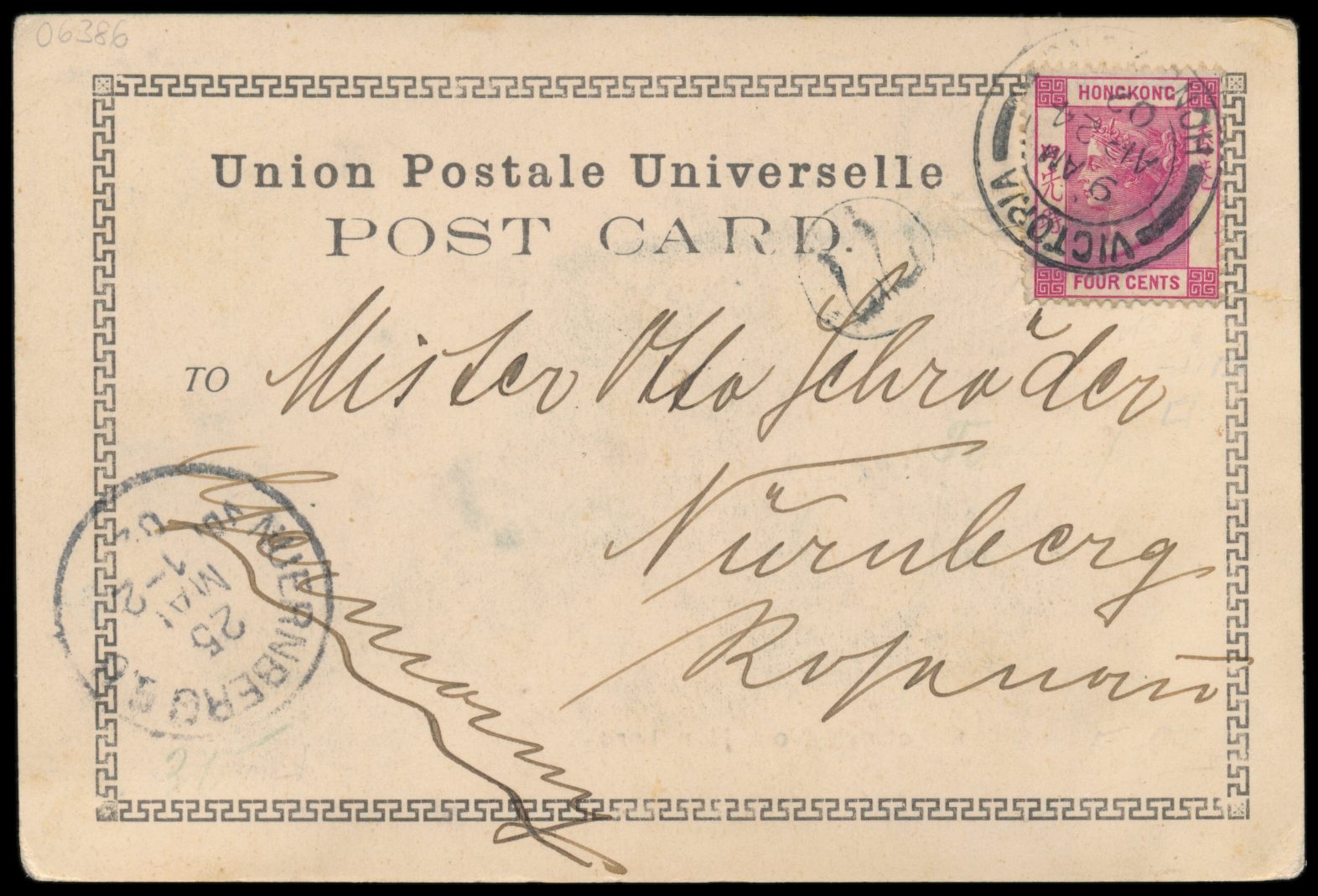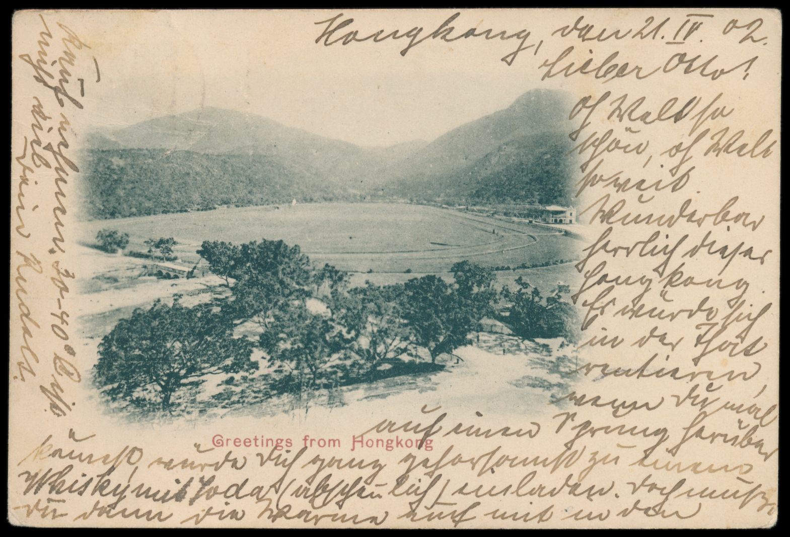 Ansichtskarte (Kleinformat) Race Course, Frankatur QV 4 C., Stempel Victoria / Hongkong 24.4.02, nach Deutschland, Ankunftstempel Nürnberg 25.5.02, Bedarf