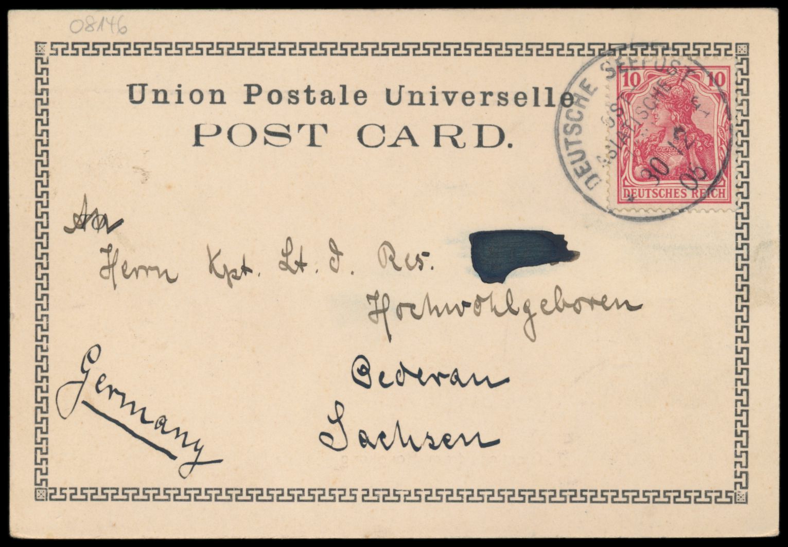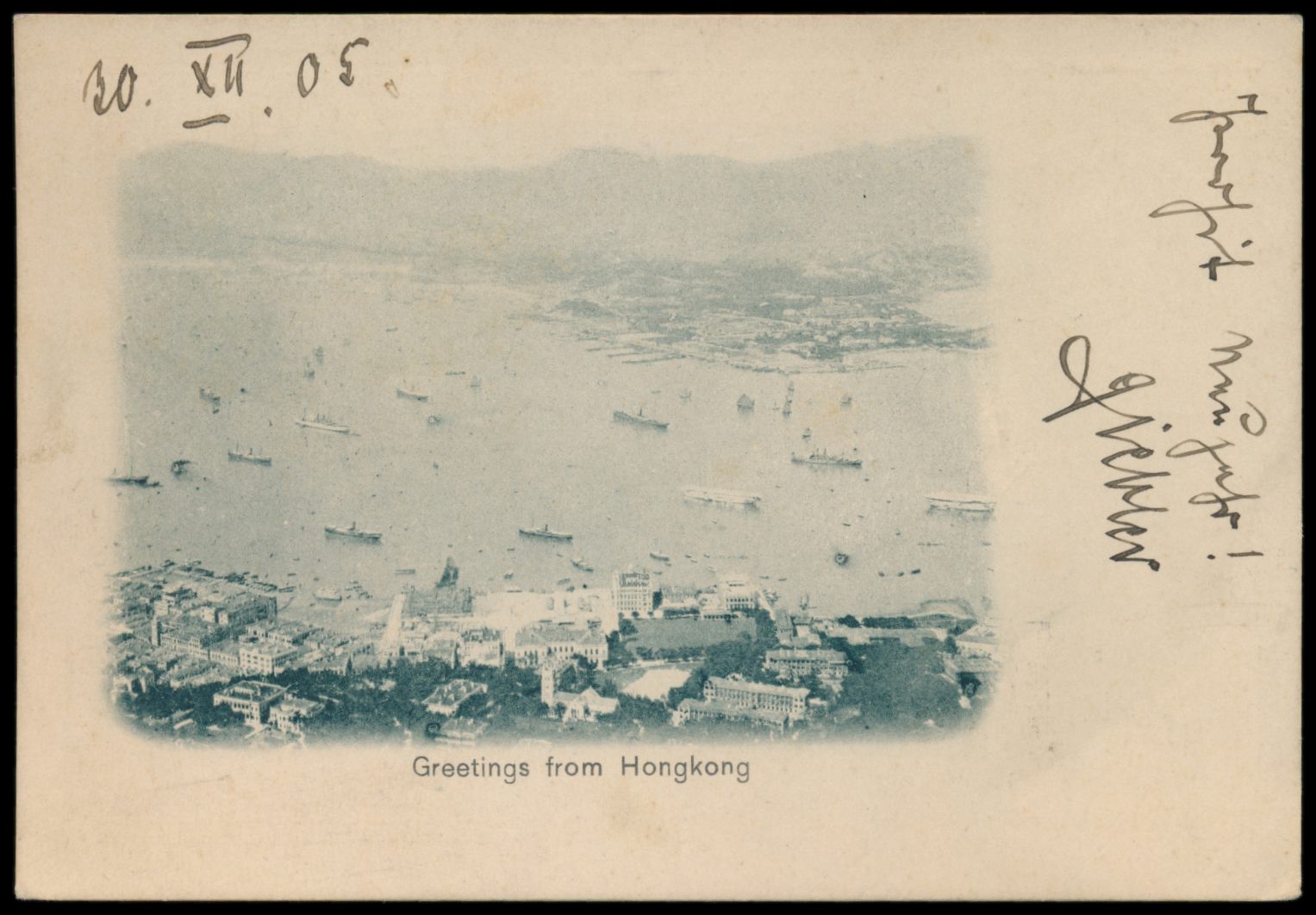 Ansichtskarte (Kleinformat) "Greetings from Hongkong" (Hongkong from the Peak) , ohne Verlagsangabe, Frankatur Deutsches Reich 10 Pf., Stempel Deutsche Seepost Ost-Asiatische Linie f 30.12.05, nach Deutschland, Name der Anschrift schwarz übermalt