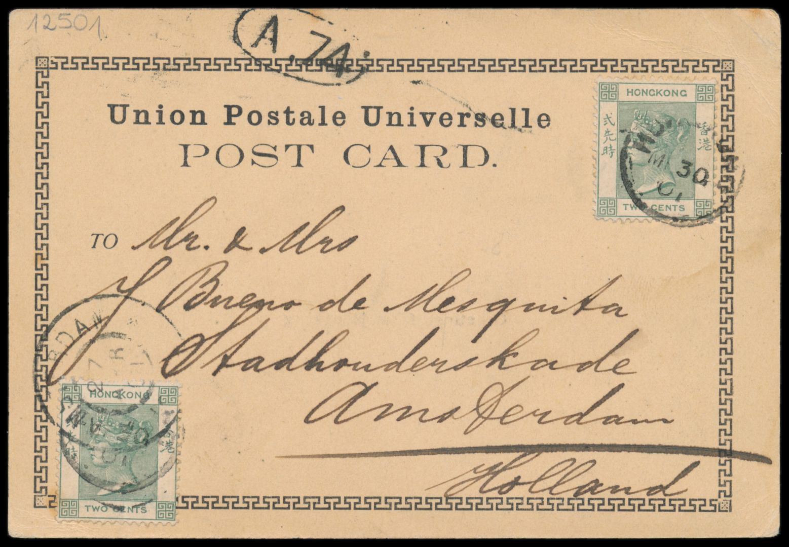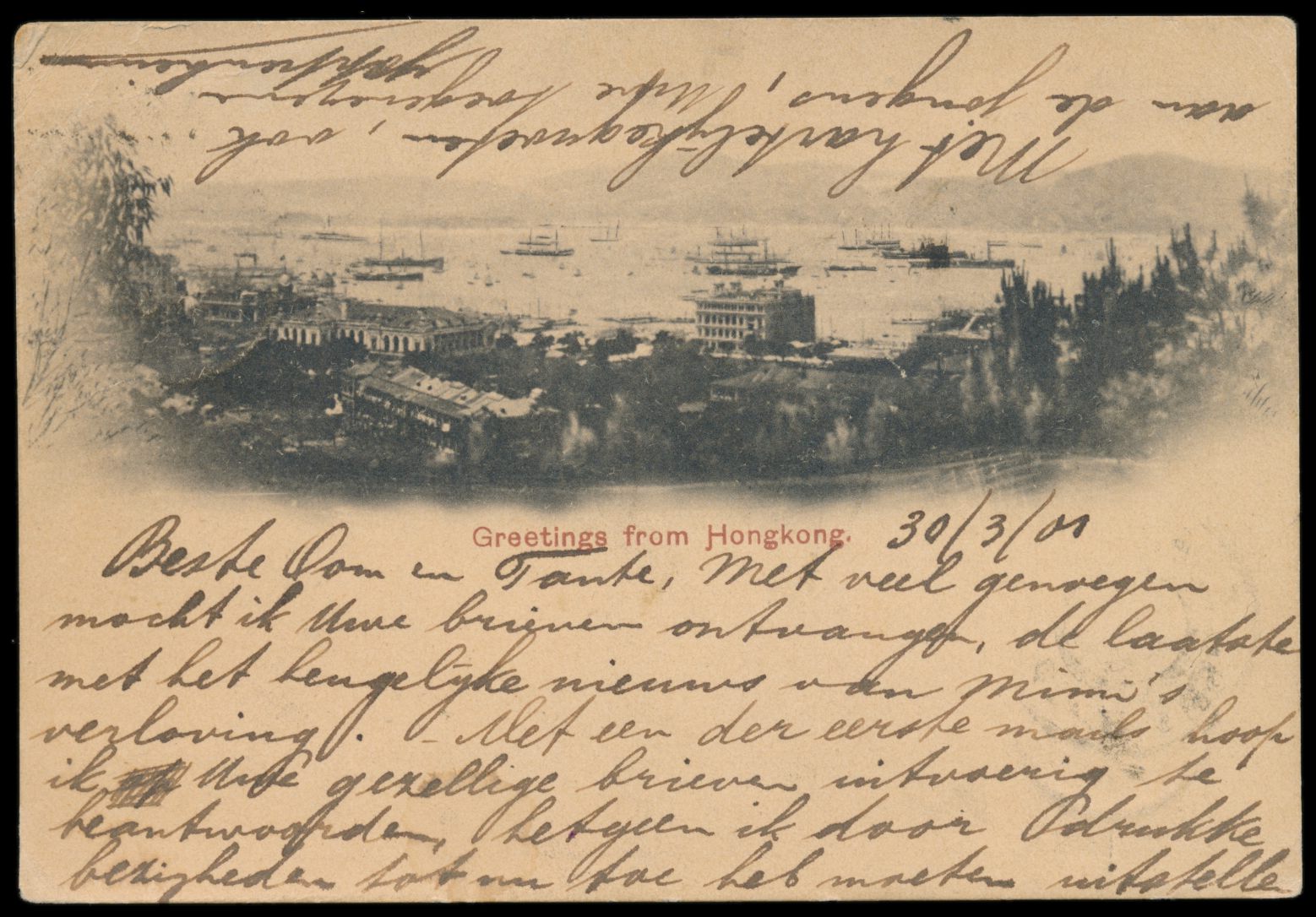 frühe Ansichtskarte (Kleinformat) "Greetings from Hongkong" (Hafenpanorama), Frankatur 2 x QV 2 C., Stempel Hong-Kong 30.3.01, nach Holland, Ankunftstempel Amsterdam 27.4.01, Bedarf