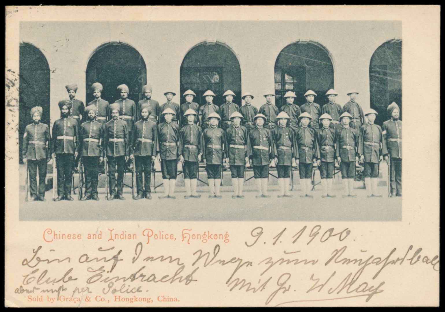 Ansichtskarte Chinese and Indian Police, Hongkong, Verlag Graca & Co., Frankatur QV 4 C., undeutlicher Stempel Hong-Kong , nach Deutschland, Ankunftstempel Hamburg 8.2.00