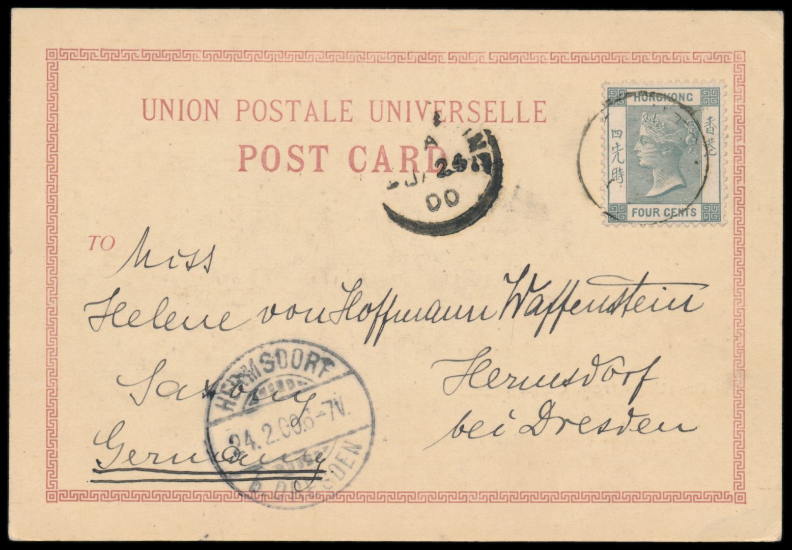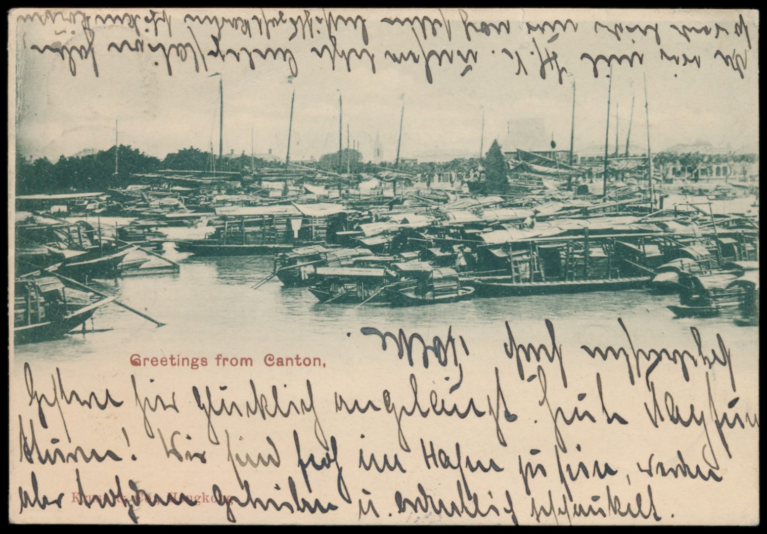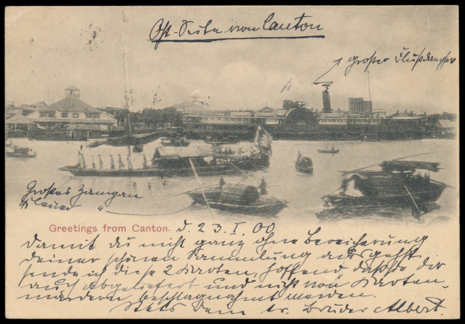 Ansichtskarte (Kleinformat) "Greetings from Canton" (Hafen), Frankatur QV 4 C., undeutlicher Stempel (Canton), nach Deutschland, Durchgangsstempel Hong-Kong 24.1.00, Ankunftstempel Hermsdorf 24.2.00, Bedarf