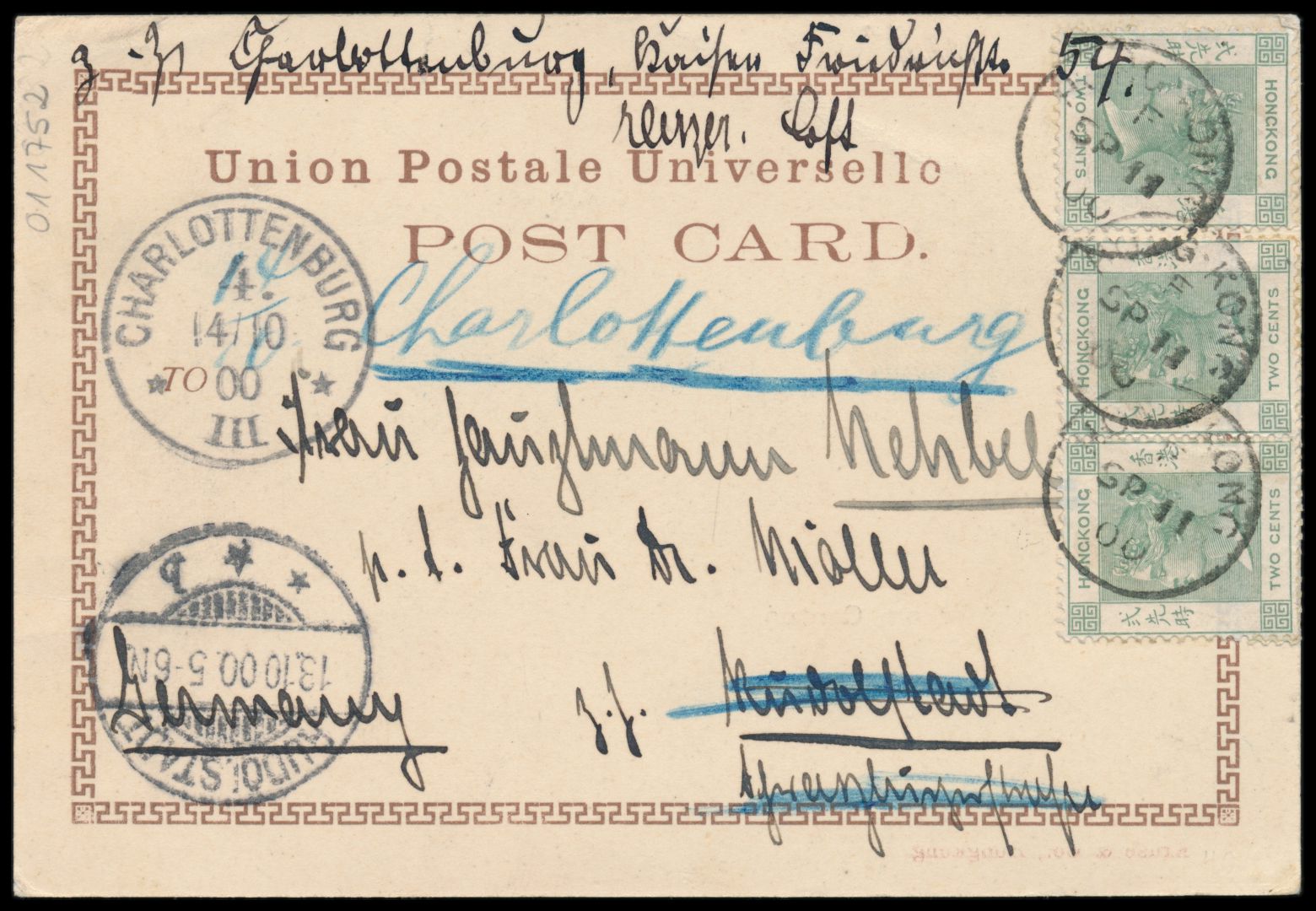 Ansichtskarte (Kleinformat) "Greetings from Canton" (Dschunkenhafen) , Frankatur 3 x QV 2 C., Stempel Hong-Kong 11.9.00, nach Deutschland, Ankunftstempel Rudolstadt, nachgesandt nach Charlottenburg, Ankunftstempel 14.10.00, Bedarf
