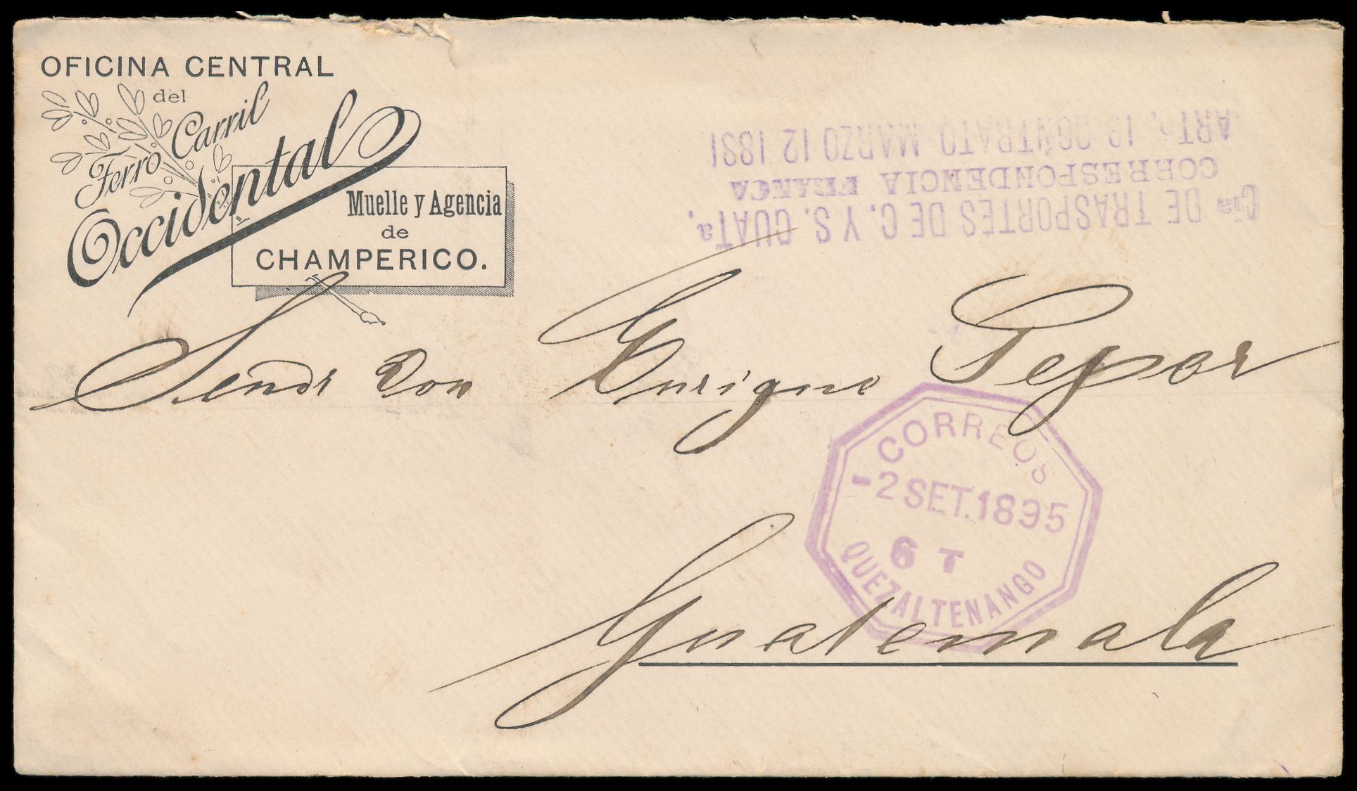 Dienstumschlag ... Ferro Carril Occidental .. mit gedruckter Lokomotive auf der Briefklappe, L3 Cia. de Transportes de C. Y S. Guat.a. / Correspondencia Franca ... für Portofreiheit, Stempel Correos Quezaltenango 2.9.1895, nach Guatemala, Ankunftsstempel 4.9.1895