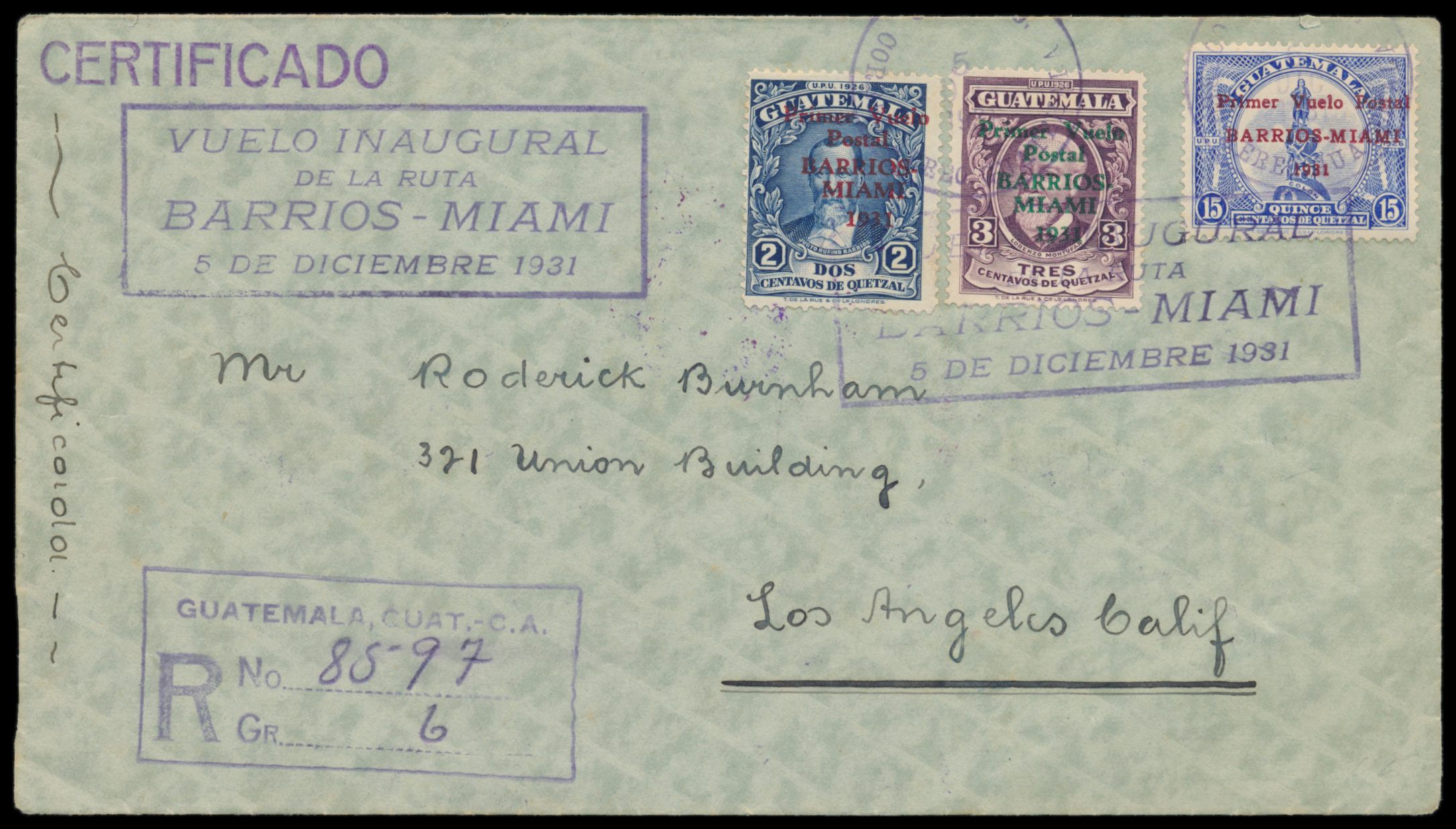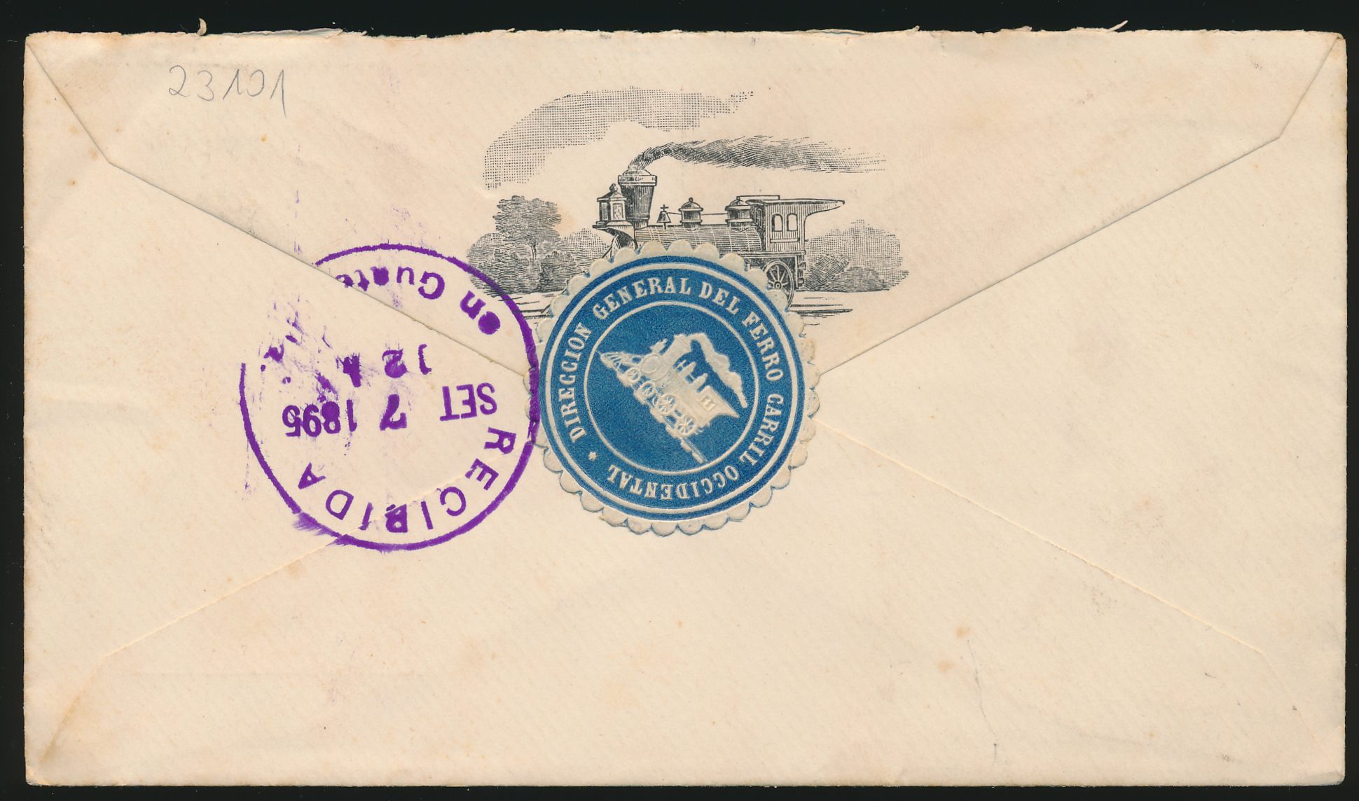Dienstumschlag ... Ferro Carril Occidental .. mit gedruckter Lokomotive auf der Briefklappe, rückseitig blaue Prägedruck-Siegelmarke "Direccion General del Ferro Carril Occidental", L3 Cia. de Transportes de C. Y S. Guat.a. / Correspondencia Franca ... für Portofreiheit, Stempel Correos Quezaltenango 2.9.1895, nach Guatemala, Ankunftstempel 7.9.1895