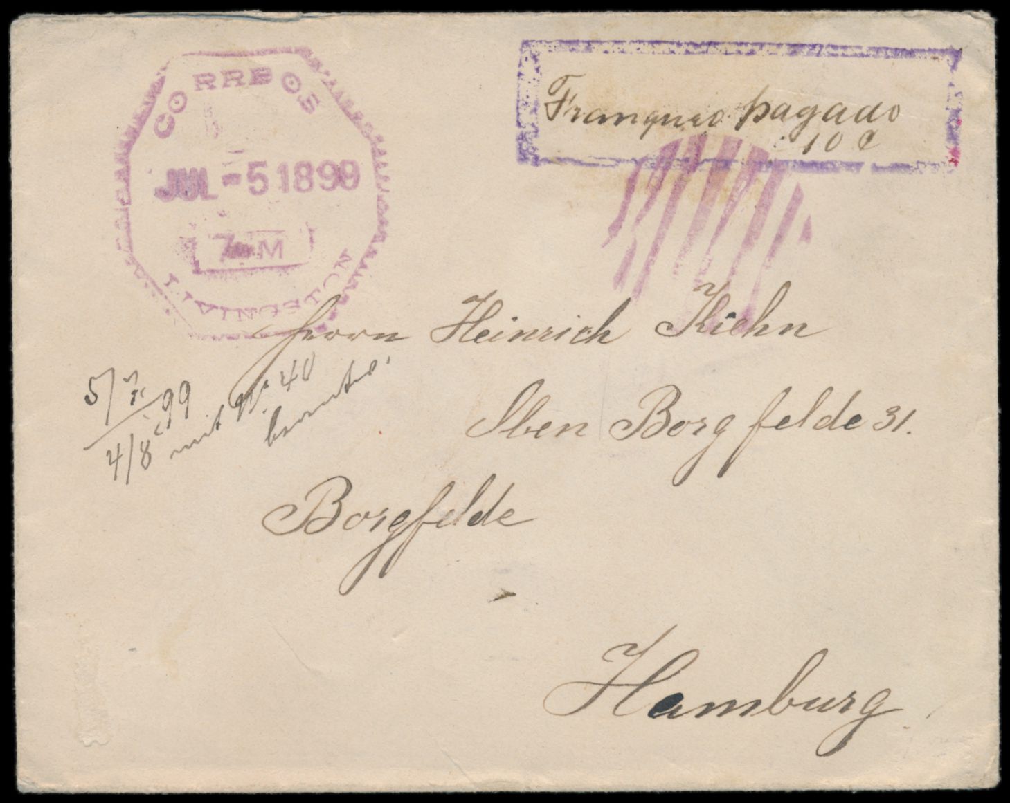 Auslandsbrief mit Barfrankatur nach Deutschland, violetter Rahmenstempel und handschriftlich "Franqueo pagado 10 C.", violetter Achteckstempel Correos Livingston 5.7.1899 und kreisförmiger Strichstempel, Durchgangstempel New Orleans 17.7.99 und Ankunftstempel Hamburg-Borgfelde 31.7.99, Bedarf