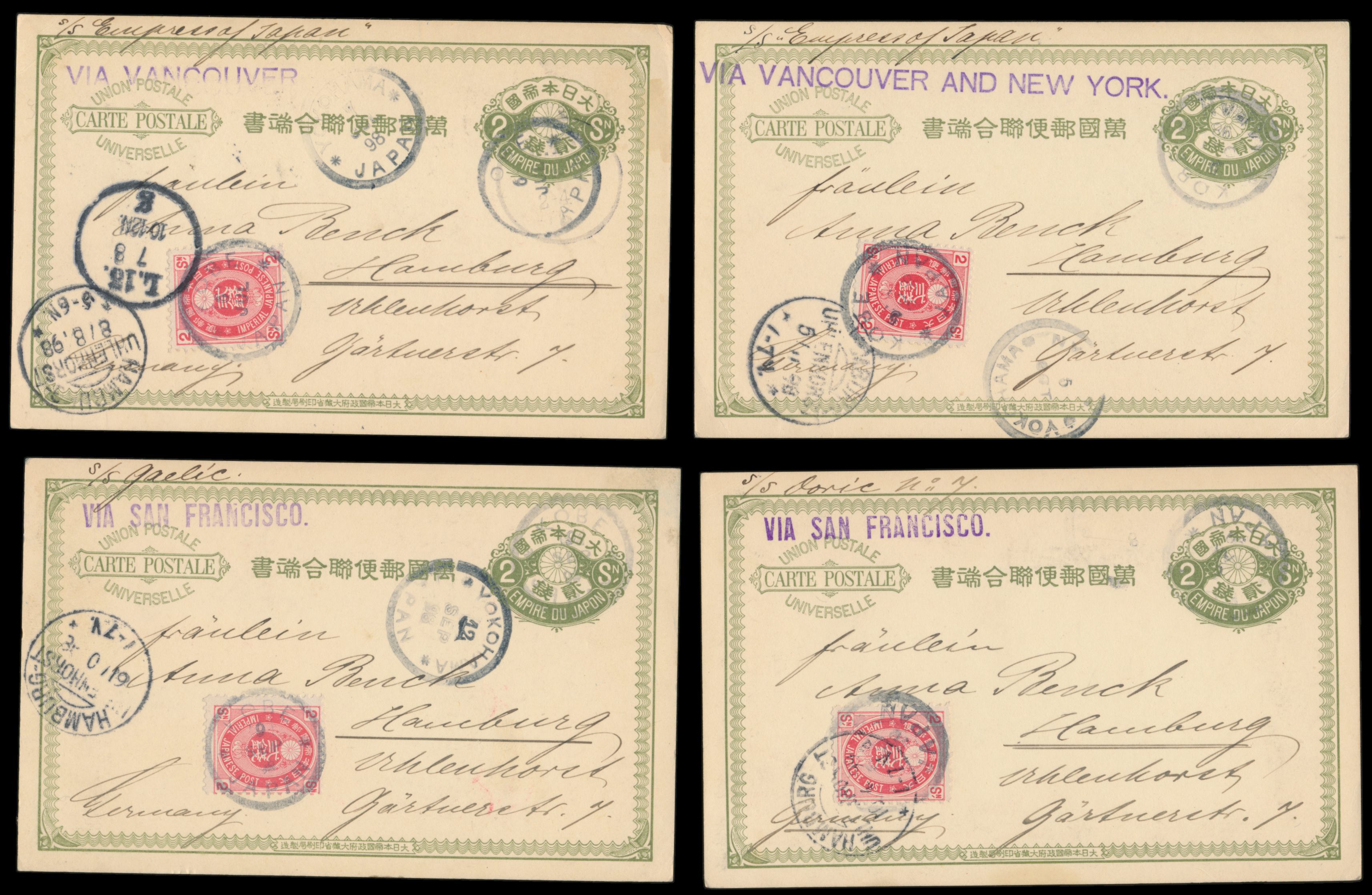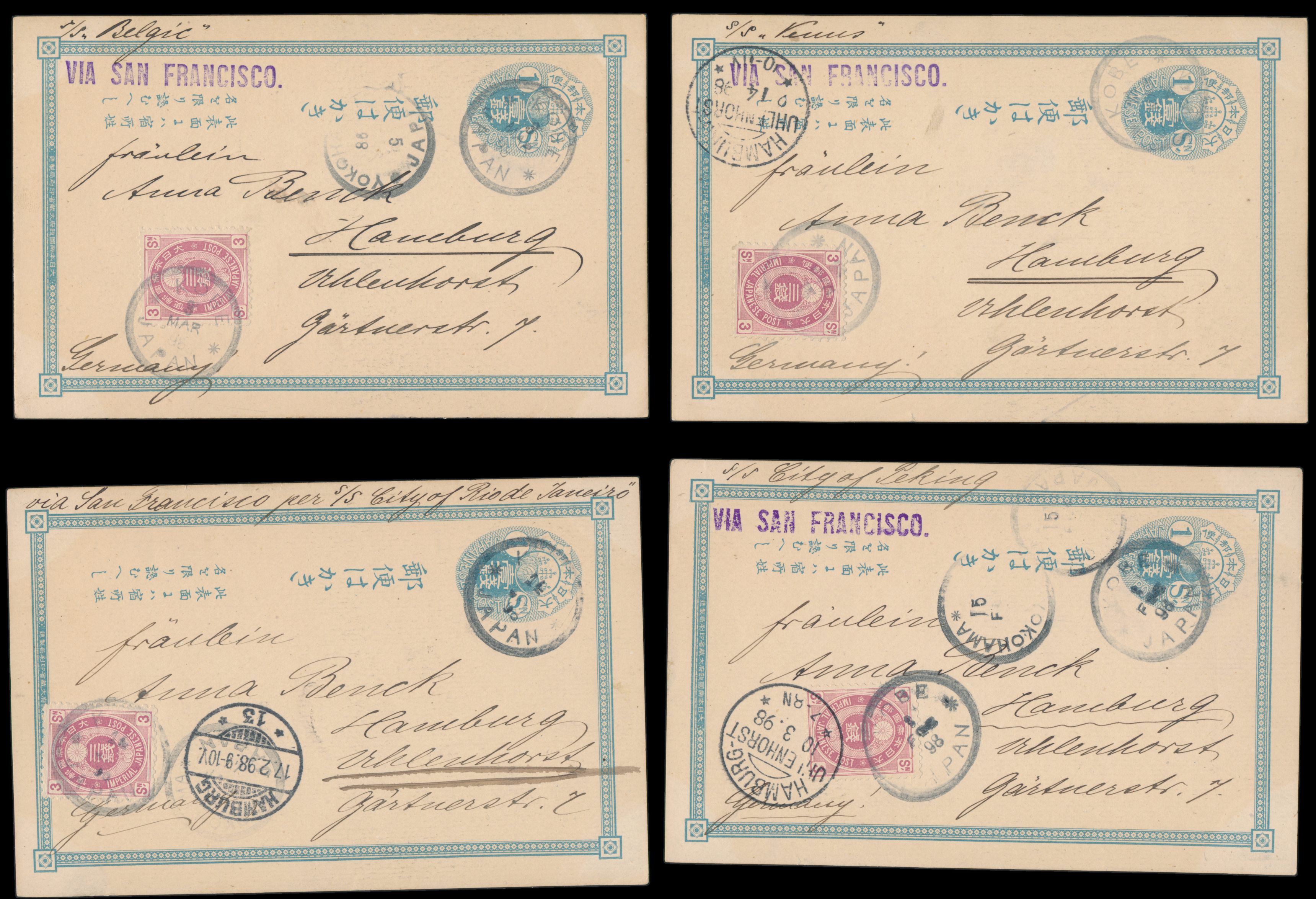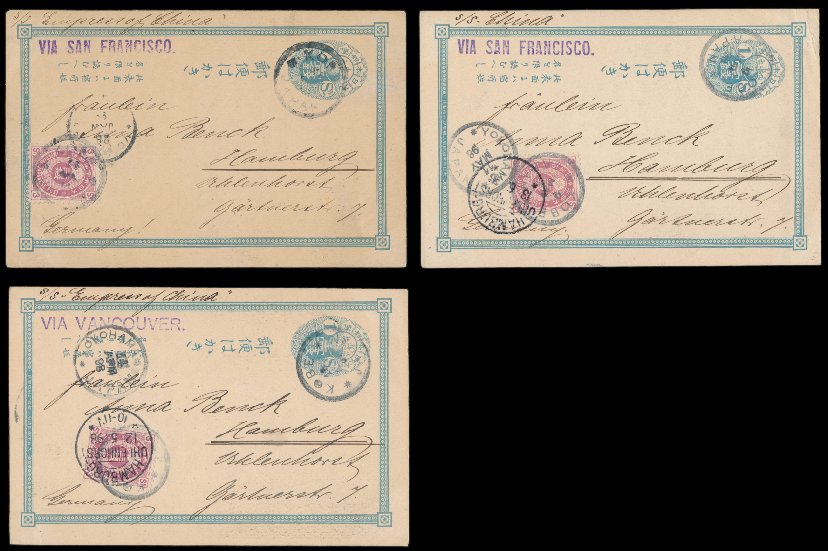 Lot von sieben 1 Sen-Ganzsachen mit rückseitig verschiedenen mehrfarbigen Bildern, alle mit Zusatzfrankatur 3 Sen Koban, alle mit Stempel Kobe / Japan 1898 via San Francisco oder Vancouver nach Deutschland, eine Korrespondenz, Bedarf, gute Erhaltung