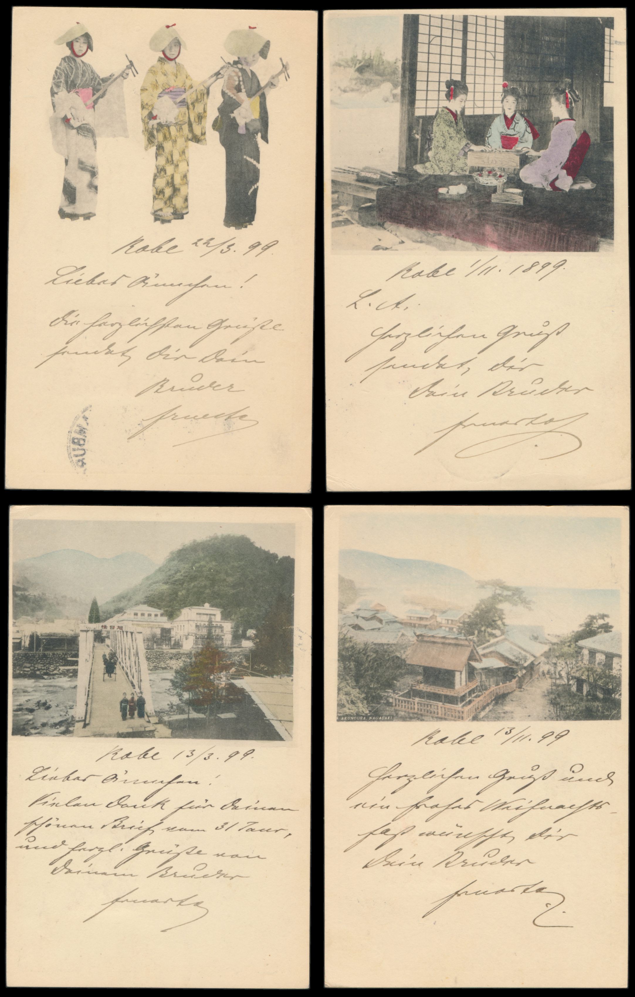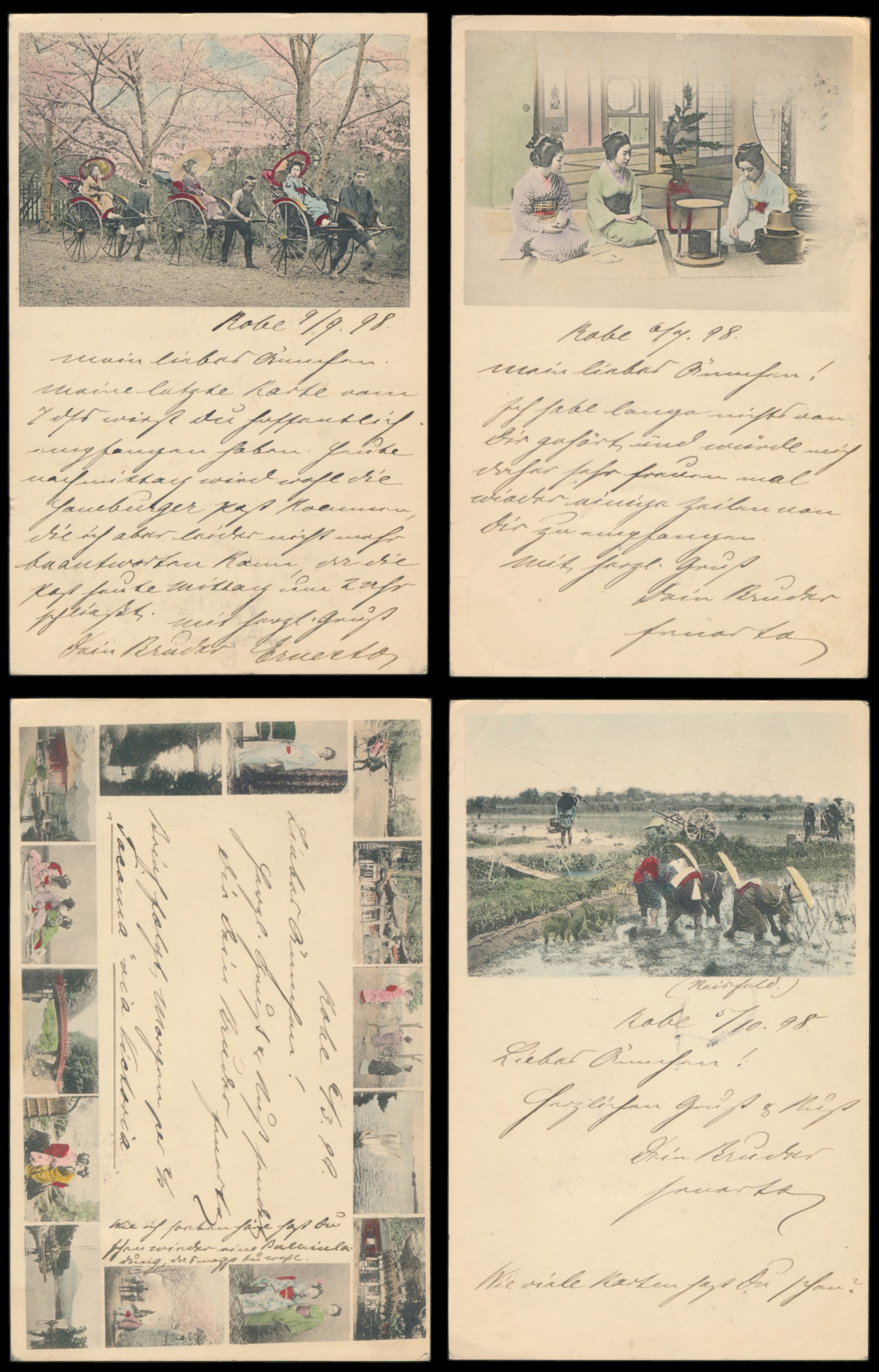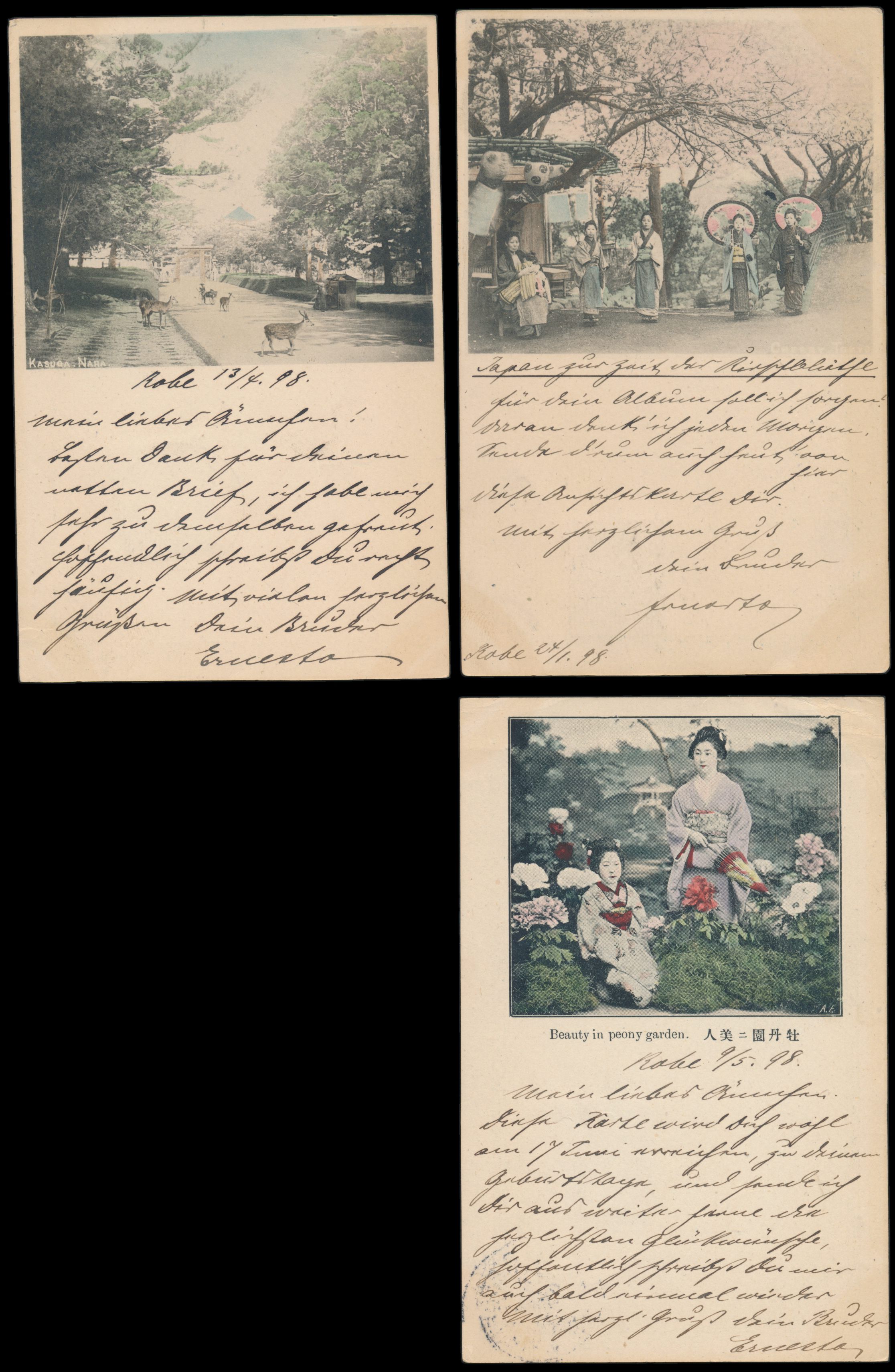 Lot von sieben 1 Sen-Ganzsachen mit rückseitig verschiedenen mehrfarbigen Bildern, alle mit Zusatzfrankatur 3 Sen Koban, alle mit Stempel Kobe / Japan 1898 via San Francisco oder Vancouver nach Deutschland, eine Korrespondenz, Bedarf, gute Erhaltung