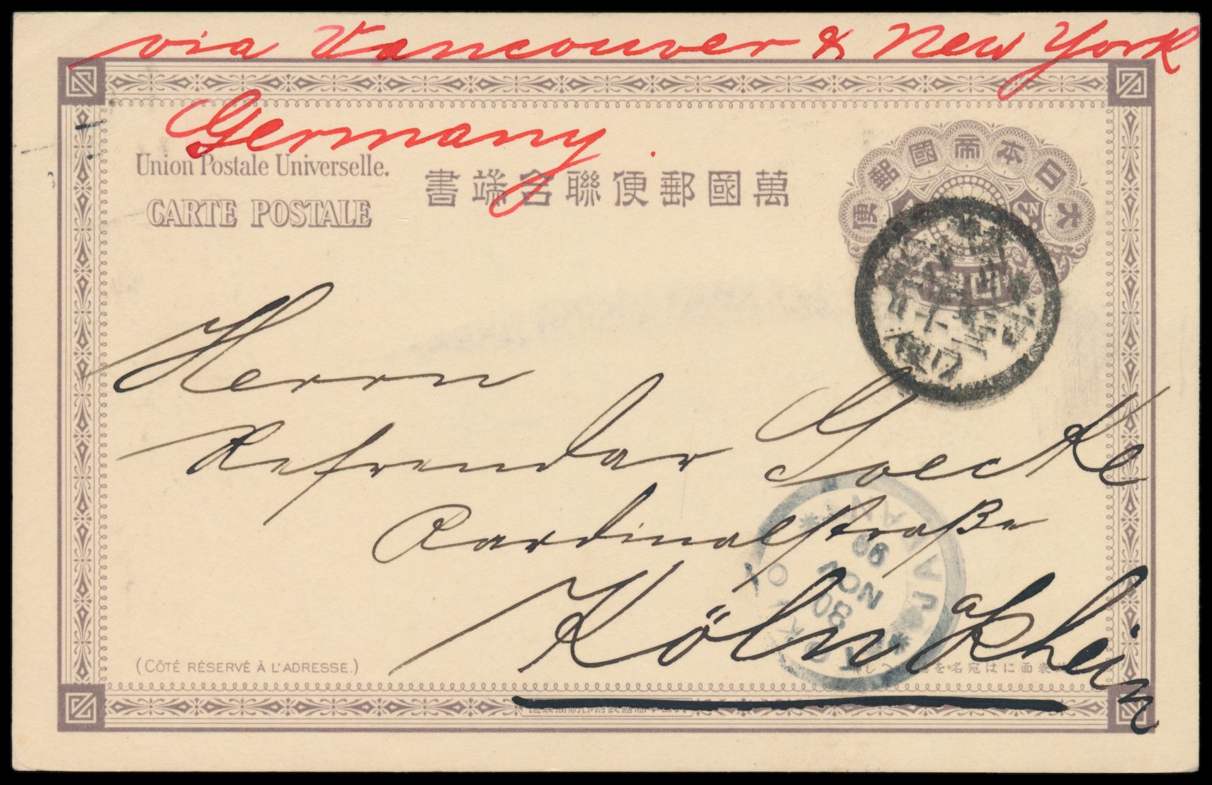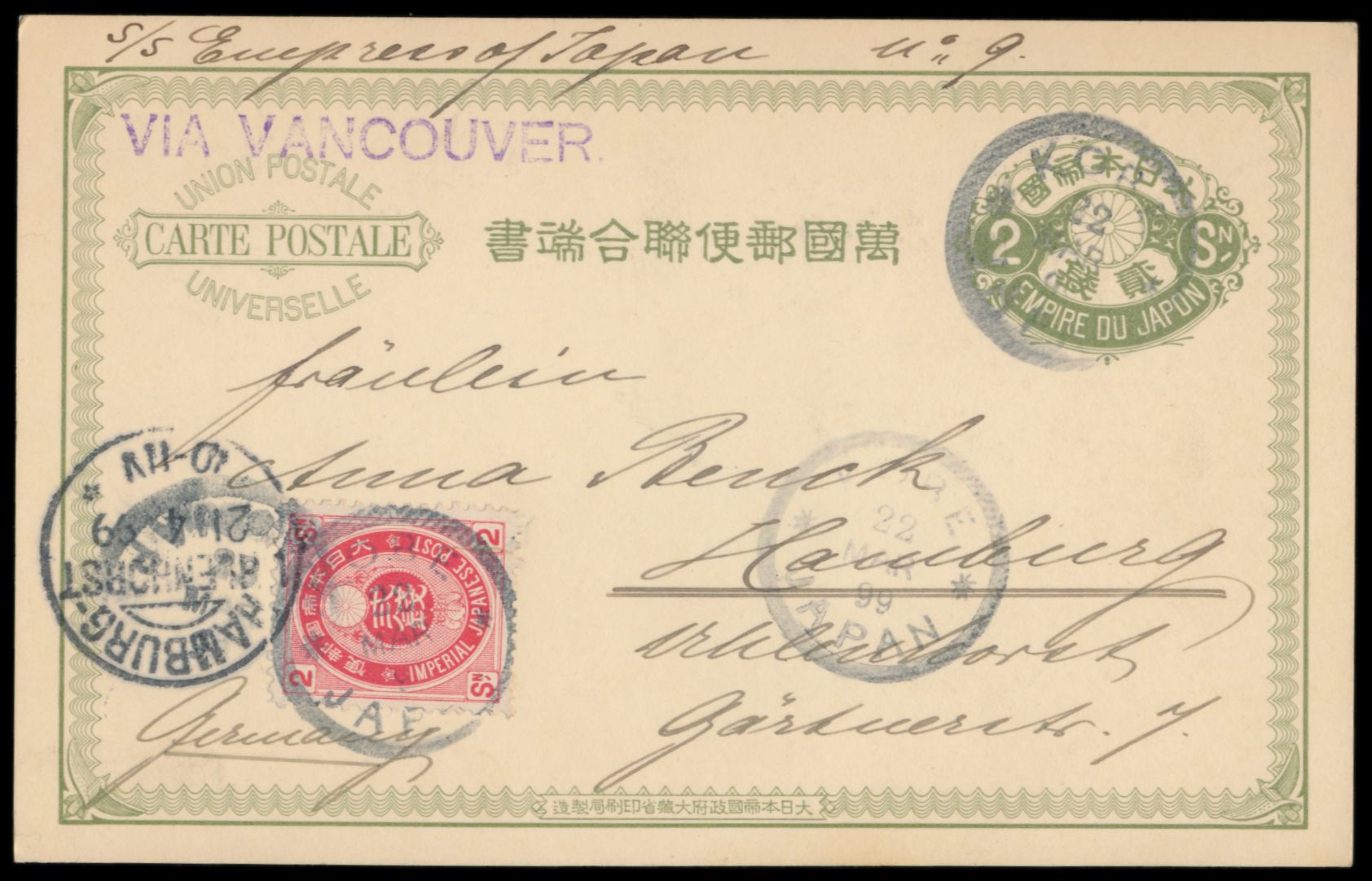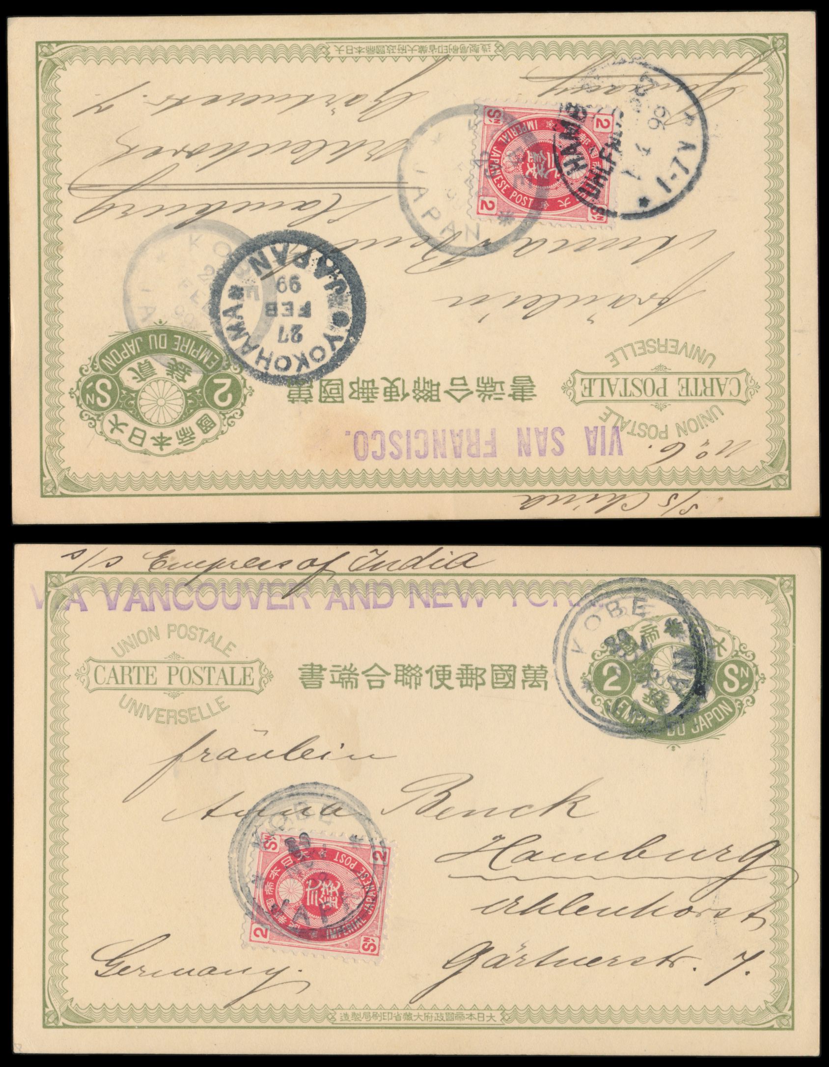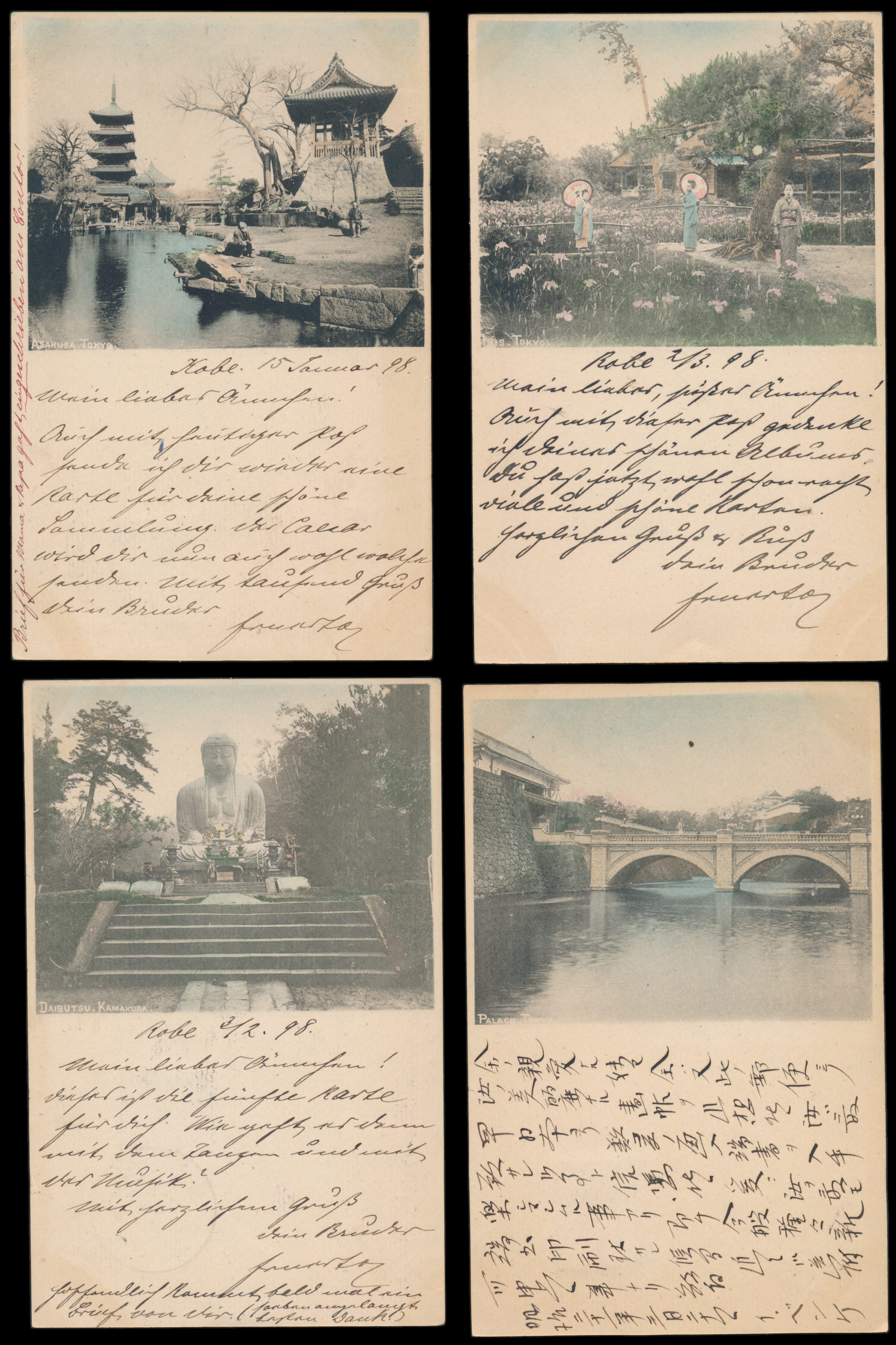 Lot von zehn 2 Sen-Ganzsachen mit rückseitig verschiedenen mehrfarbigen Bildern, alle mit Zusatzfrankatur 2 Sen Koban, alle mit Stempel Kobe / Japan 1898 via San Francisco oder Vancouver nach Deutschland, eine Korrespondenz, Bedarf, gute Erhaltung