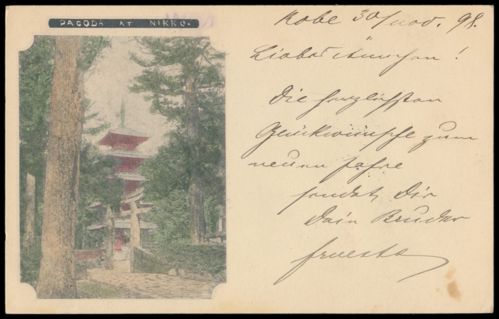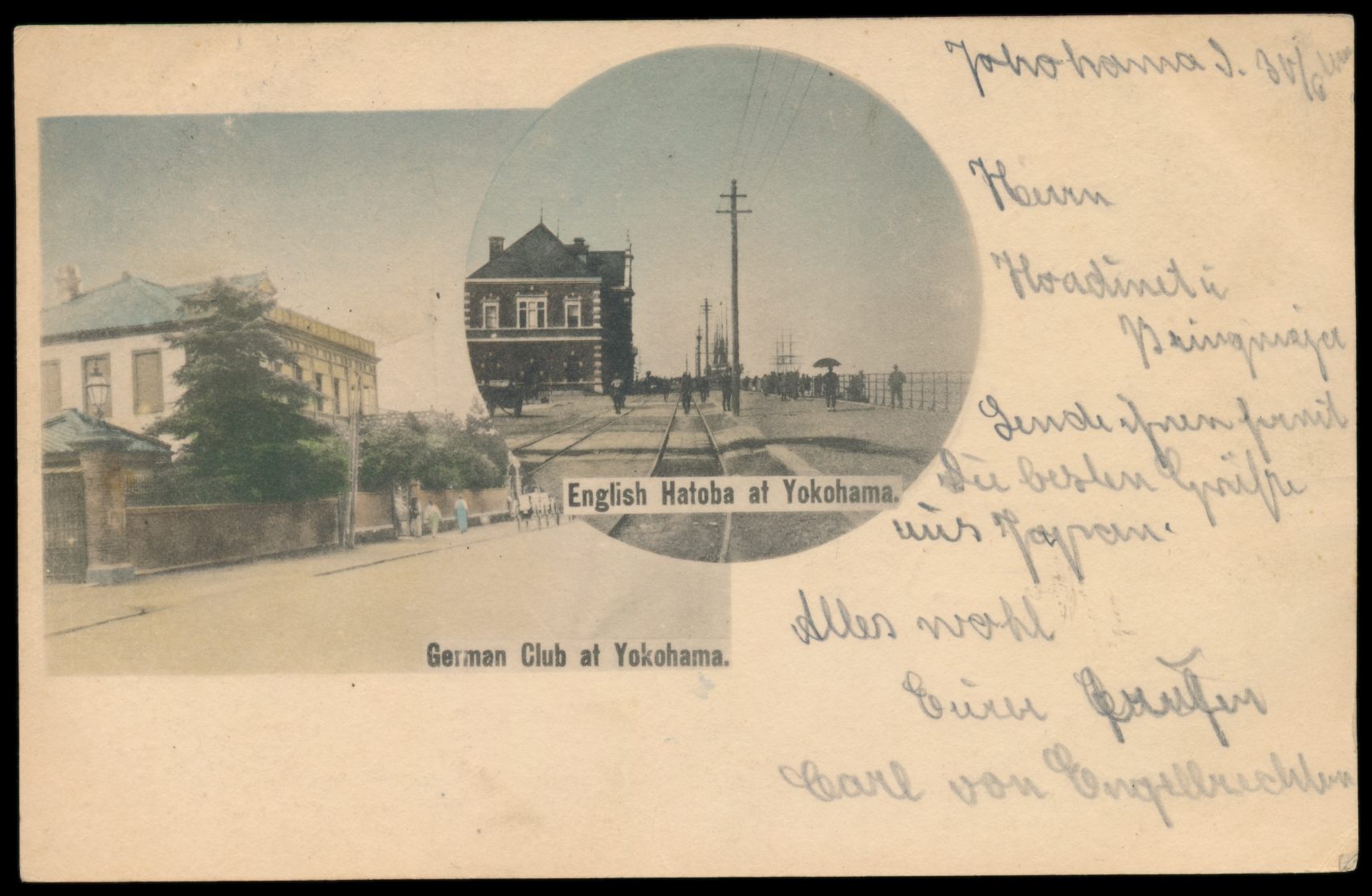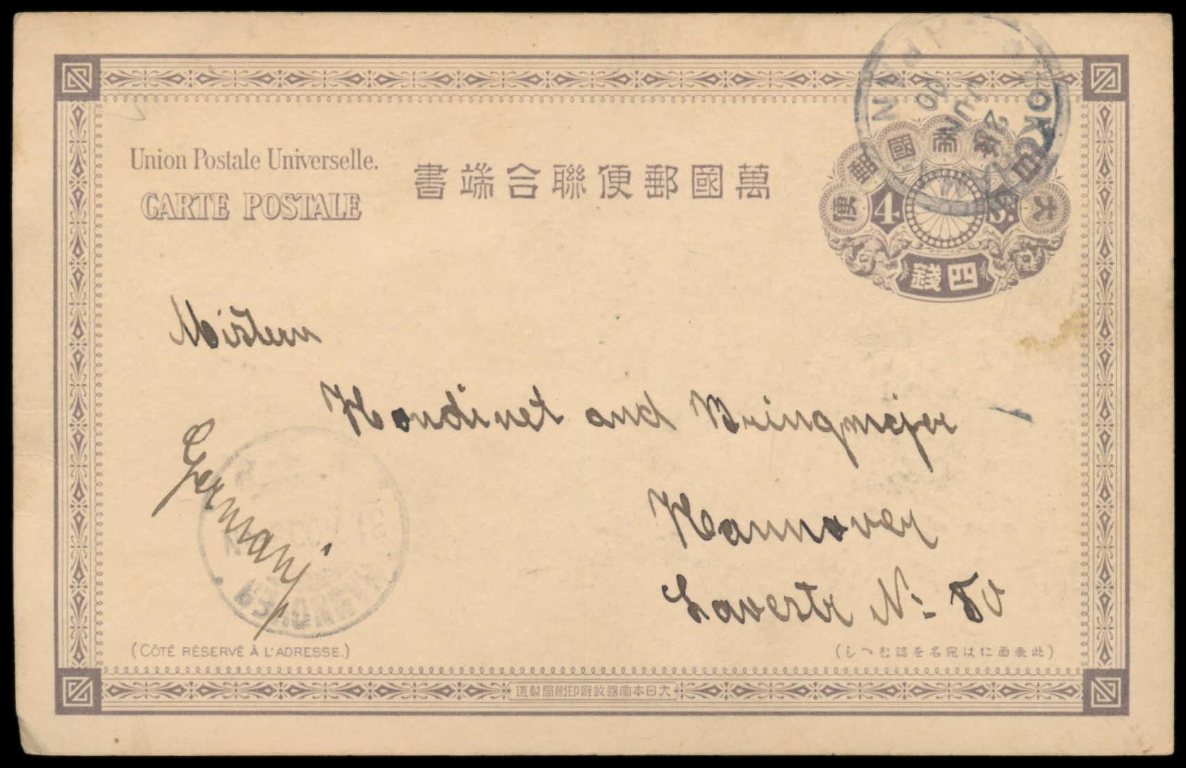 Ganzsache 4 Sen mit rückseitig zwei mehrfarbigen Bildern: German Club und English Hatoba at Yokohama, Stempel Yokohama / Japan 28.6.00, nach Deutschland, Ankunftstempel Hannover 31.7.00, Bedarf