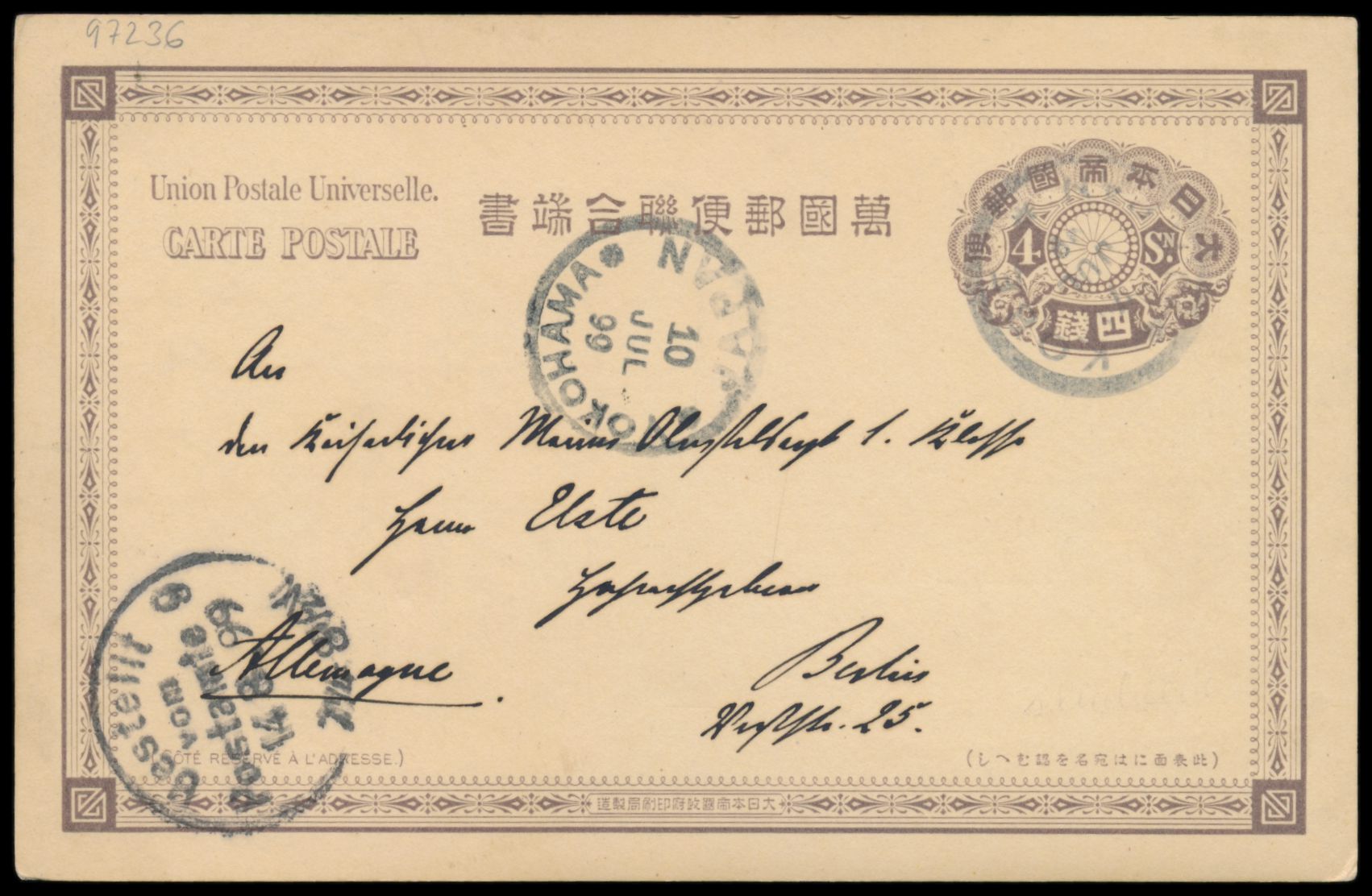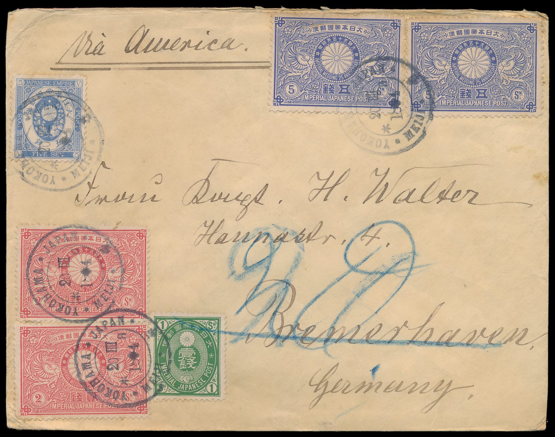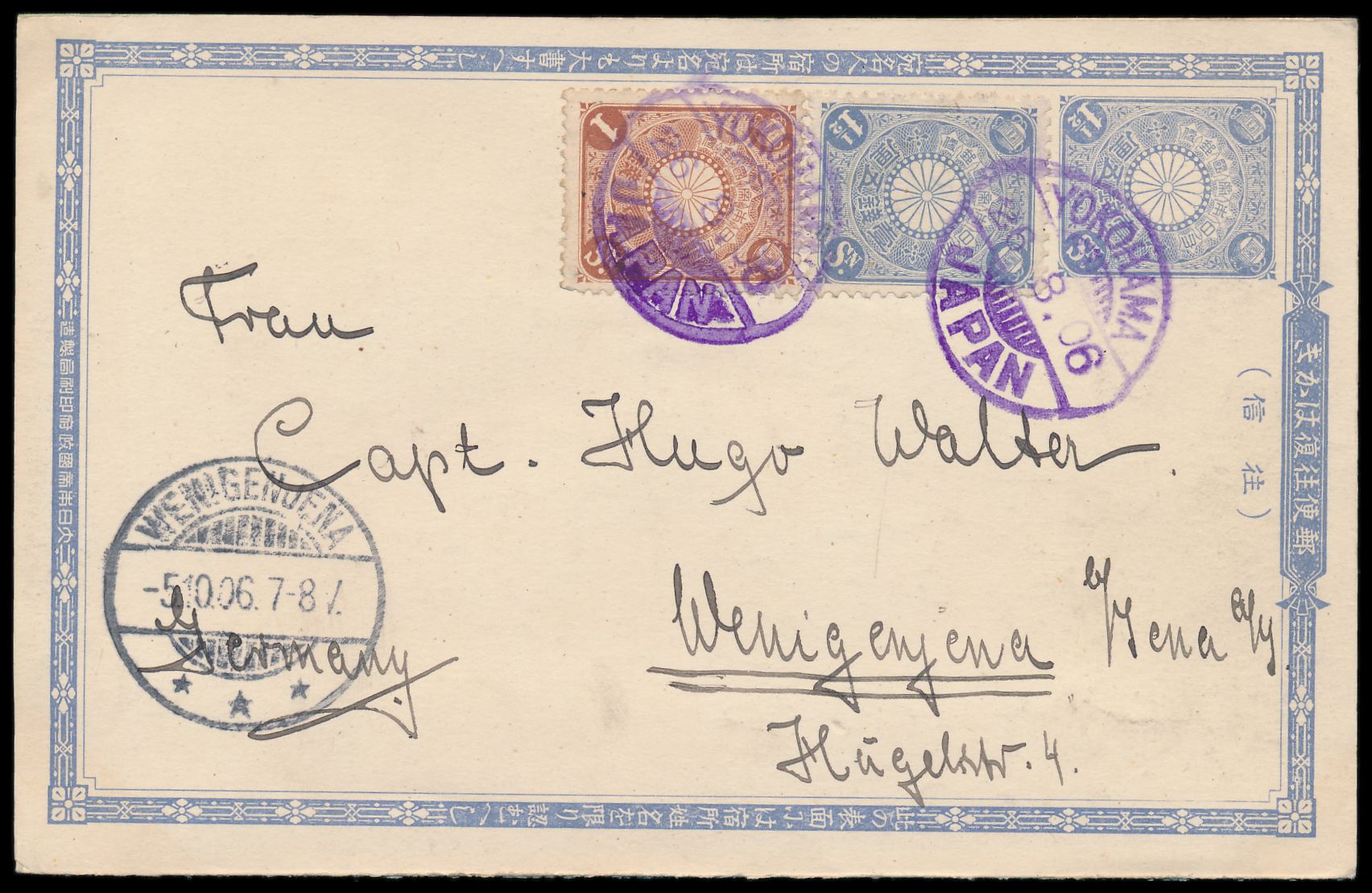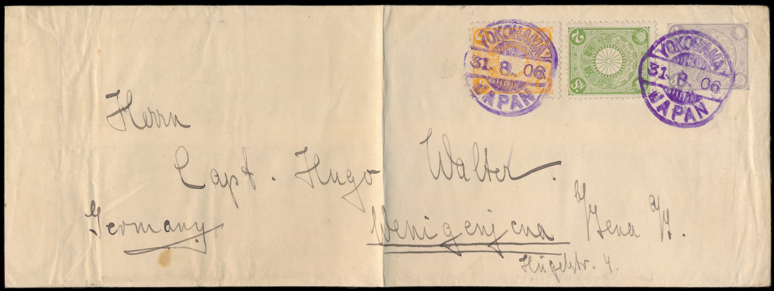 Ganzsachen-Umschlag 3 S. Langformat mit Zusatzfrankatur 2 und 5 S. Kiku-Serie portorichtig nach Deutschland, Stempel Yokohama 31.8.06, Absender "... German Ship Niobe ...", Bedarf, Mittelbug