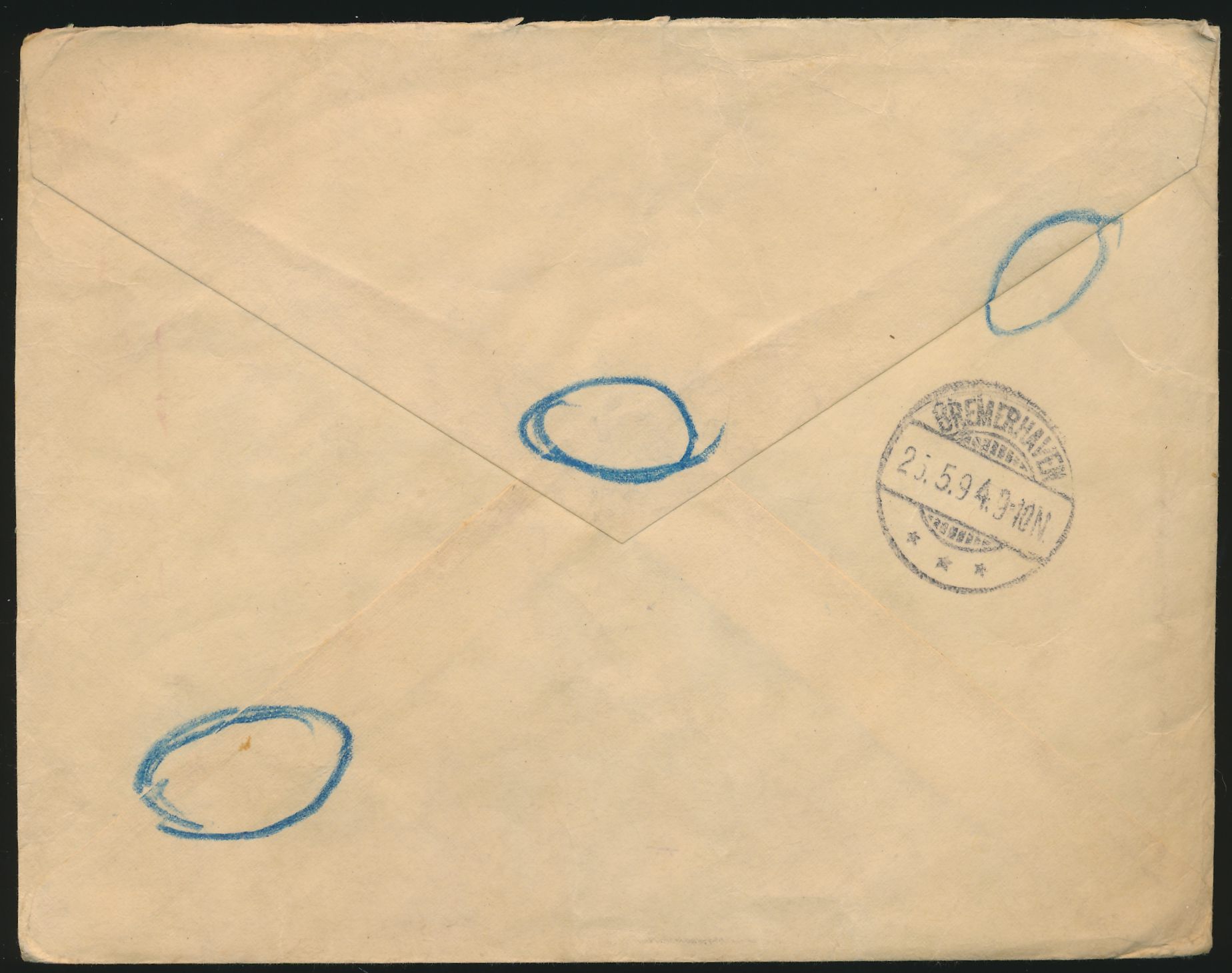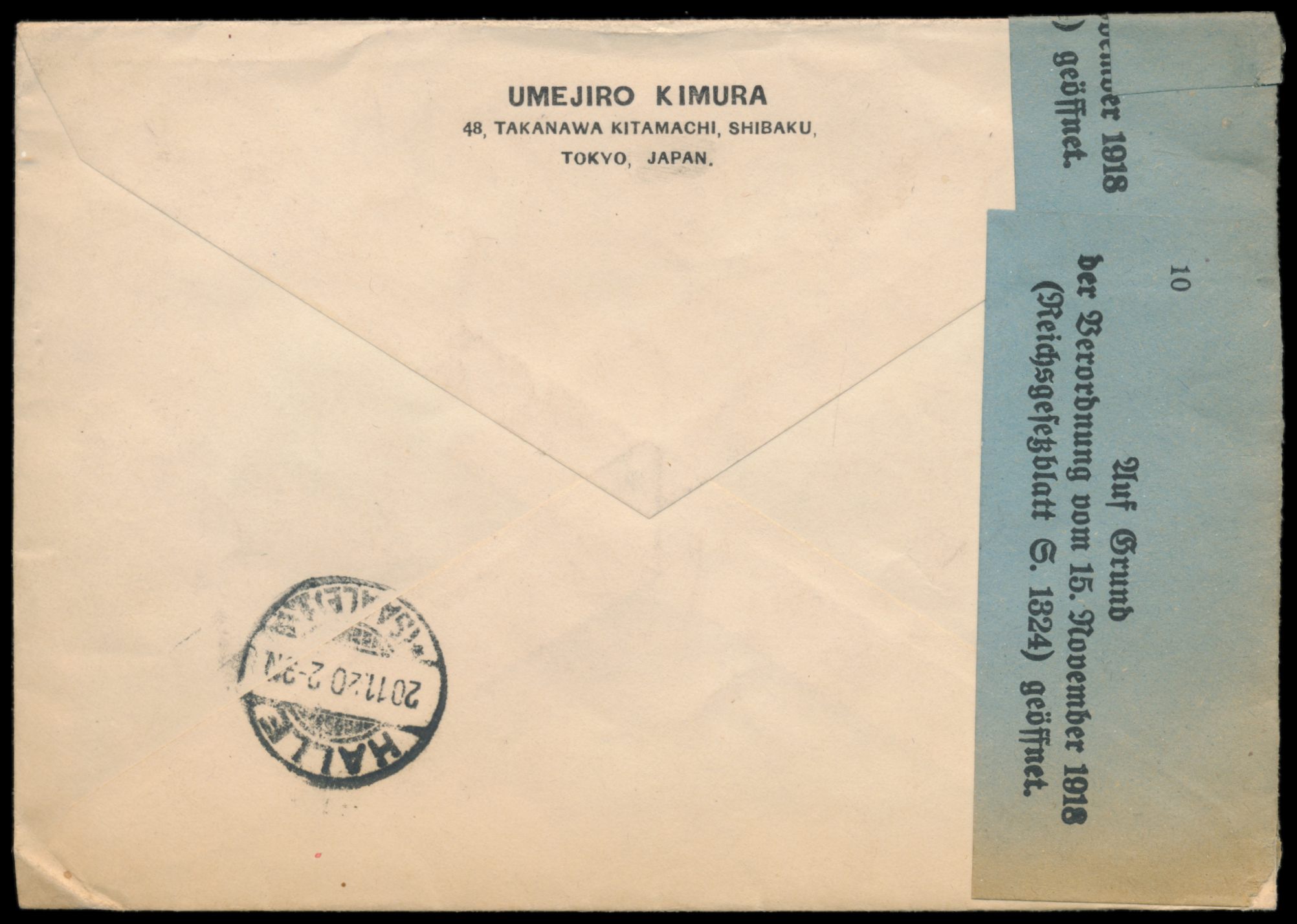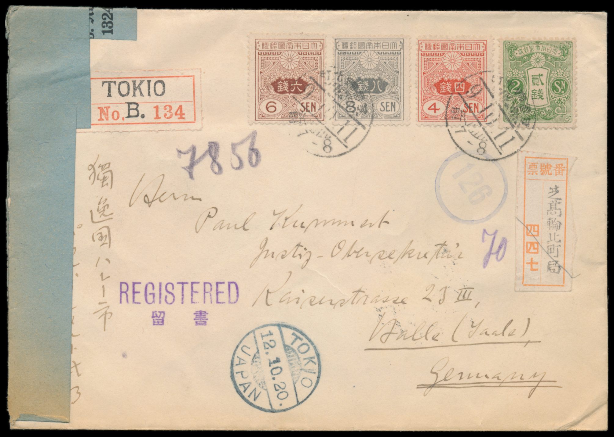 Tazawa (Faserpapier) 2, 4, 6 und 8 Sen auf Einschreibbrief mit japanischem Stempel 11.10.9 (1920) und R-Zettel Bahnhof Shiba Takanawa Kitachi nach Deutschland, Durchgangstempel Tokio 12.10.20 und internationaler R-Zettel Tokio, links blauer Verschlusszettel der Postüberwachungsstelle Nr. 10, Ankunftstempel Halle (Saale) 20.11.20, portorichtig, Bedarf