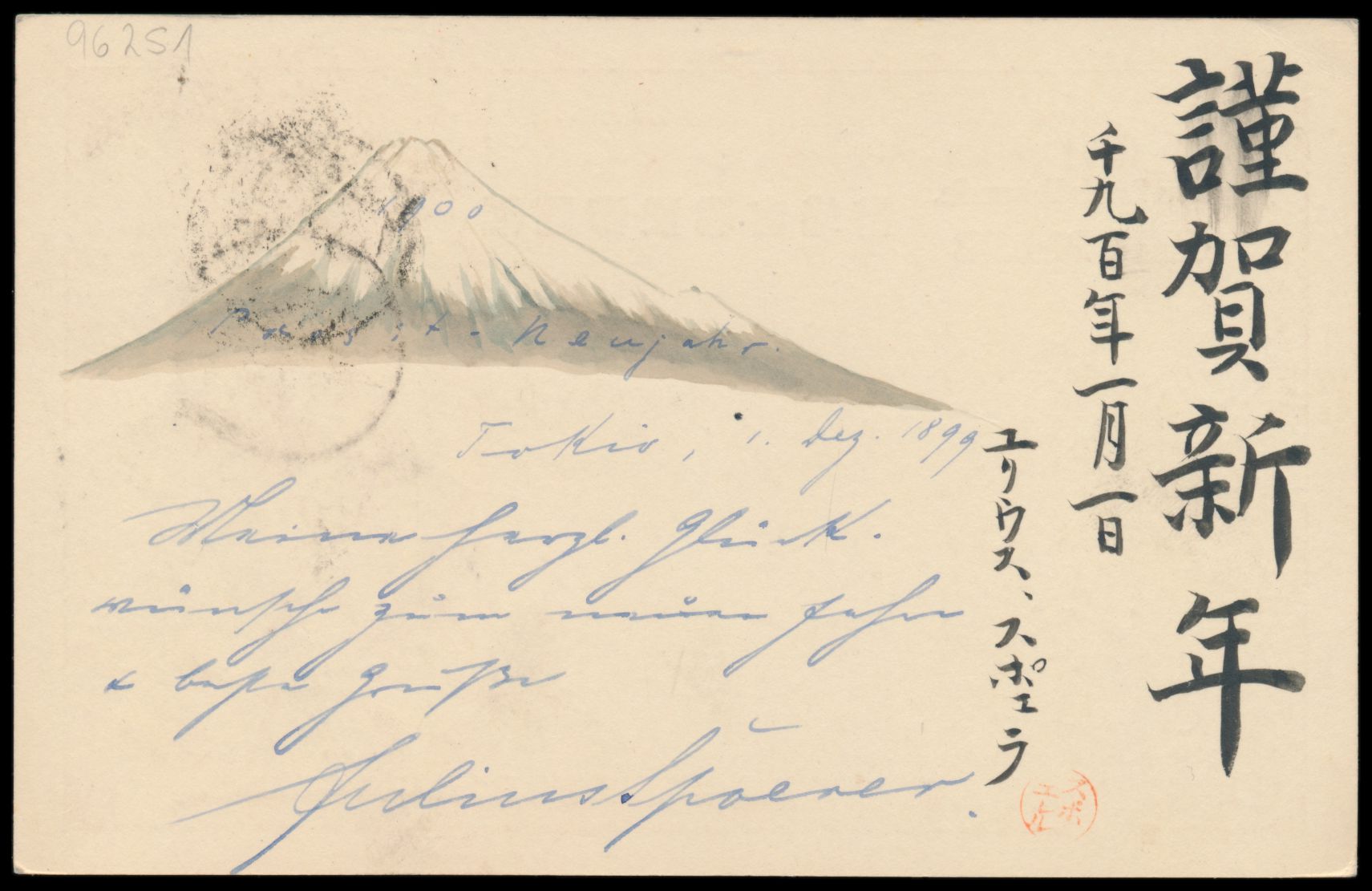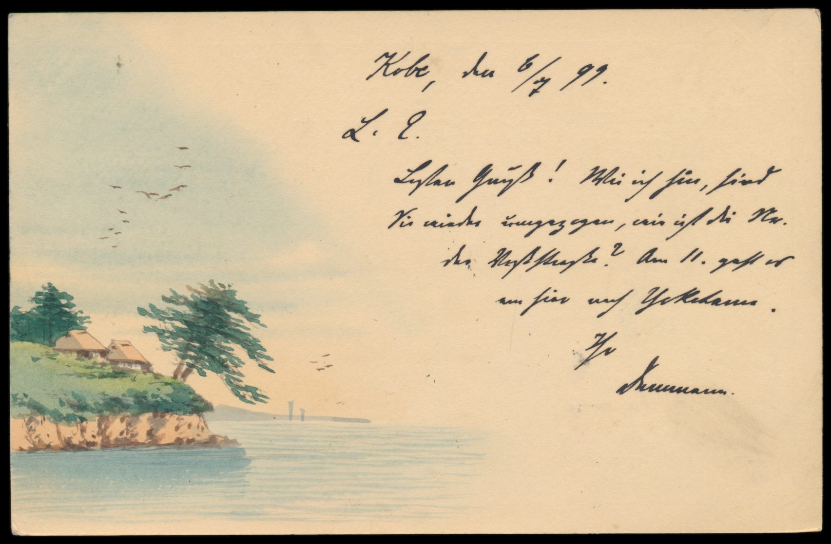 Ganzsache 4 Sen mit rückseitig mehrfarbiger Tuschezeichnung (Landschaft) nach Deutschland, Stempel Kobe / Japan 7.7.99, Durchgangsstempel Yokohama 10.7.99, Ankunftstempel Berlin 14.8.99, Bedarf