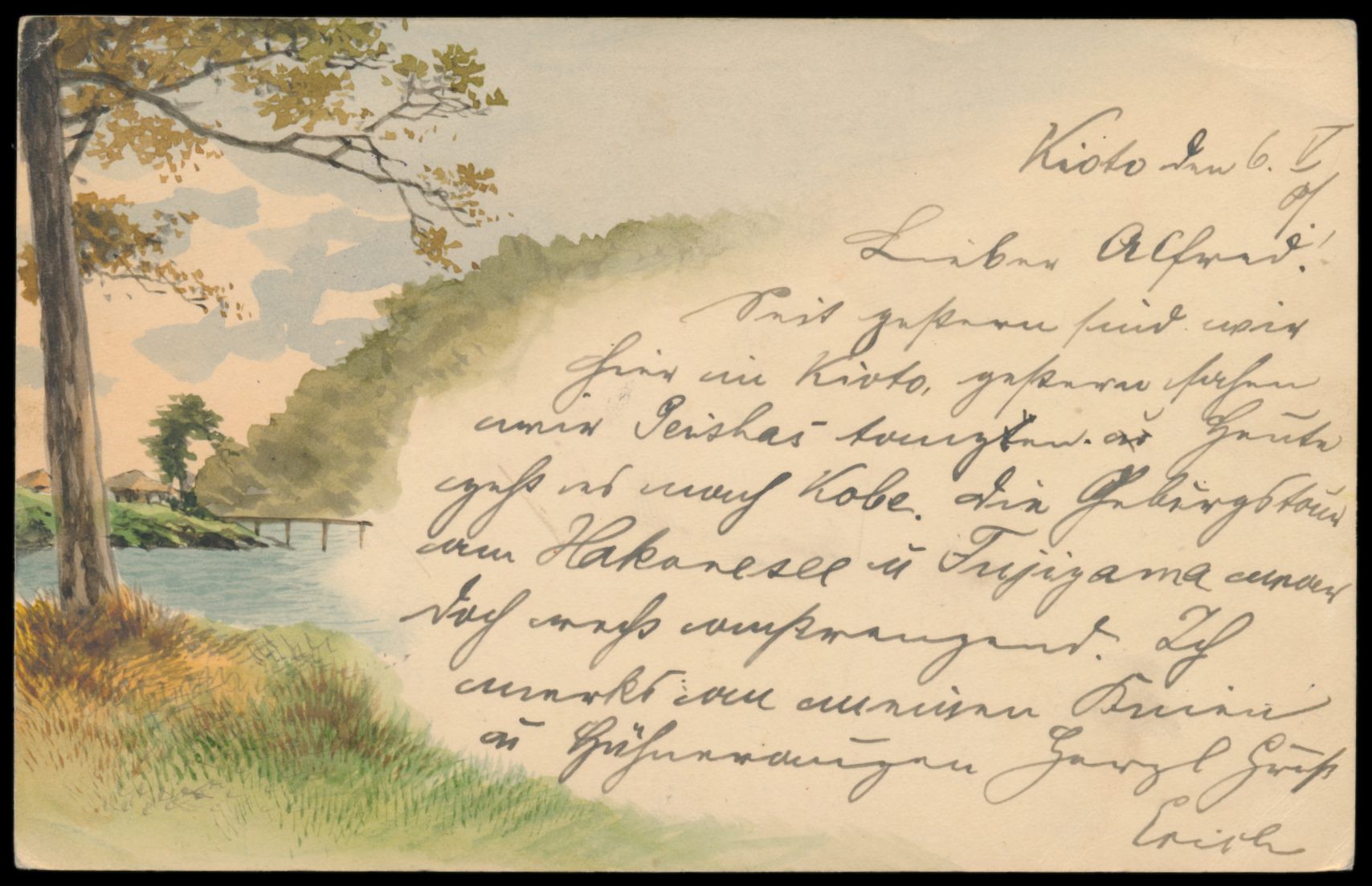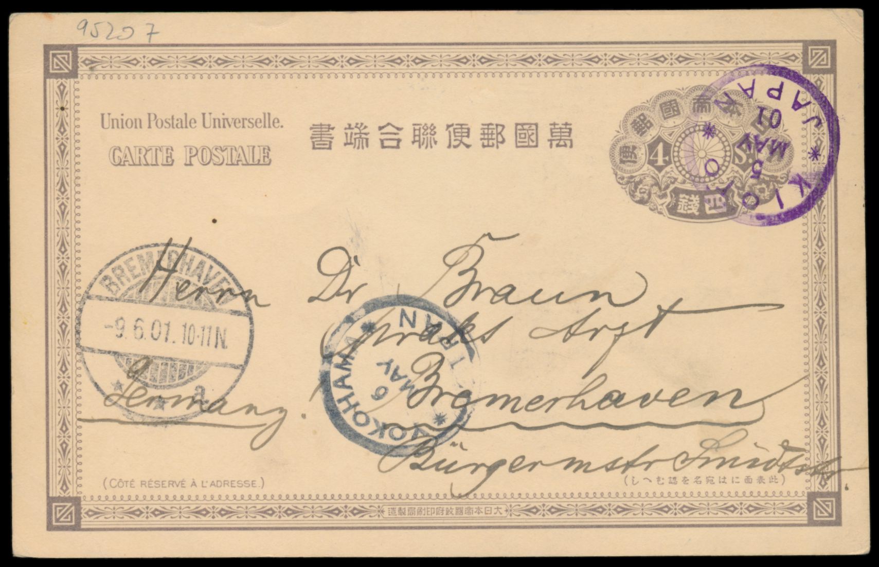 Ganzsache 4 Sen mit rückseitig mehrfarbiger Tuschezeichnung (Landschaft) nach Deutschland, violetter Stempel Kioto / Japan 5.5.01, Durchgangsstempel Yokohama, Ankunftstempel Bremerhaven 9.6.01, Bedarf