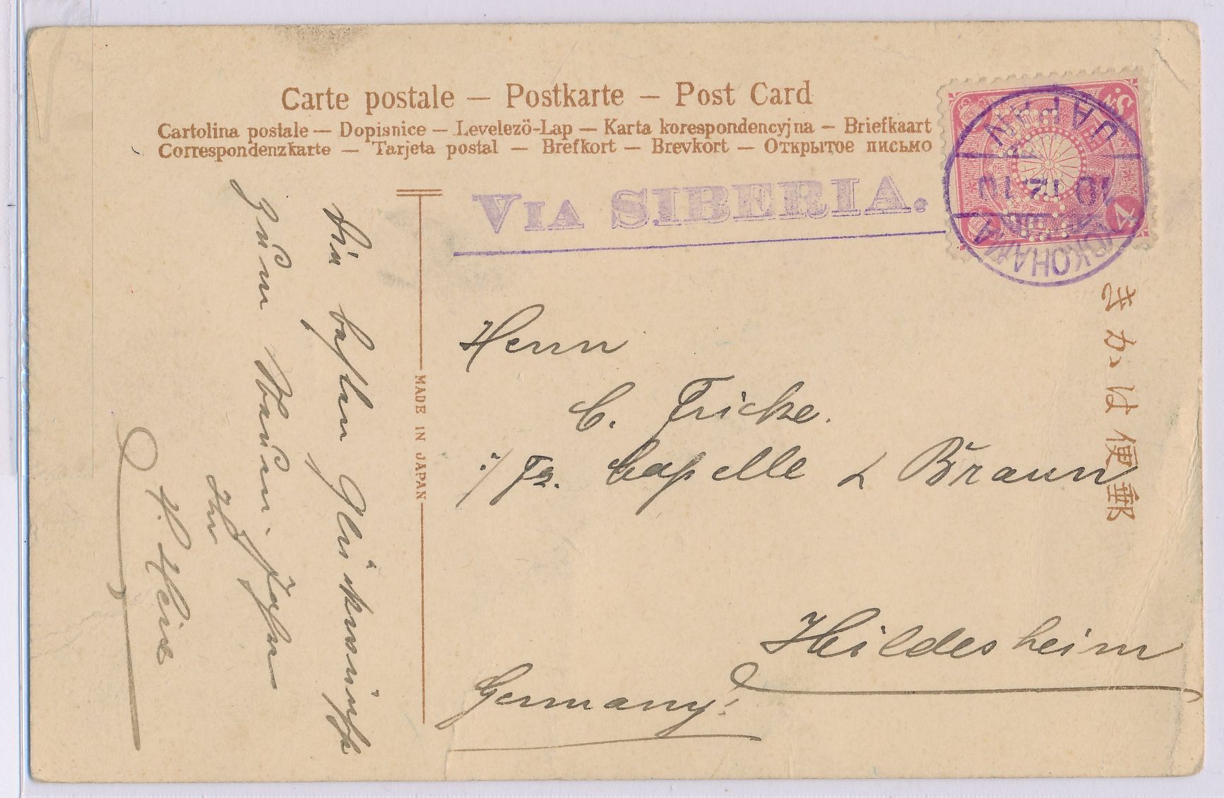 4 Sen Kiku mit Perfin "W & Co." auf Ansichtskarte "via Sibirien" nach Deutschland, Stempel Yokohama / Japan 10.12.10