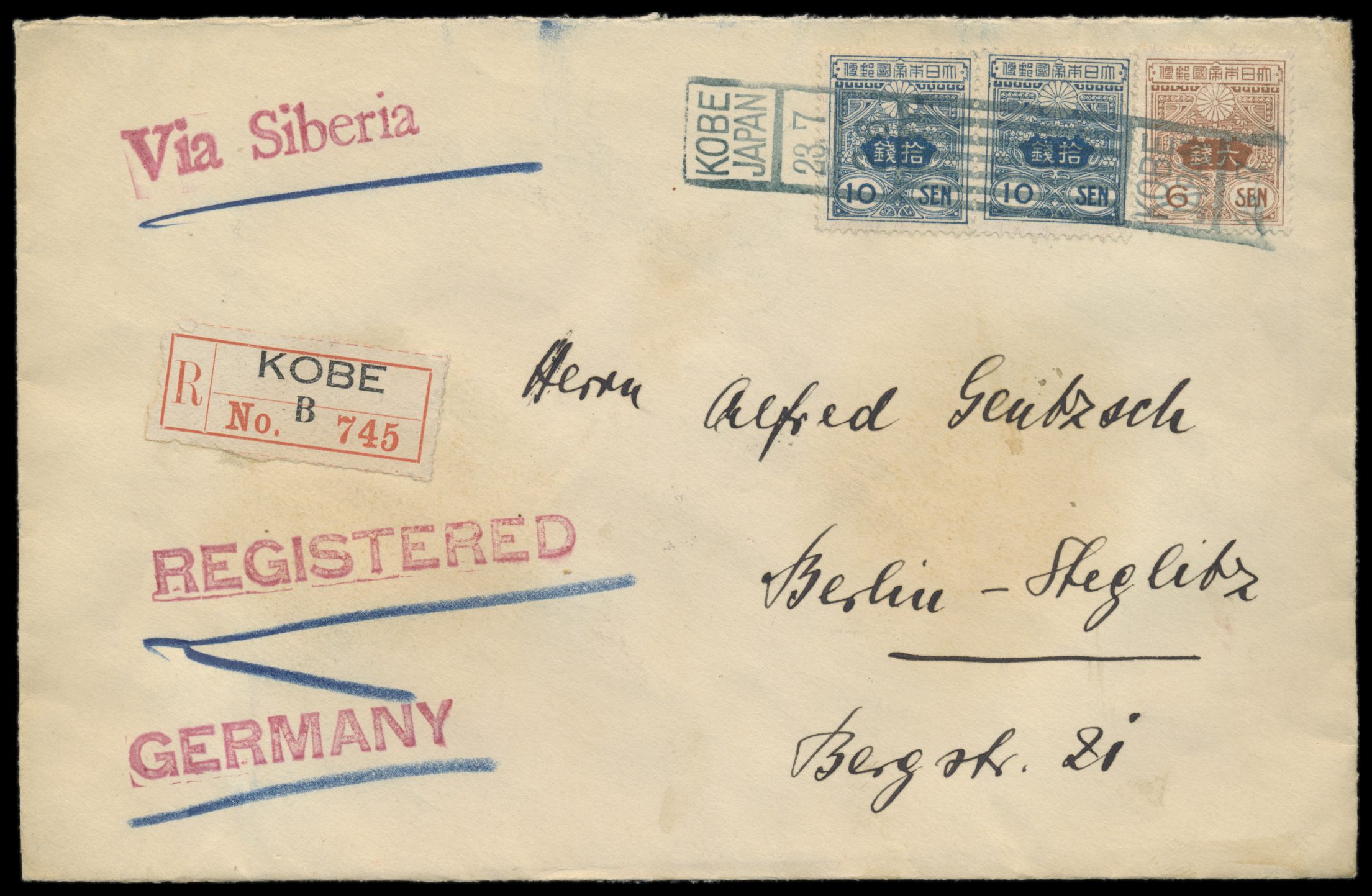 Tazawa 6 Sen und 2 x 10 Sen (Faserpapier) auf Auslands-Einschreibbrief "via Siberia" nach Deutschland, entwertet mit Rollstempel Kobe / Japan 23.7.26, Ankunftstempel Berlin 12.8.26, Bedarf