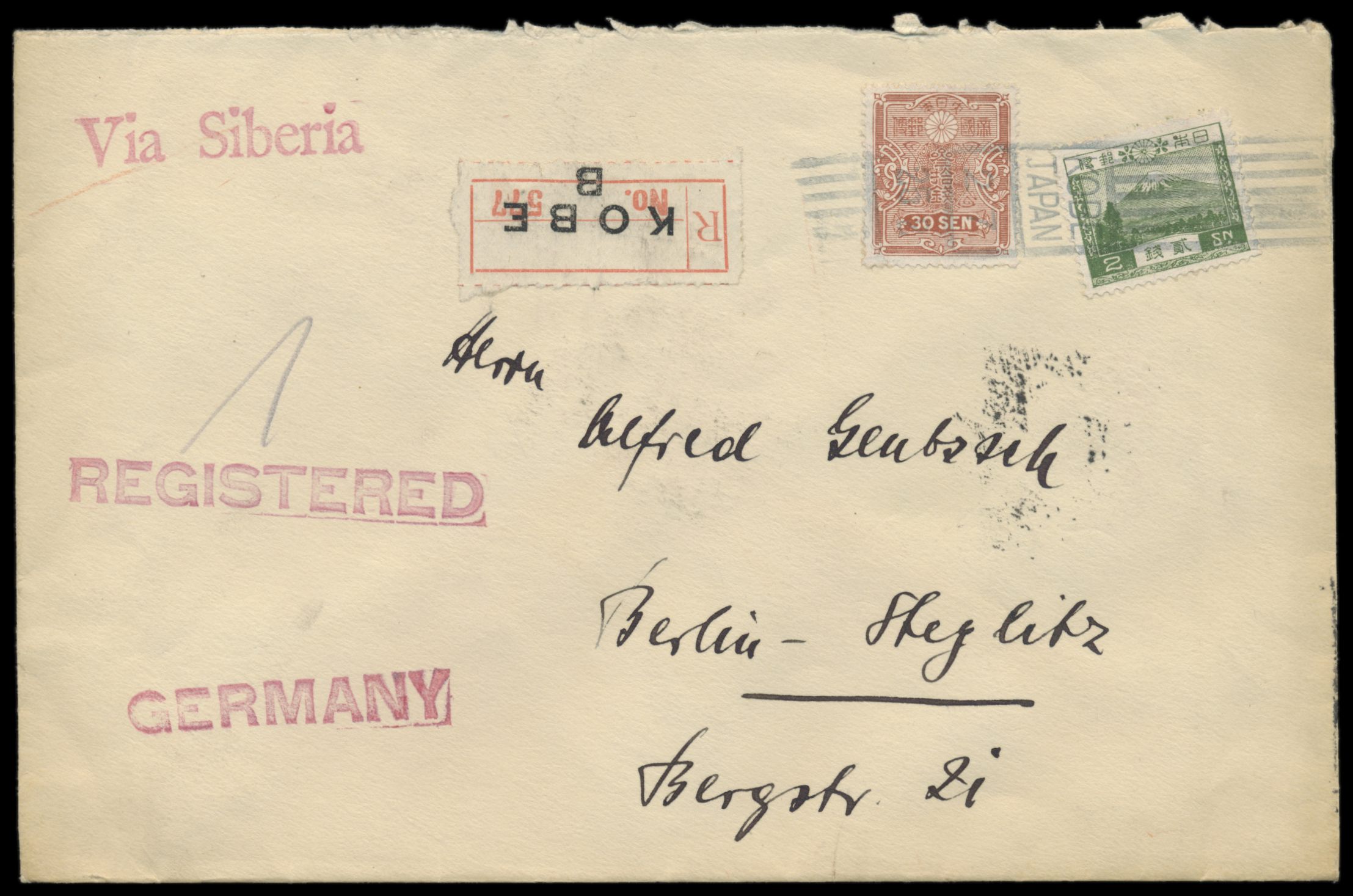 Tazawa 30 Sen (Faserpapier) und 2 Sen Fuji (Scenery) auf Auslands-Einschreibbrief "via Siberia" nach Deutschland, entwertet mit Rollstempel Kobe / Japan 25.2.27, Ankunftstempel Berlin 16.3.27, Bedarf