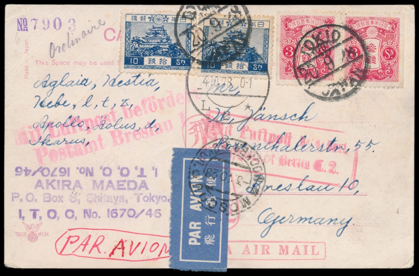 waagerechtes Paar 3 Sen (aus Heftchen, links bzw. rechts ungezähnt) mit 2 x 10 Sen auf Luftpostkarte nach Deutschland, Luftpost ab Moskau, Stempel Tokio / Japan 20.9.28, auf dem Landweg via Sibirien nach Moskau, ab Moskau mit DERULUFT nach Berlin, Durchgangsstempel Moskau 3.10.28 und Berlin C 2 4.10.28, rote MLb-Stempel von Berlin C. 2. und Breslau