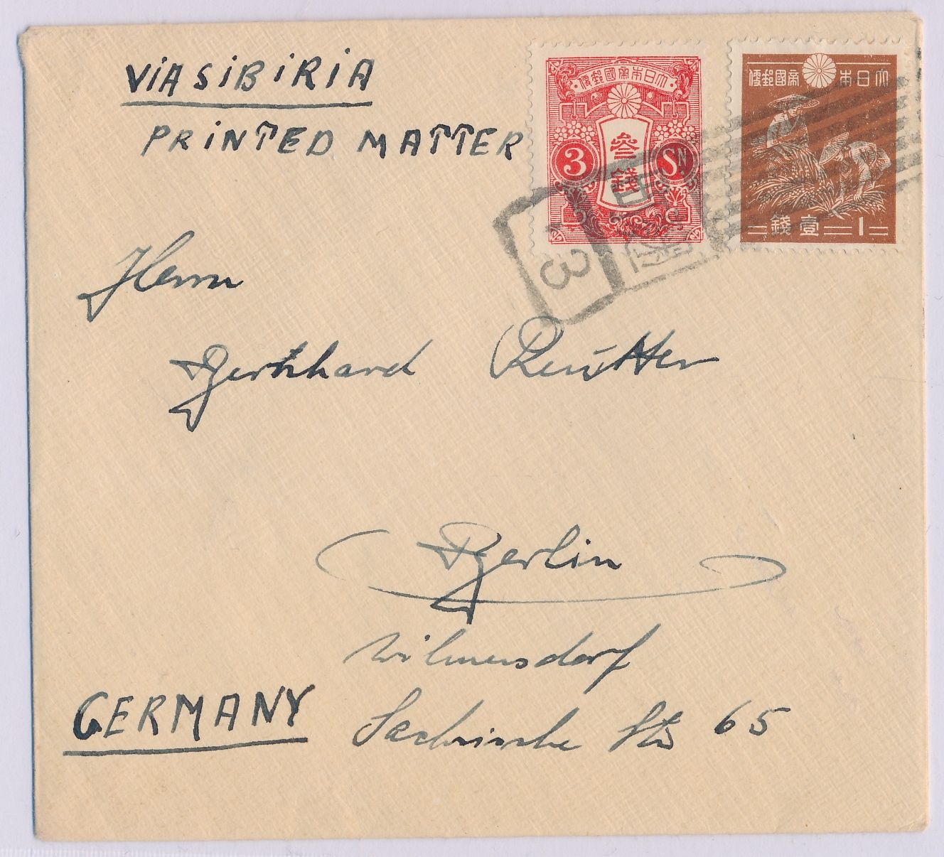Tazawa 3 Sen und Showa 1 Sen mit Rollstempel auf Drucksache "via Sibirien" nach Berlin