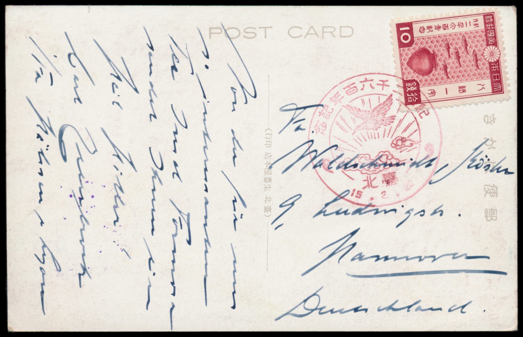Sondermarke "2600. Jahrestag der Gründung des Kaiserreichs" 10 Sen auf Postkarte mit rotem Sonderstempel Beidai 15.2.22 (1940) zum selben Anlass, nach Deutschland, geschrieben auf Formosa, Bedarf