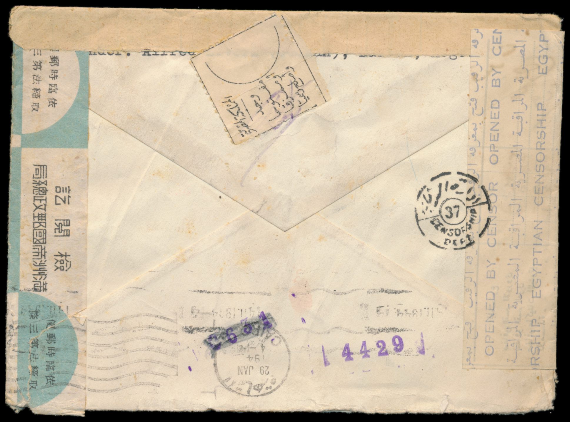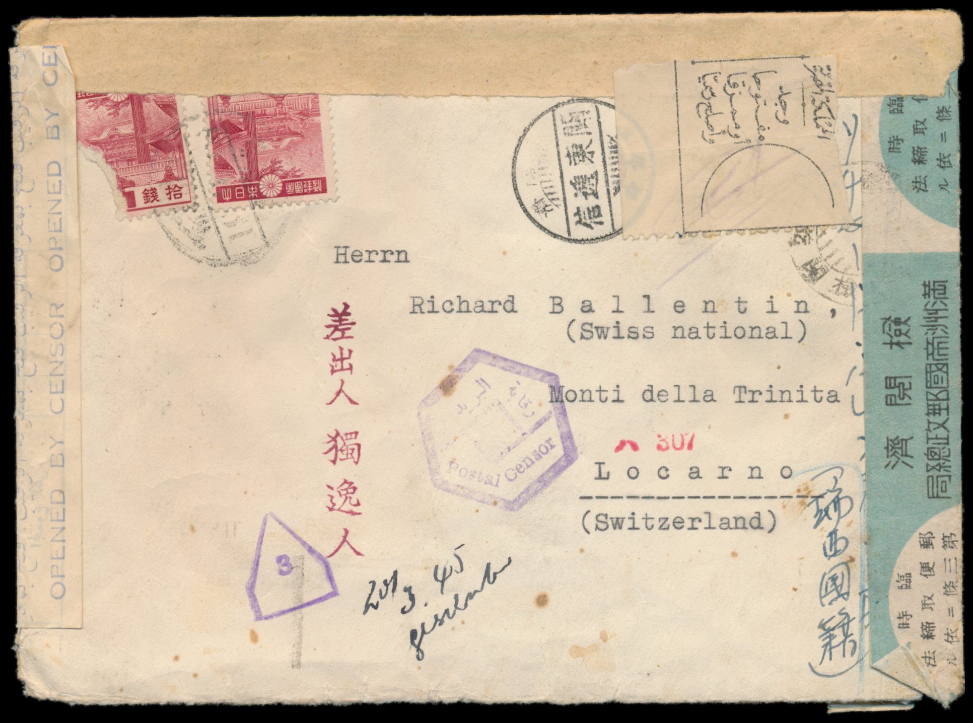 2 x Showa 10 Sen (eine Marke stark beschädigt) auf Brief aus Dairen 1944 via Sibirien und Türkei In die Schweiz, neben der Anschrift roter Hinweisstempel "Absender deutsch", rechts zweifarbiger japanischer Zensurverschlusszettel, rückseitig Durchgangsstempel Istanbul 14.11.44, links ägyptischer Zensurverschluss und Zensurstempel, rückseitig Durchgangsstempel Cairo 29.1.45, handschriftlicher Eingangsvermerk 20.3.45, Bedarf