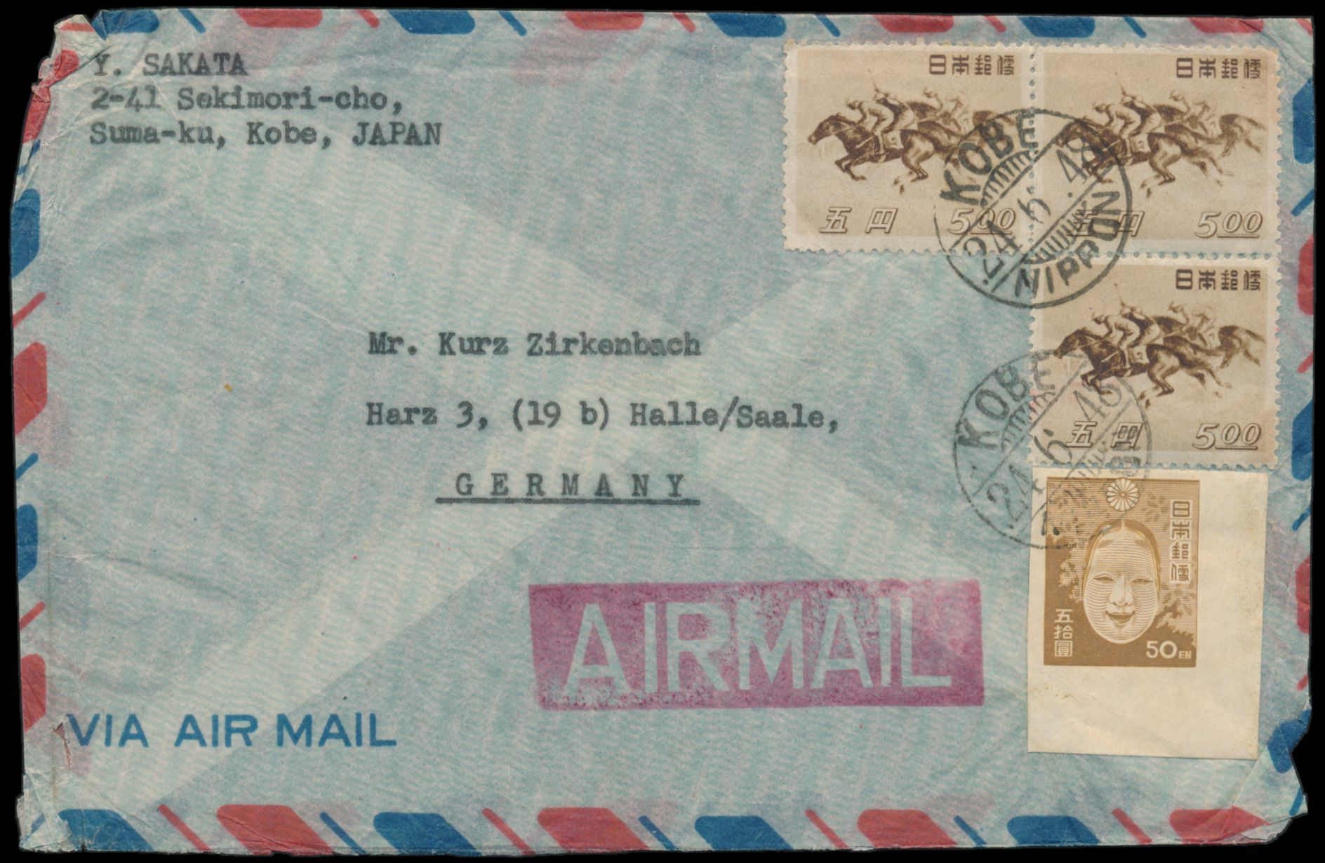 Showa 50 Y. ungezähnt (1946) mit Eckrand rechts unten und 3 x 5 Y. Pferderenngesetze auf Luftpostbrief nach Deutschland, Kammstempel Kobe / Nippon 24.6.48, Bedarf