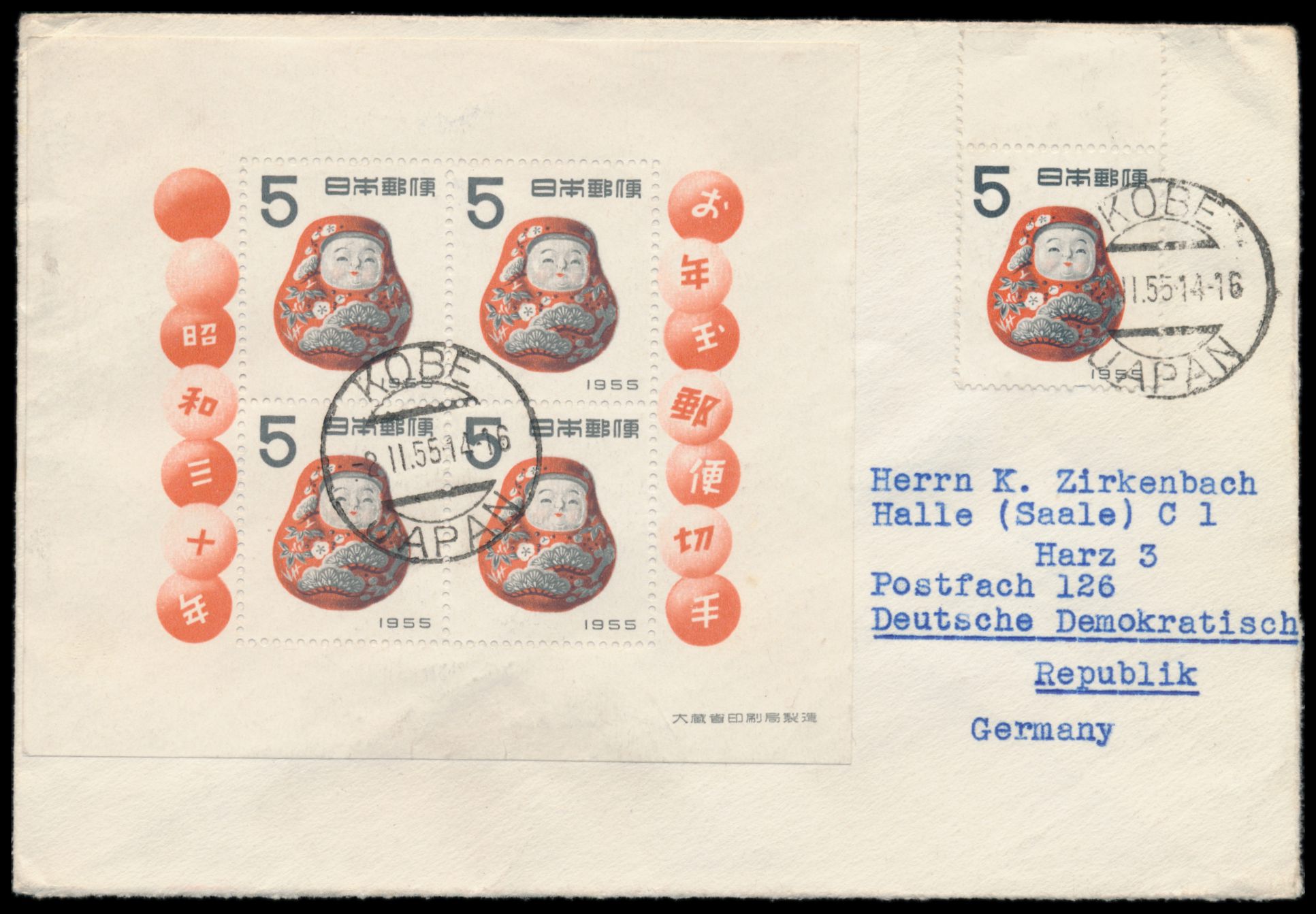 Neujahr 1955 5 Y. (1954): Einzelmarke und Block auf Brief nach Deutschland, Stempel Kobe / Japan 2.2.55, Ankunftsstempel Halle (Saale) 26.3.55. Der Block war der 5. Preis in der Neujahrs-Lotterie und wurde nicht an den Postschaltern verkauft, auf Brief daher sehr selten