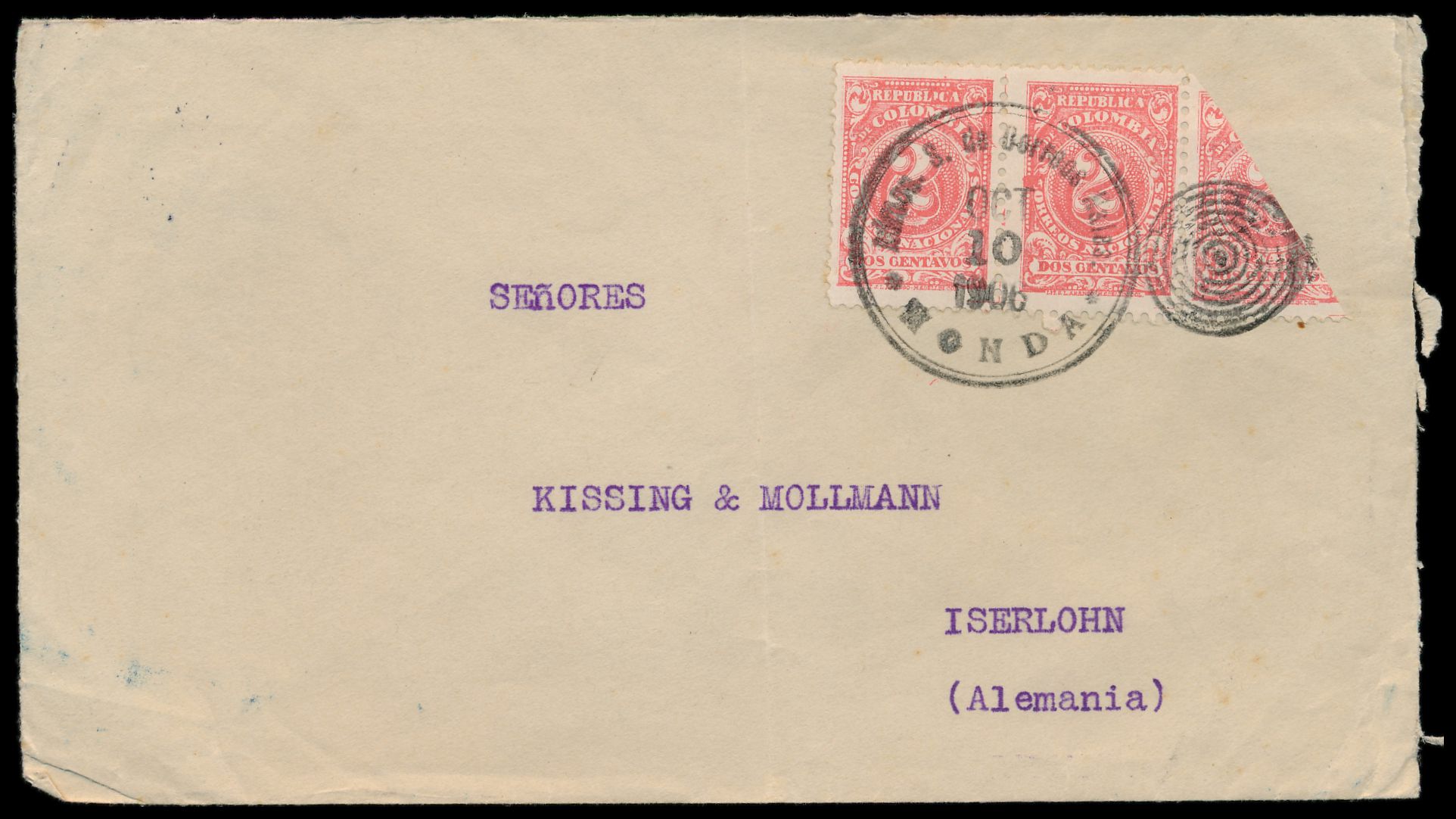 Tumaco, Lokalmarke 0,10 $ auf Brief nach Deutschland, Stempel Tumaco 31.1.1901, Durchgangsstempel Transito Panama 5.2.01, Ankunftstempel Iserlohn 28.2.01, handschriftlicher Nachgebühr-Vermerk 40 Pf. wieder gestrichen, schwacher senkrechter Mittelbug, Bedarf