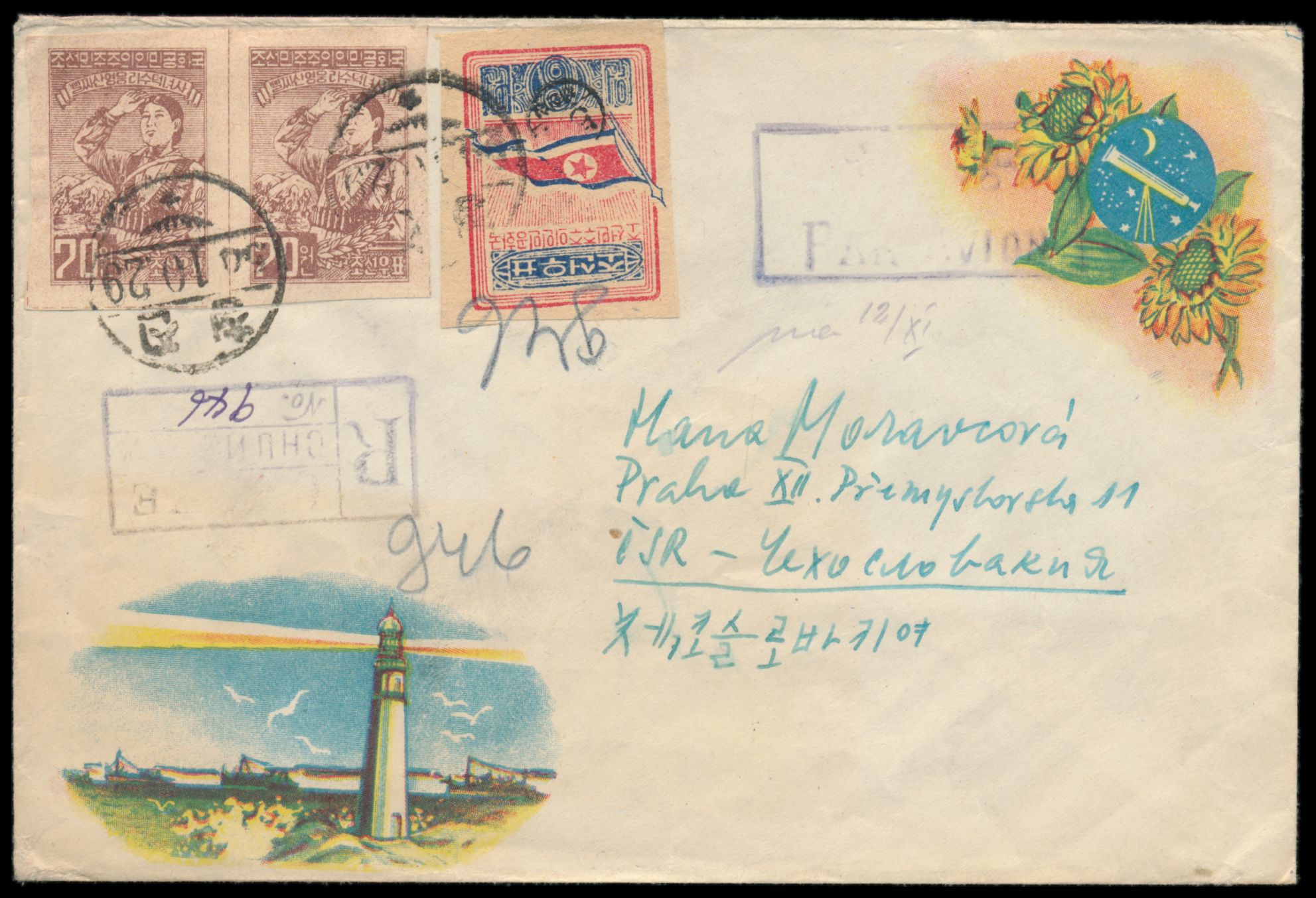Nordkorea, 6 W. "Allgemeine Wahlen" (1949) und 2 x 70 W. "Partisanin Li Su Dok" auf Einschreibbrief (Bildumschlag) 29.10.54 in die CSSR, Ankunftstempel Prag 11.11.54