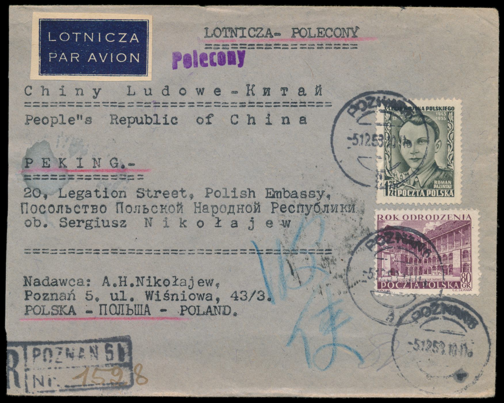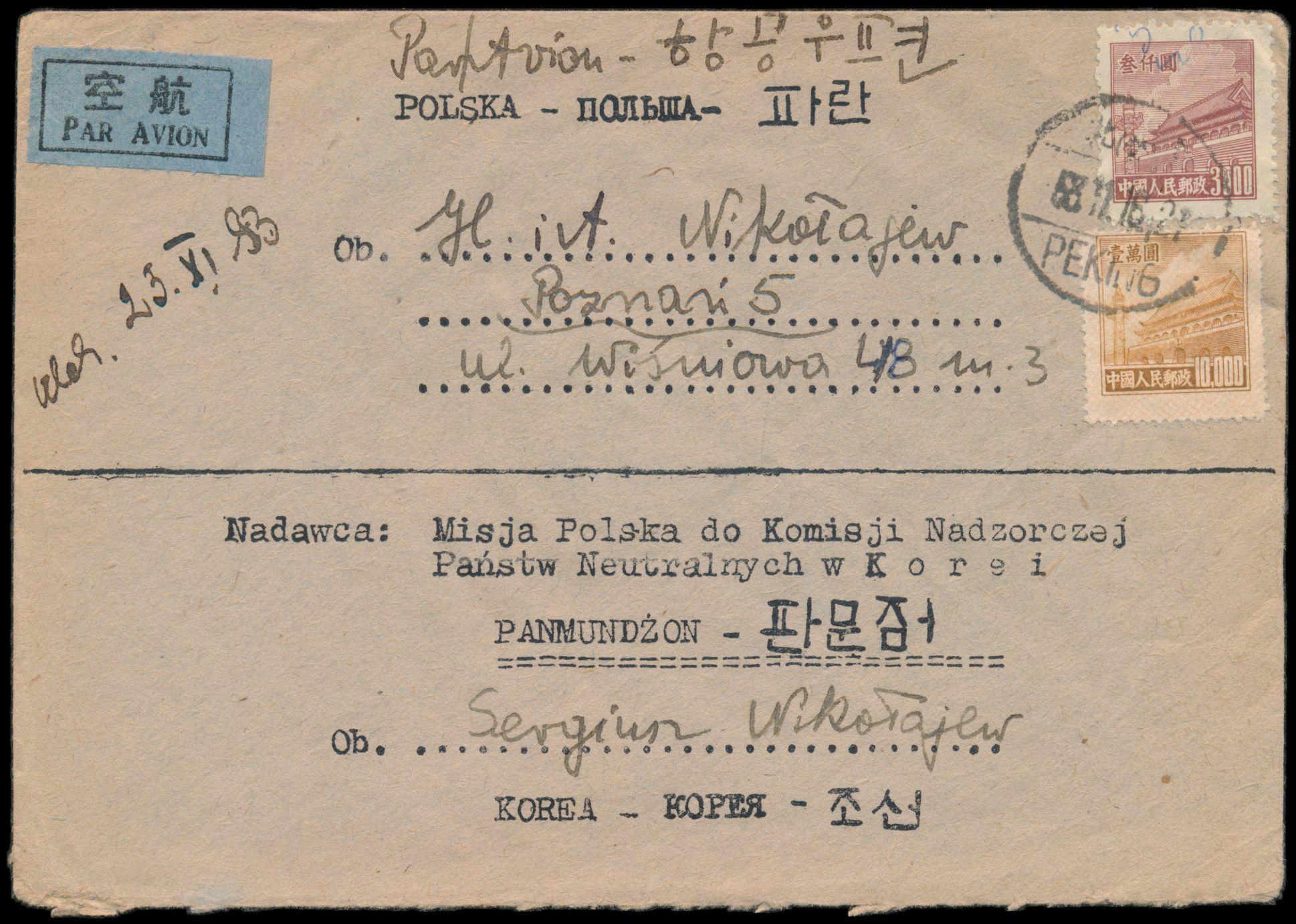 Nordkorea: Brief mit vorderseitigem Absender "Polnische Mission bei der Neutralen Überwachungskommission in Korea - Panmundjon, Ob. Sergiusz Nikolajew" , als Luftpostbrief von Peking nach Poznan / Polen, Frankatur Tor des Himmlischen Friedens 3.000 $ (Kugelschreiberspuren) und 10.000 $, Stempel Peking 16.11.53, Bedarf. Seltener beleg eines Angehörigen der polnischen Delegation zur Überwachung der Waffenstillstandsvereinbarungen. Dazu Luftpost-Einschreibbrief aus Polen 5.12.1953 an Sergiusz Nikolajew über Polnische Botschaft in Peking (Umschlag ist links etwas verkürzt)