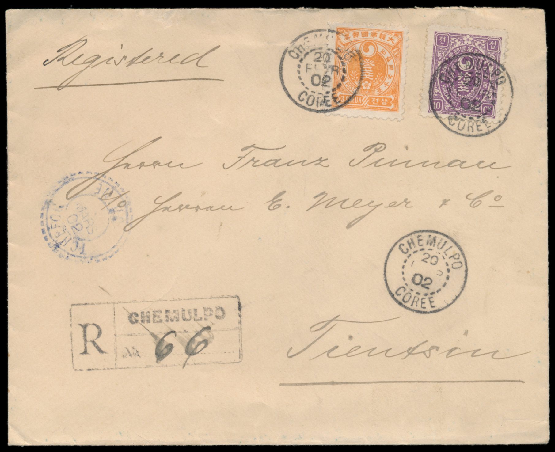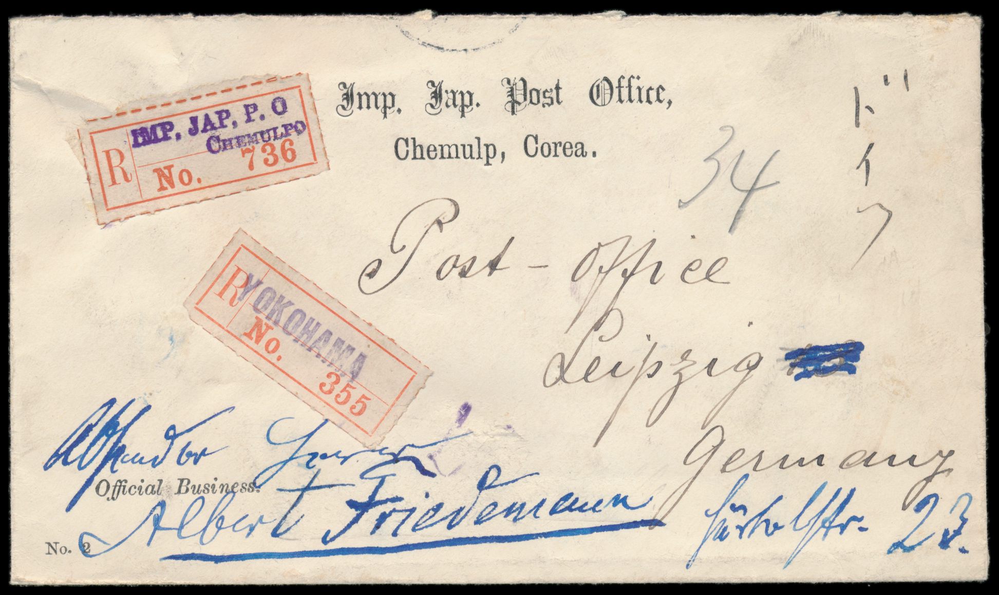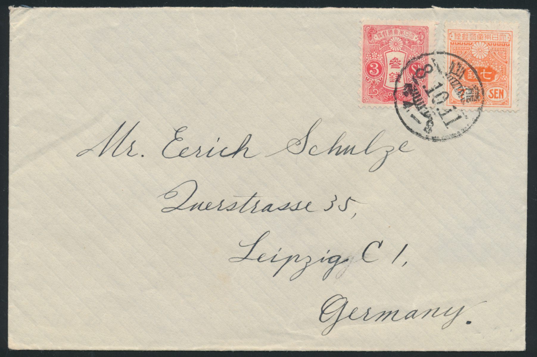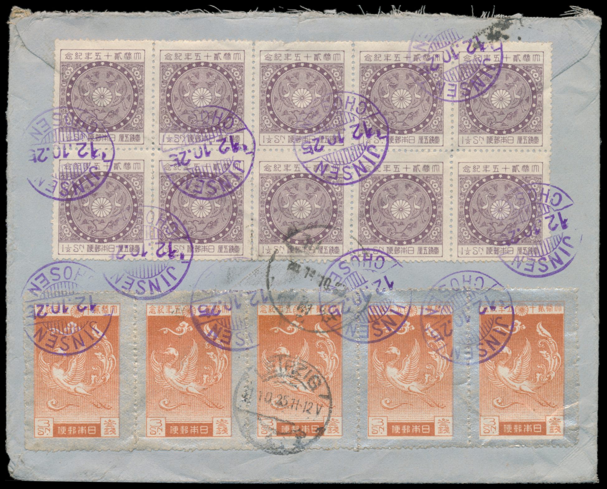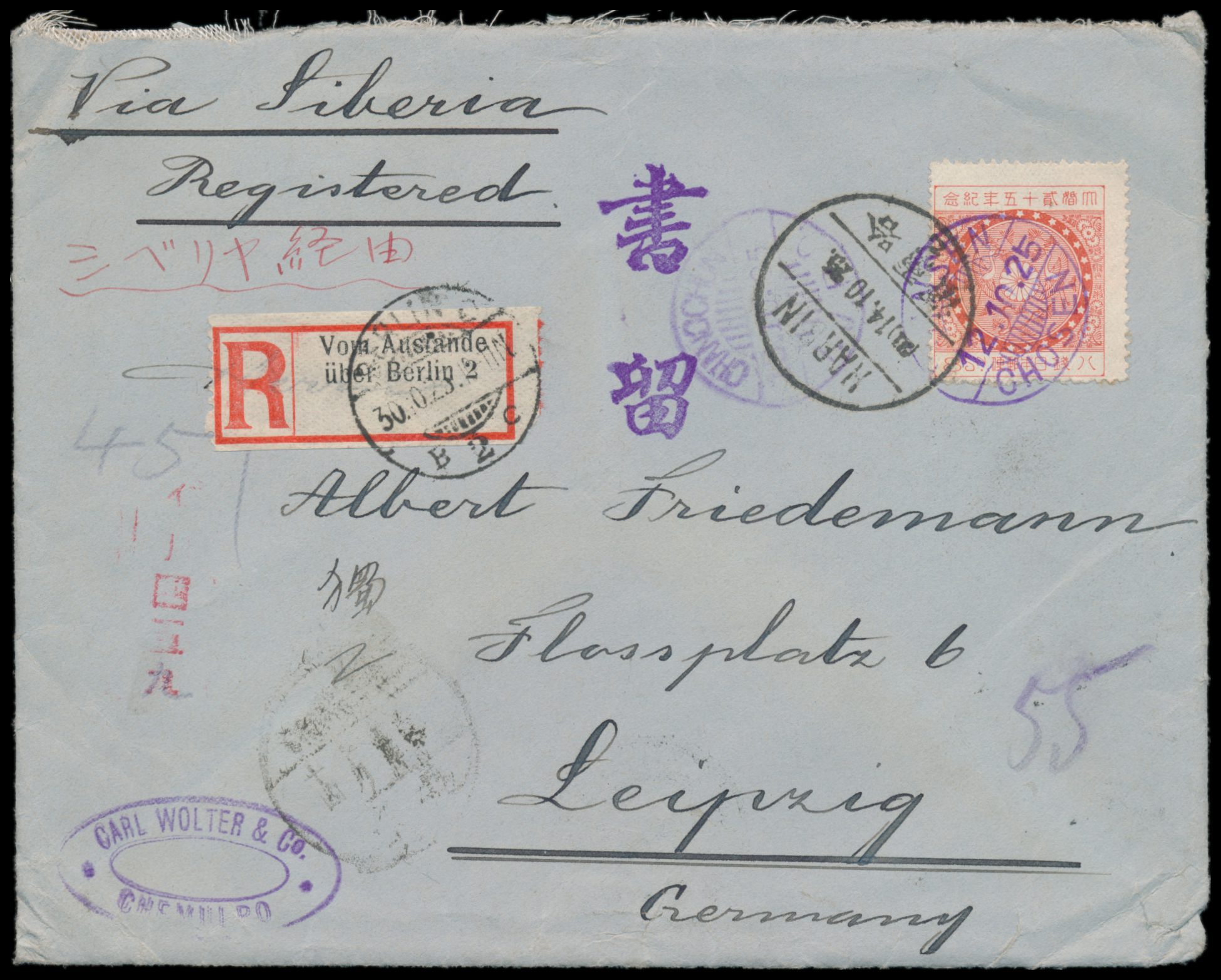 Silberhochzeit des Kaiser Yoshihito : Japan 1 1/2 S. im Zehnerblock und 3 S. im Fünferstreifen rückseitig und 8 S. vorderseitig auf Einschreibbrief mit violettem Kammstempel Jinsen / Chosen 12.10.25 nach Deutschland, japanischer R-Stempel, Durchgangsstempel Changchun und Harbin, R-Zettel "Vom Auslande über Berlin C 2" und Stempel Berlin C 2 30.10.25, Ankunftstempel Leipzig 31.10.25, Bedarf