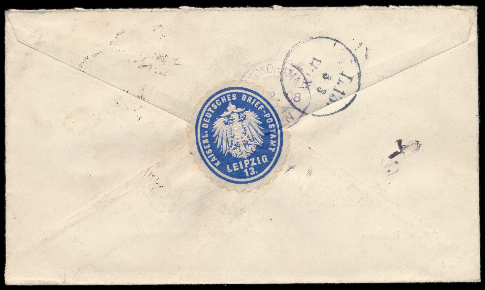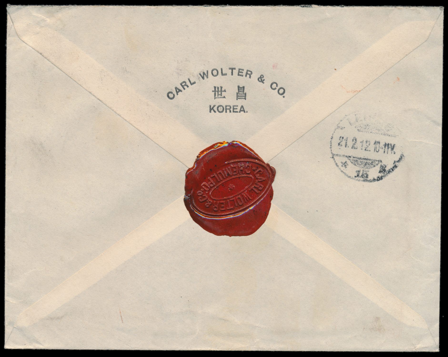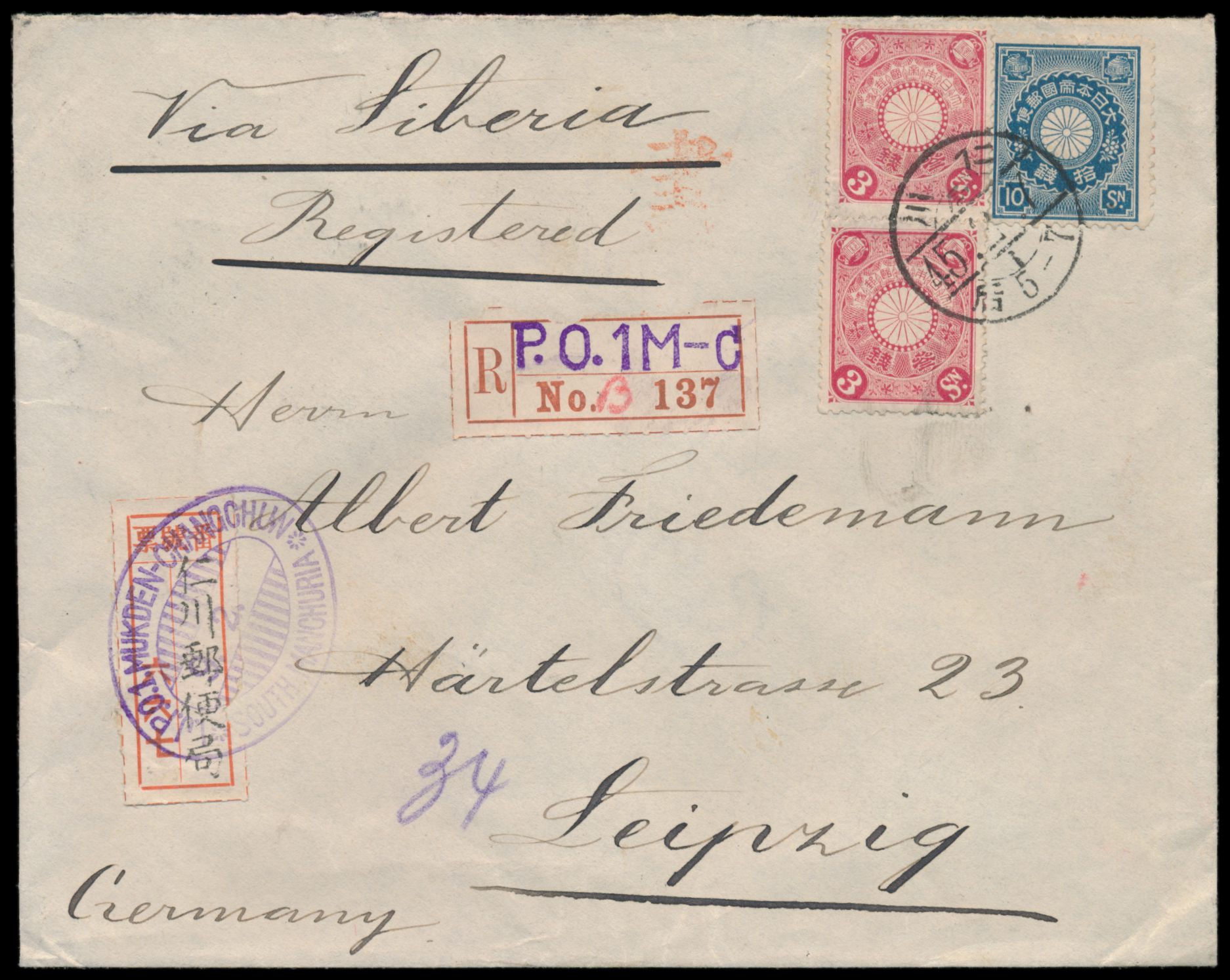 Japanische Post, Kiku-Serie 2 x 3 Sen und 10 Sen auf Einschreibbrief mit Stempel Incheon 7.2.45 (1912) nach Deutschland, violetter Bahnpost-Ovalstempel P.O. 1 Mukden - Changchun / South Manchuria 9.2. und zugehöriger Bahnpost-R-Zettel mit L1 "P.O. 1 M-C" , Ankunftstempel Leipzig 21.2.12