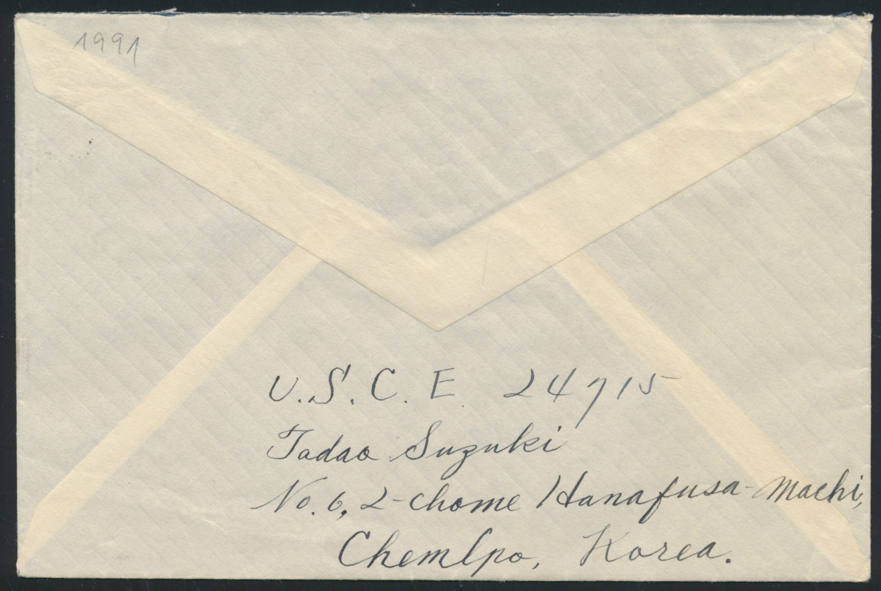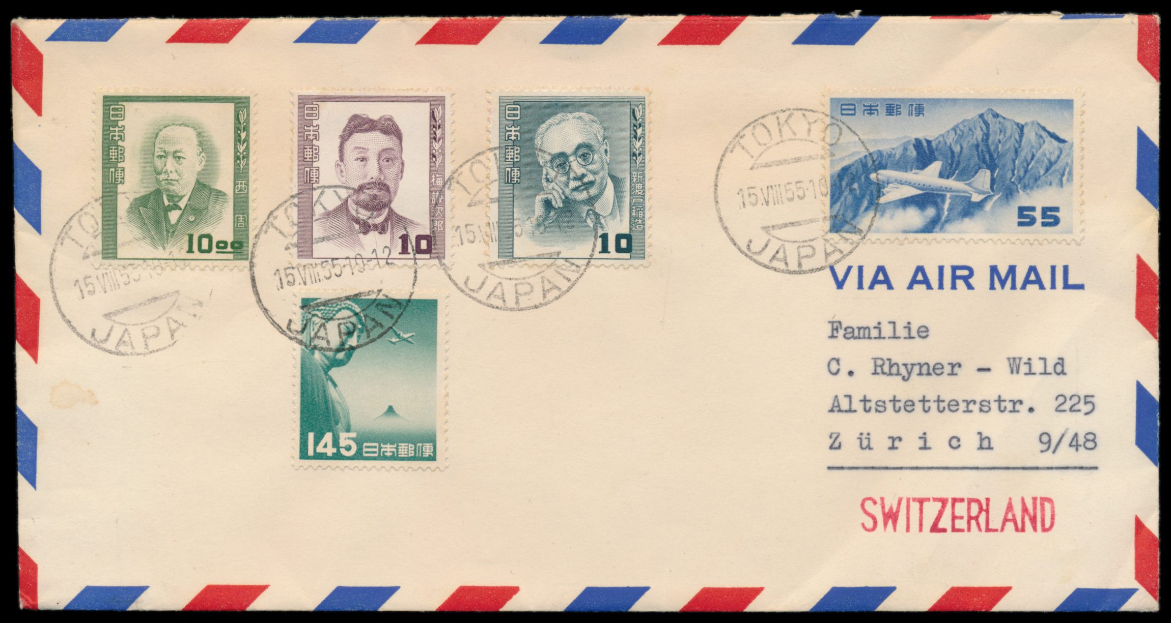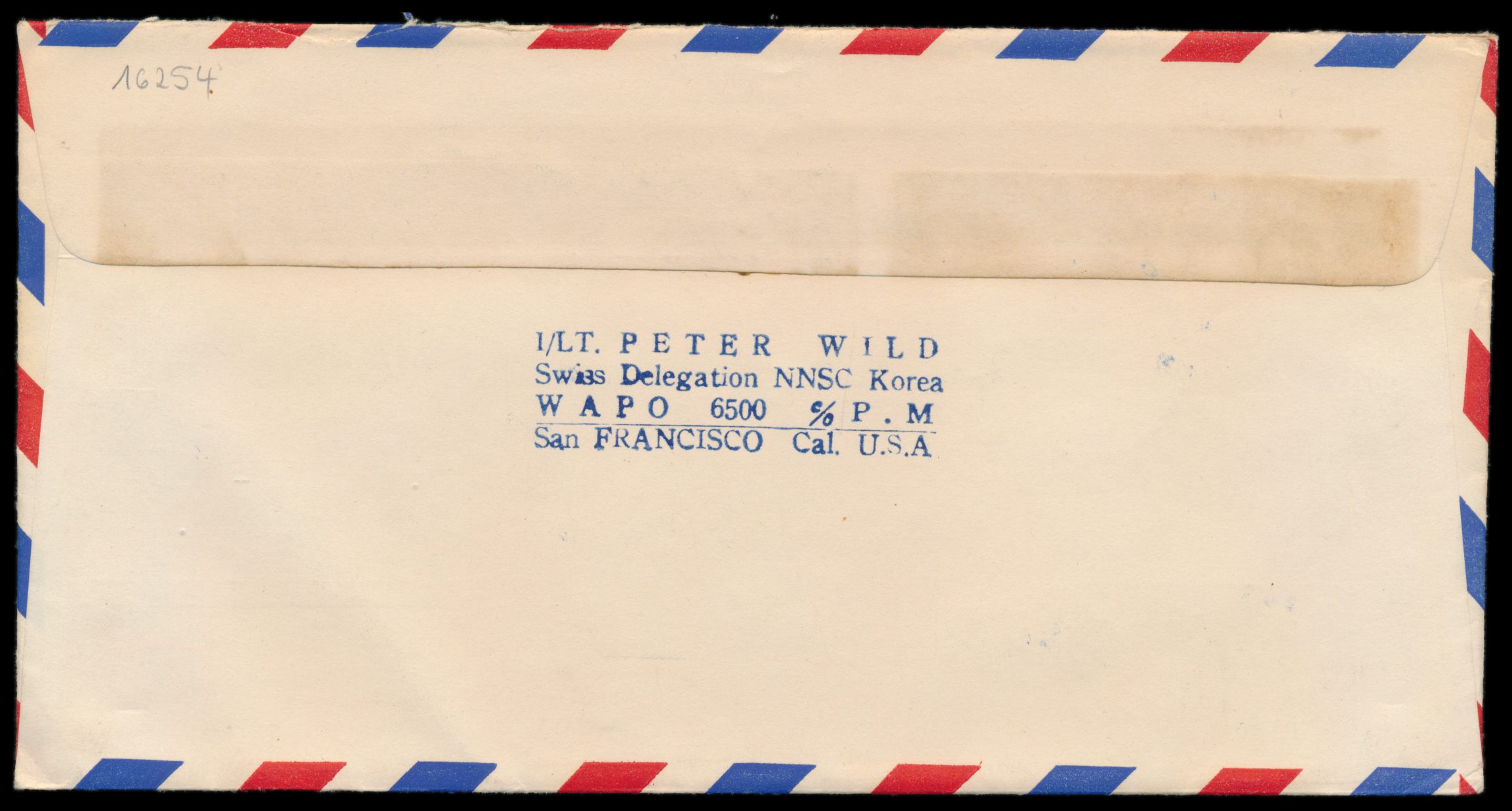 Neutrale Überwachungskommission für den Waffenstillstand in Korea (seit 1953): Luftpostbrief mit Japan-Frankatur nach Zürich, Stempel Tokyo 15.8.55, rückseitig Absenderstempel "1/Lt. Peter Wild / Swiss Delegation NNSC Korea / WAPO 6500 c/o P.M. San Francisco, Cal. U.S.A."