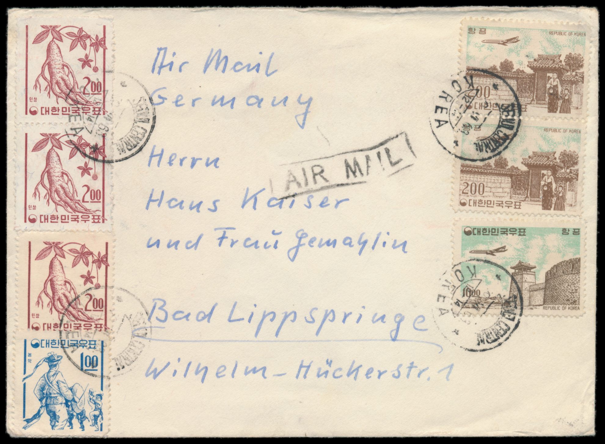 Südkorea, 1 W., 3 x 2 W. 10 W. Flugpost und 2 x 200 H. auf Luftpostbrief mit Stempel Seoul Central 9.6.63 nach Deutschland, Absender "Oberstleutnant Sagner ...", seit Militärattaché an der deutschen Botschaft in Seoul und später Mitbegründer der Deutsch-Koreanischen Gesellschaft