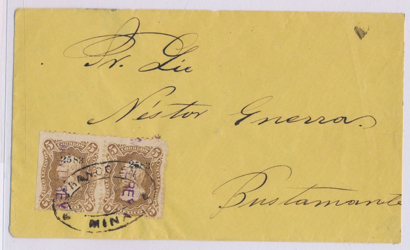 2 x 5 C. Hidalgo (1874) im Paar (linke Marke links geschnitten) mit violettem Aufdruck Monterey und schwarzer Nr. 2583 auf Brief nach Bustamante, schwarzer Ovalstempel Franco en Mina